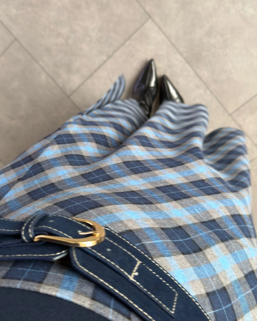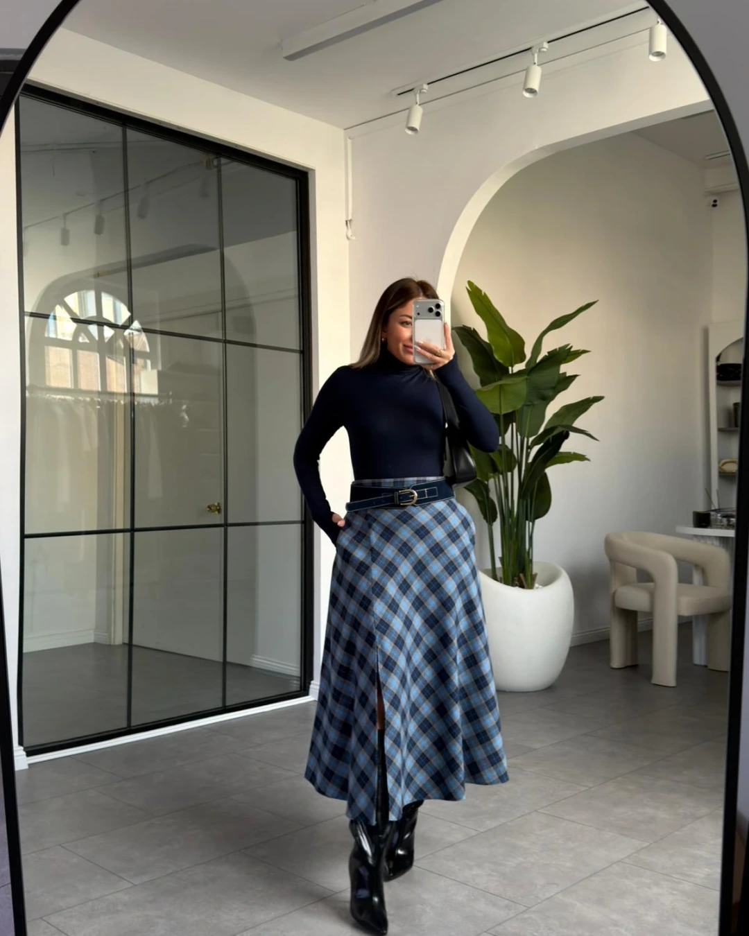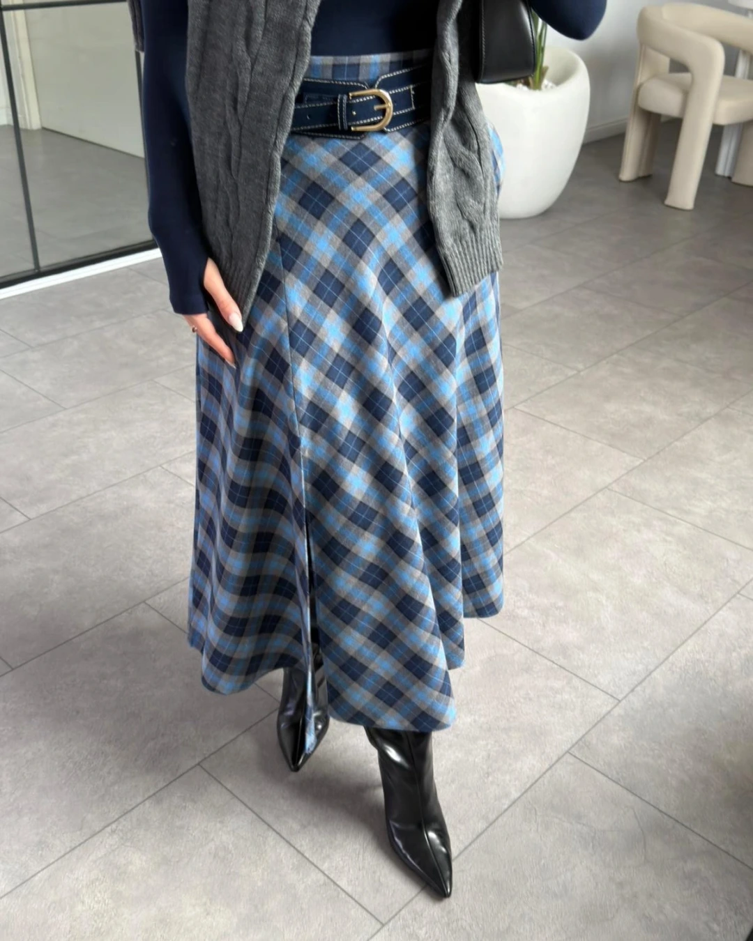 LACİVERT YIRTMAÇ DETAY KEMERLİ EKOSE ETEK
