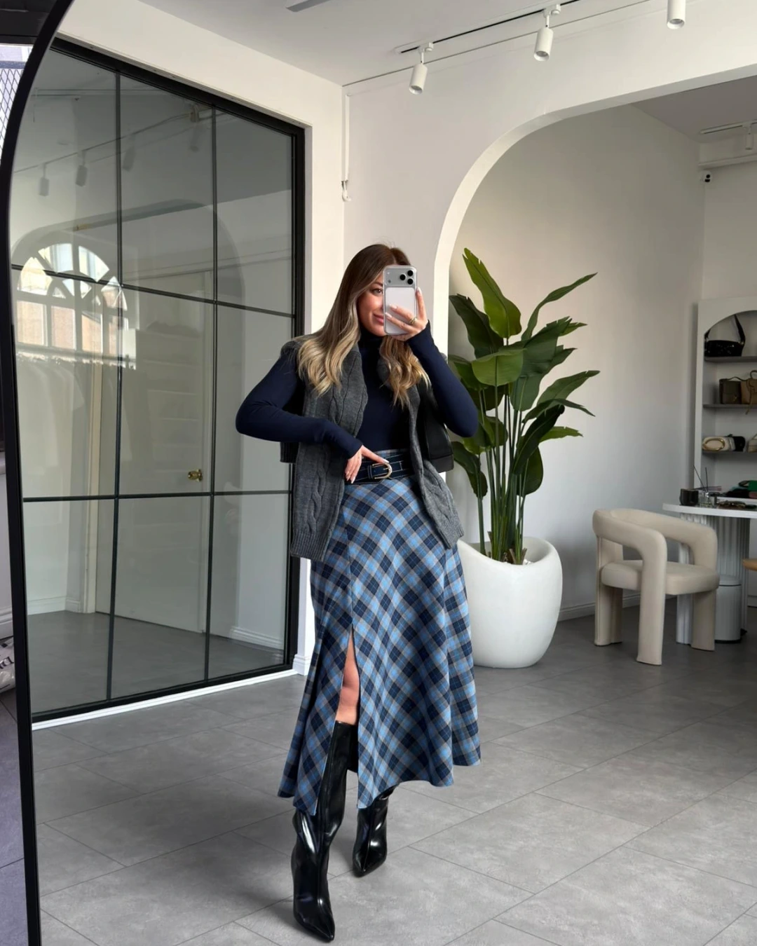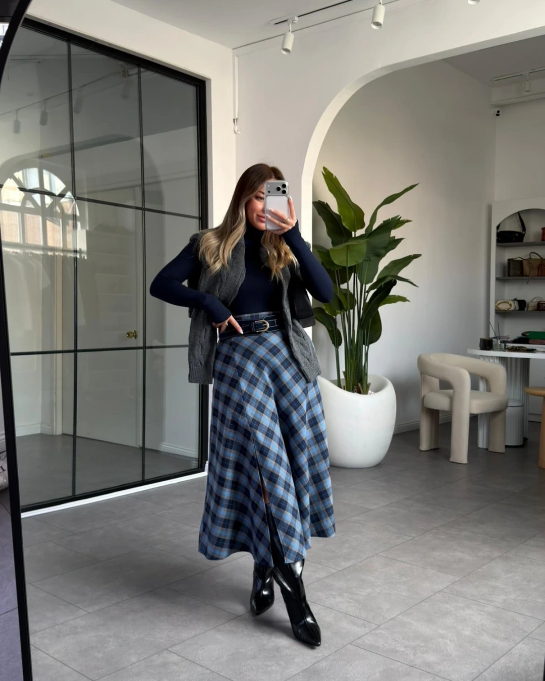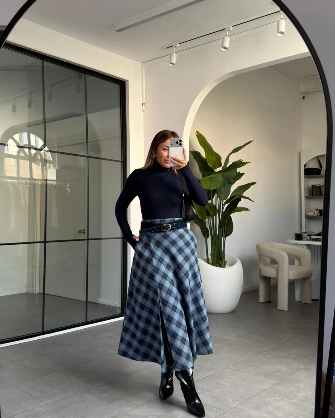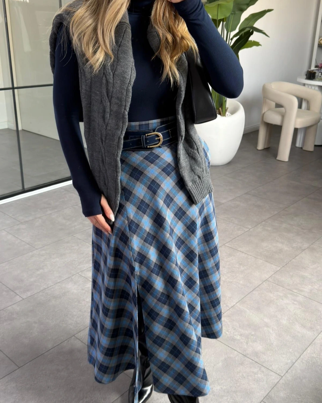 LACİVERT YIRTMAÇ DETAY KEMERLİ EKOSE ETEK