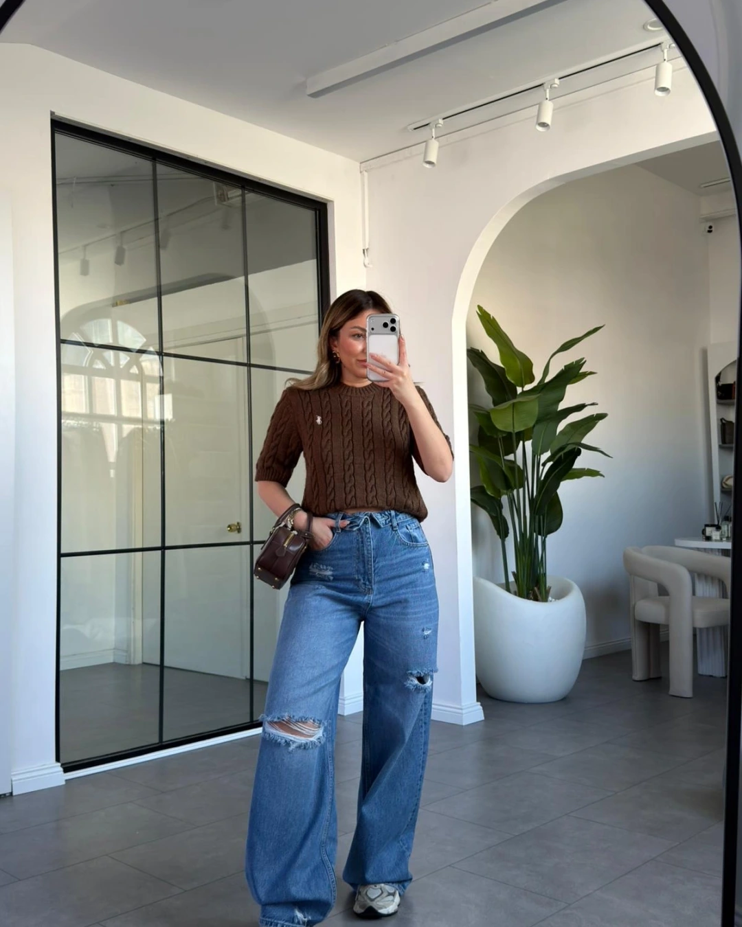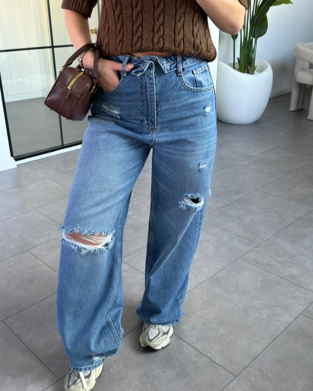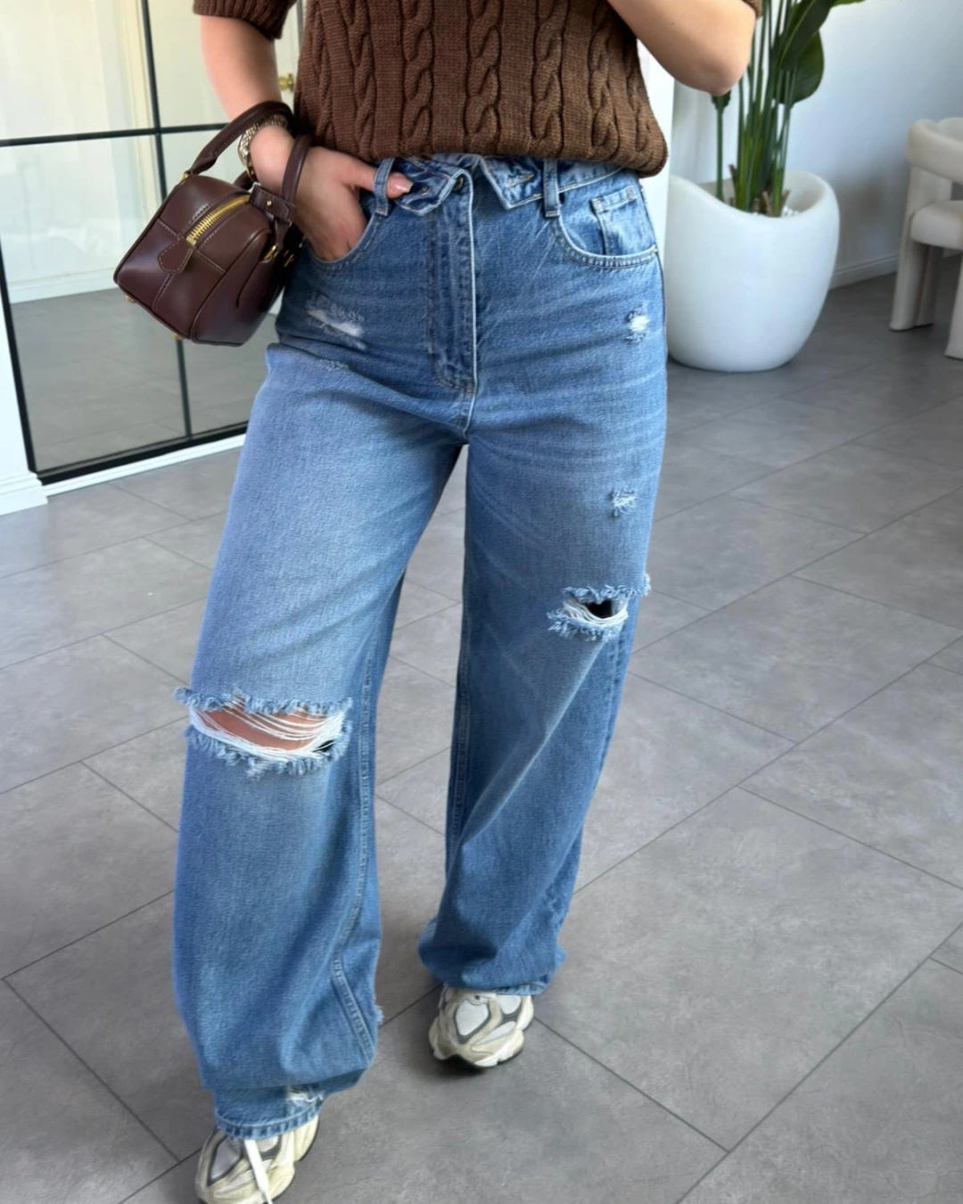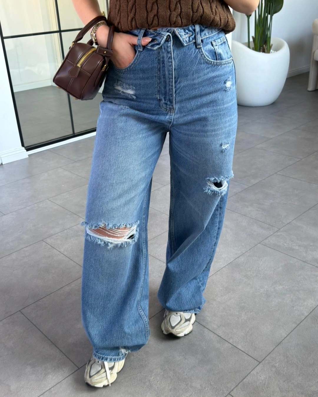 MAVİ BEL DETAYLI YIRTIK WIDE LEG JEAN 8185