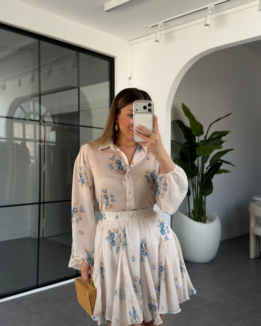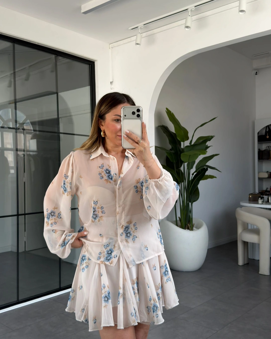 MAVİ ÇİÇEKLİ ŞİFON GÖMLEK ETEK TAKIM