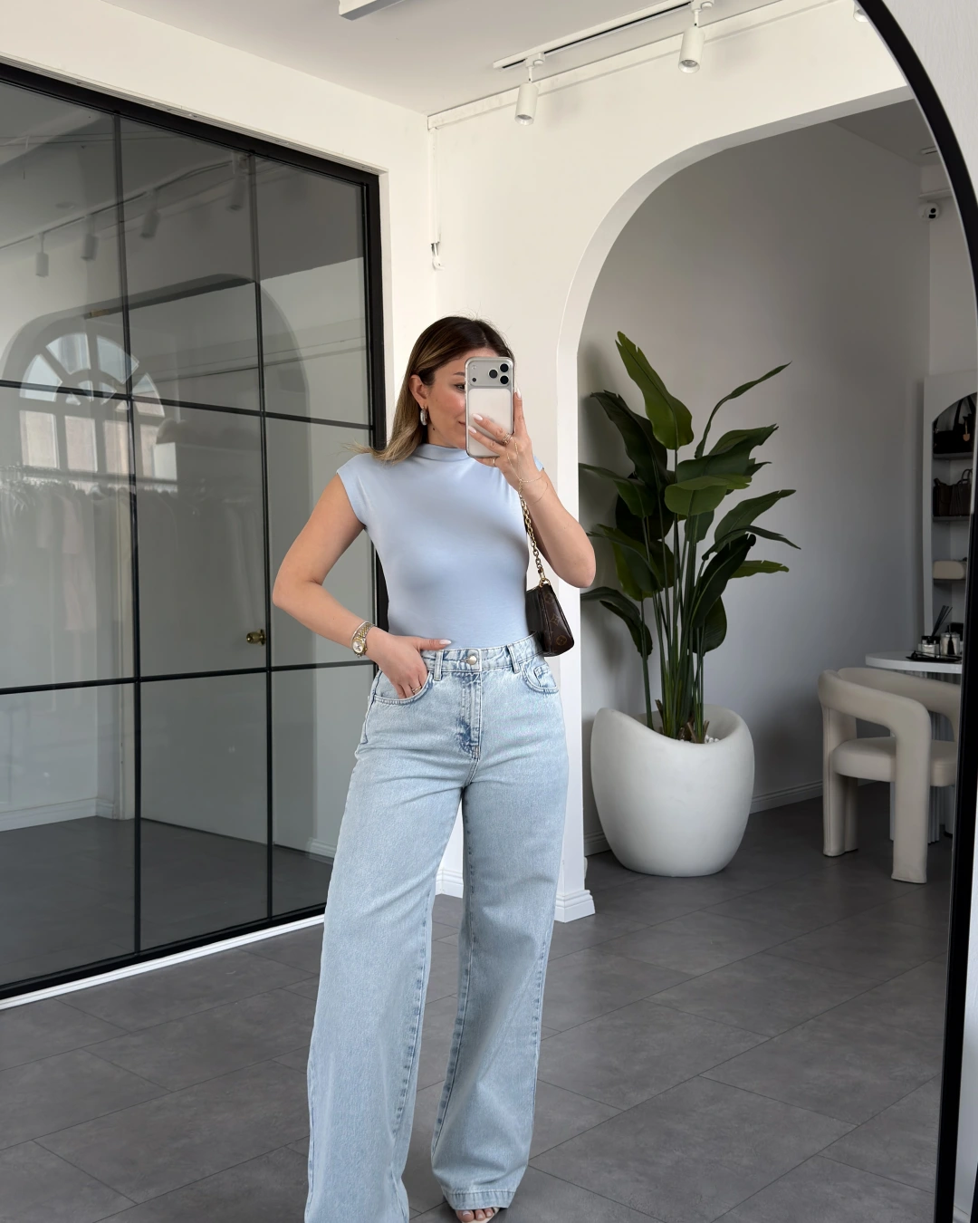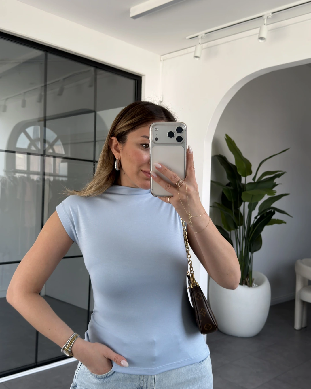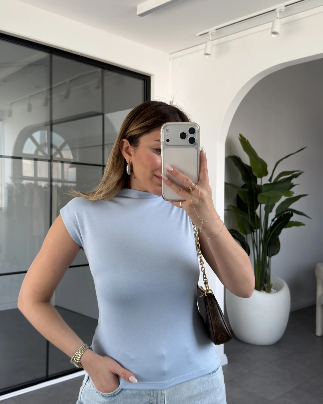 MAVİ DİK YAKA ESNEK BLUZ