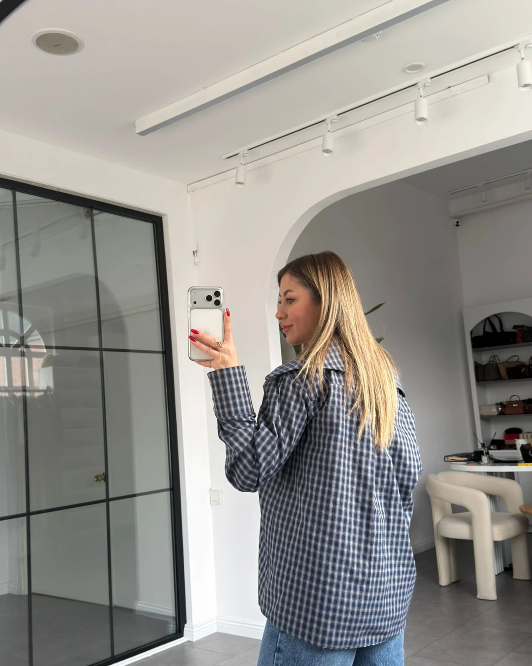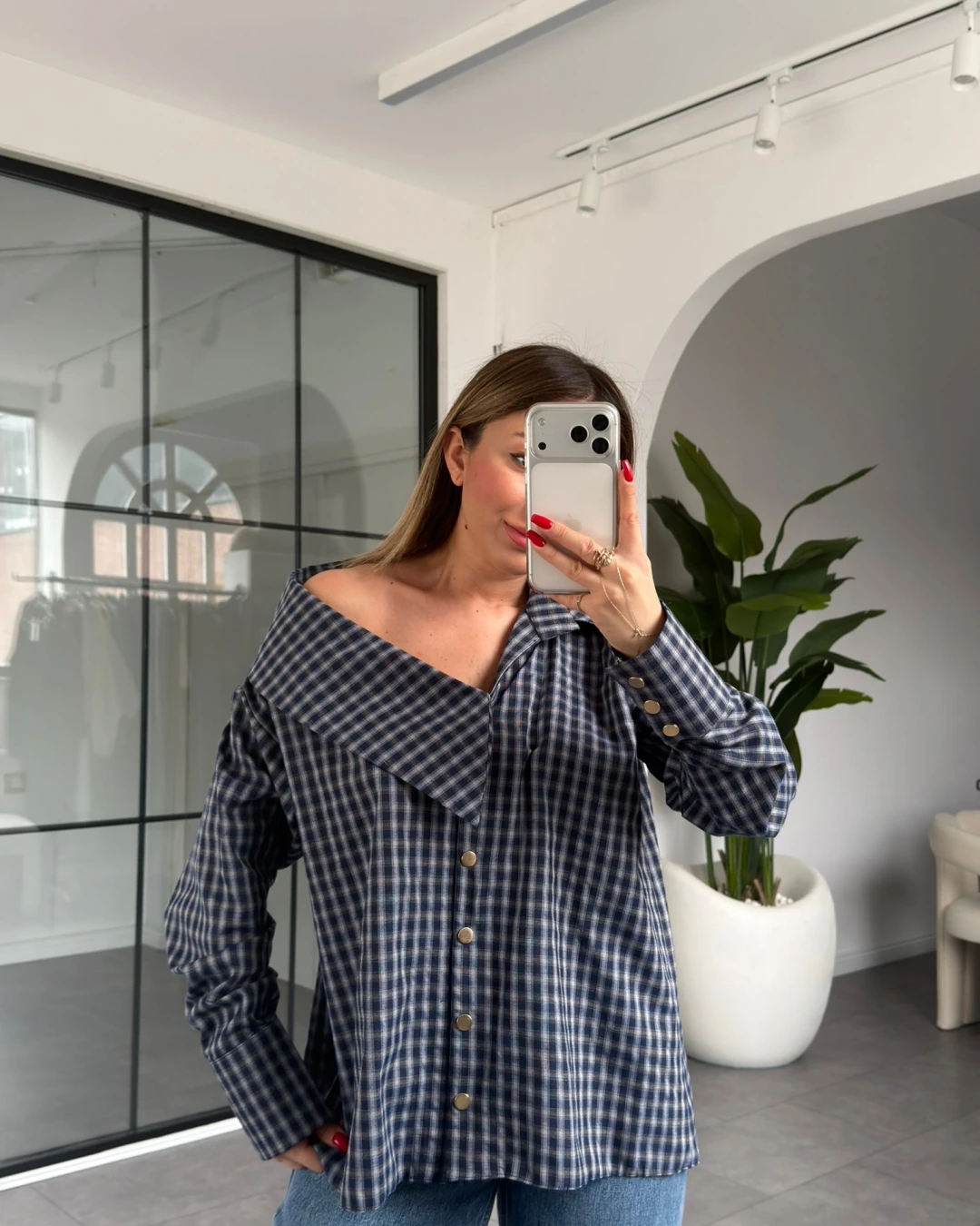 MAVİ EKOSE DESEN ASİMETRİK YAKA GÖMLEK
