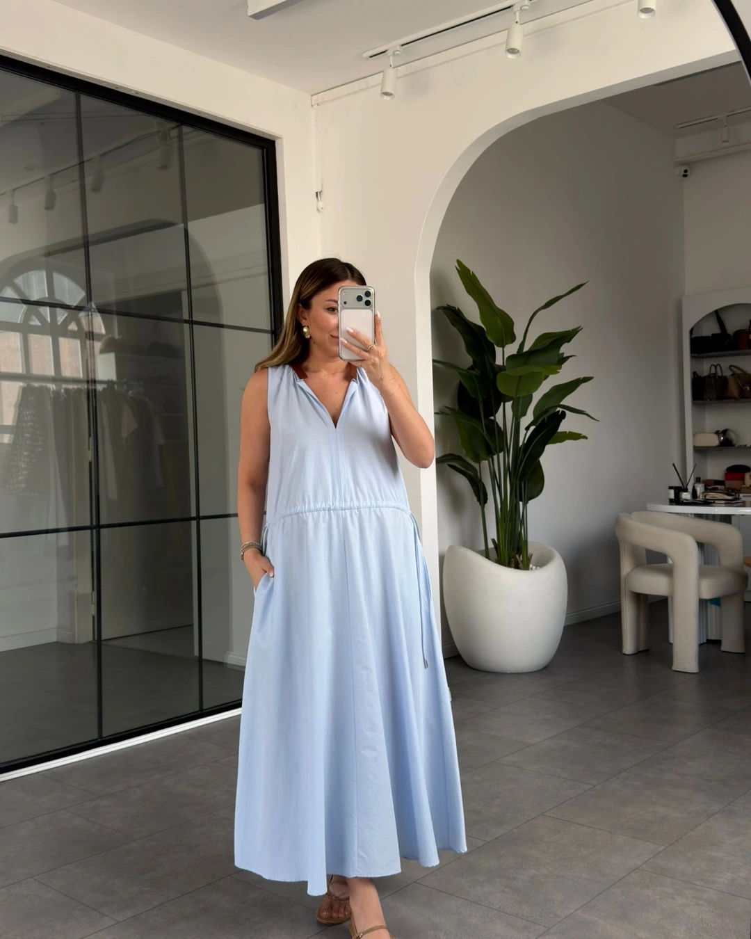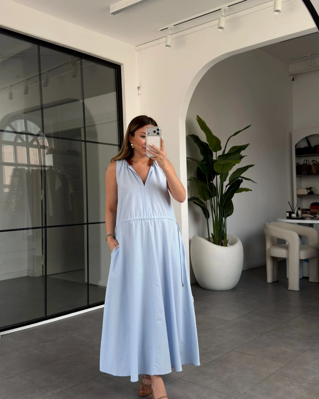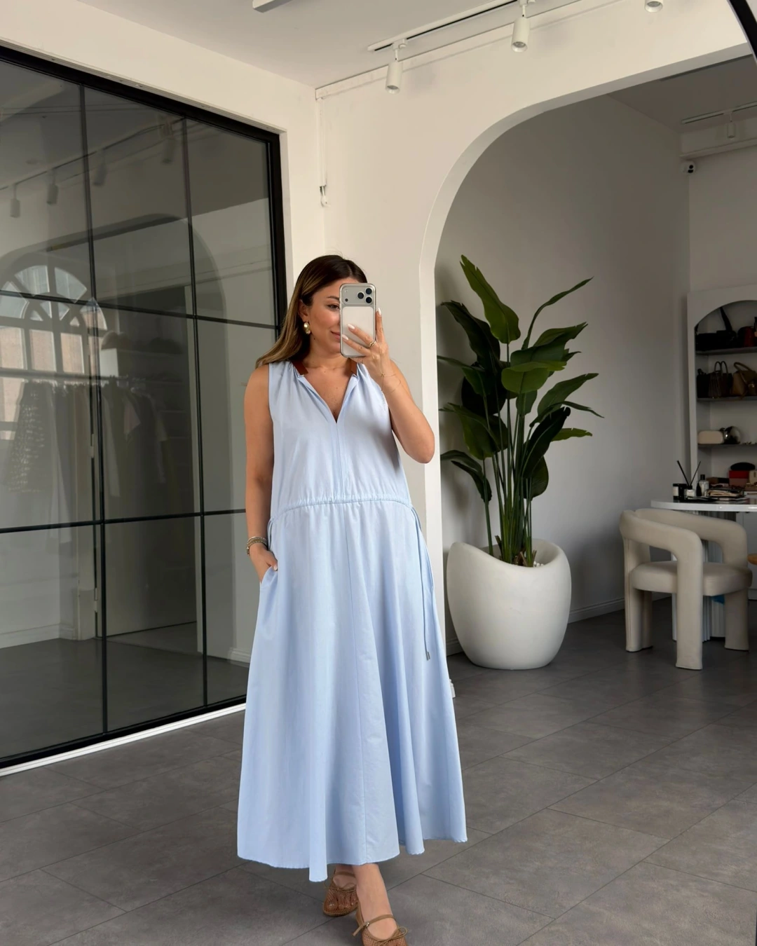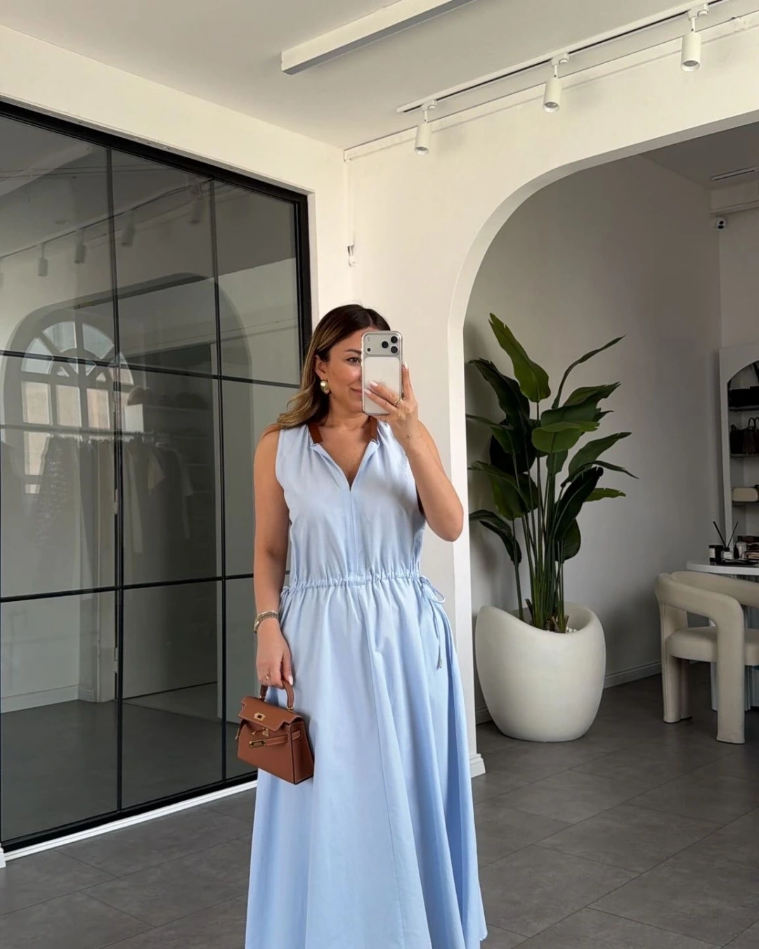 MAVİ YAKASI DERİ DETAYLI BELİ BÜZGÜLÜ ELBİSE 3938