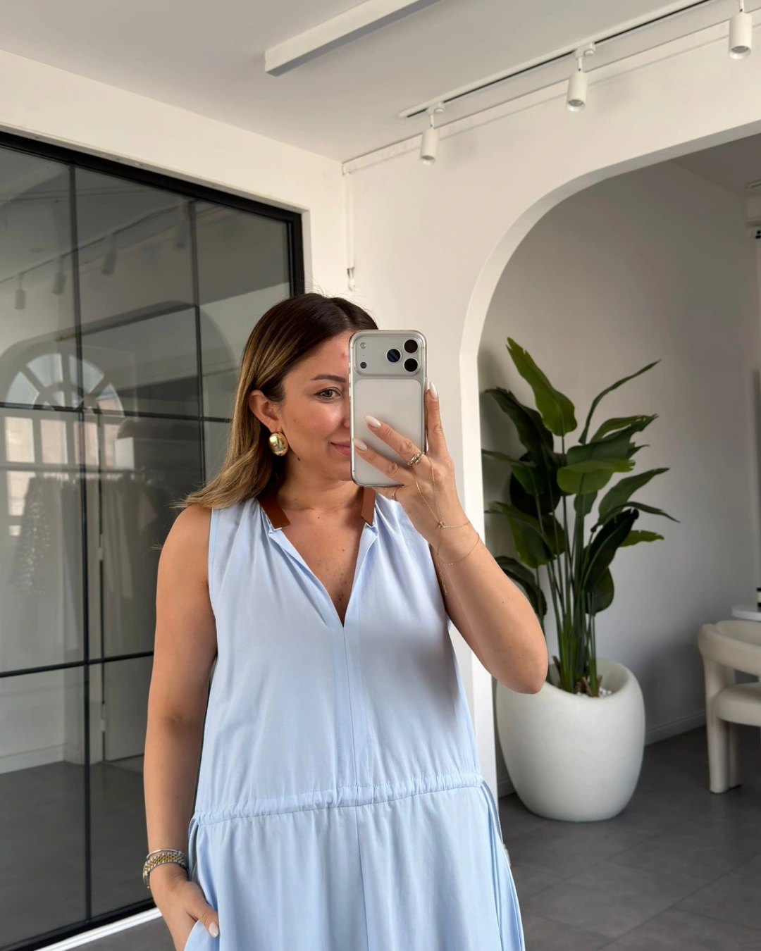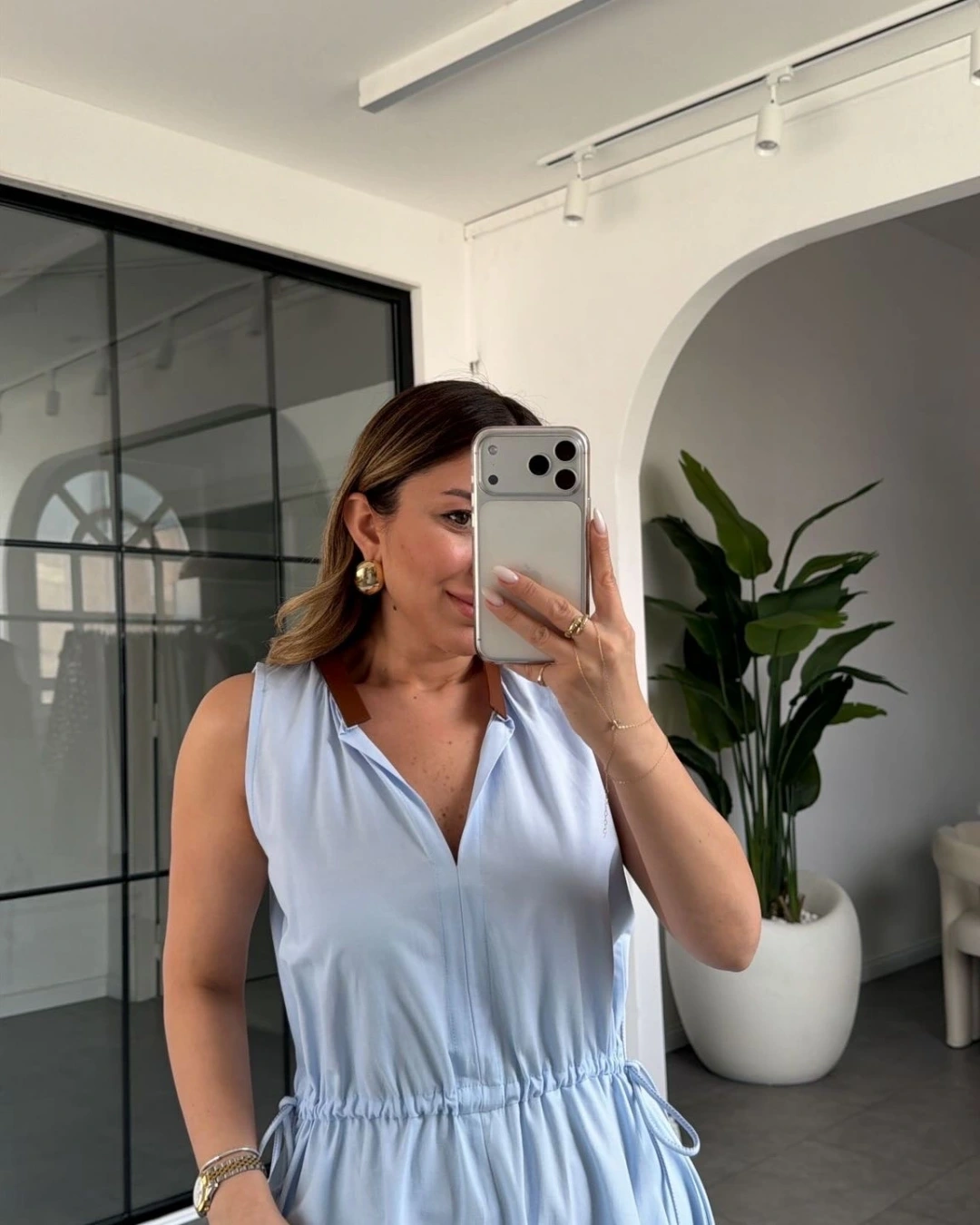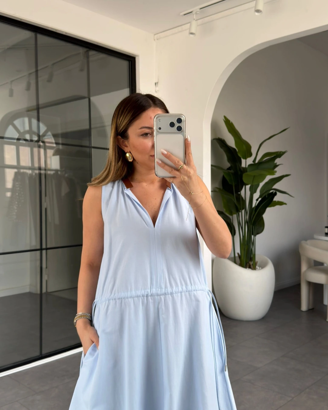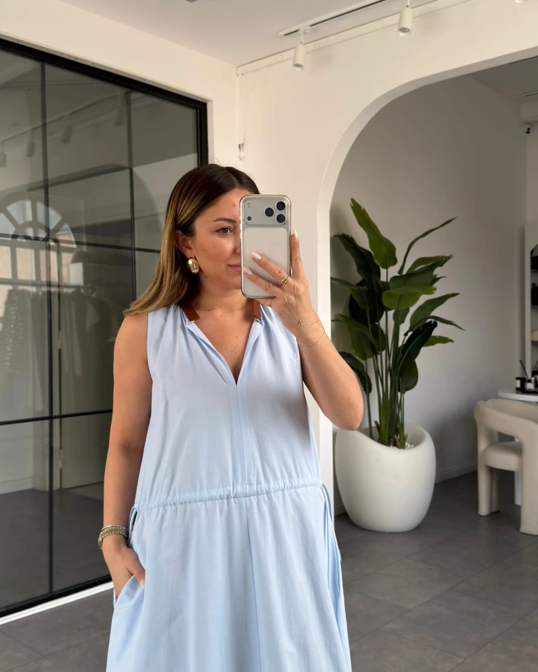 MAVİ YAKASI DERİ DETAYLI BELİ BÜZGÜLÜ ELBİSE 3938