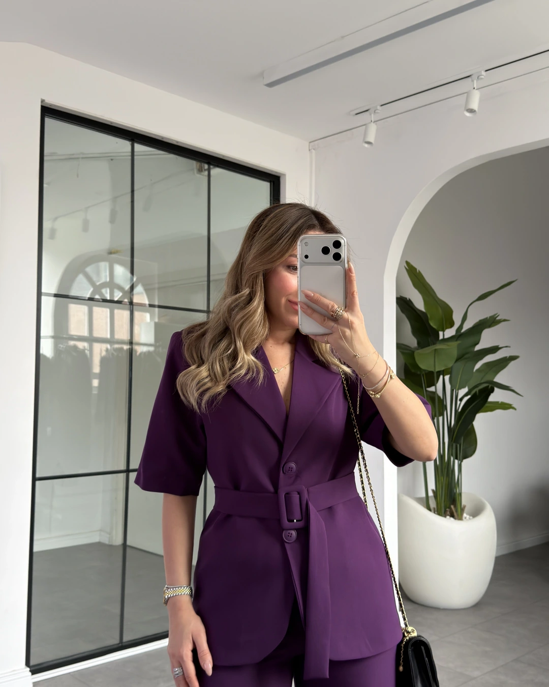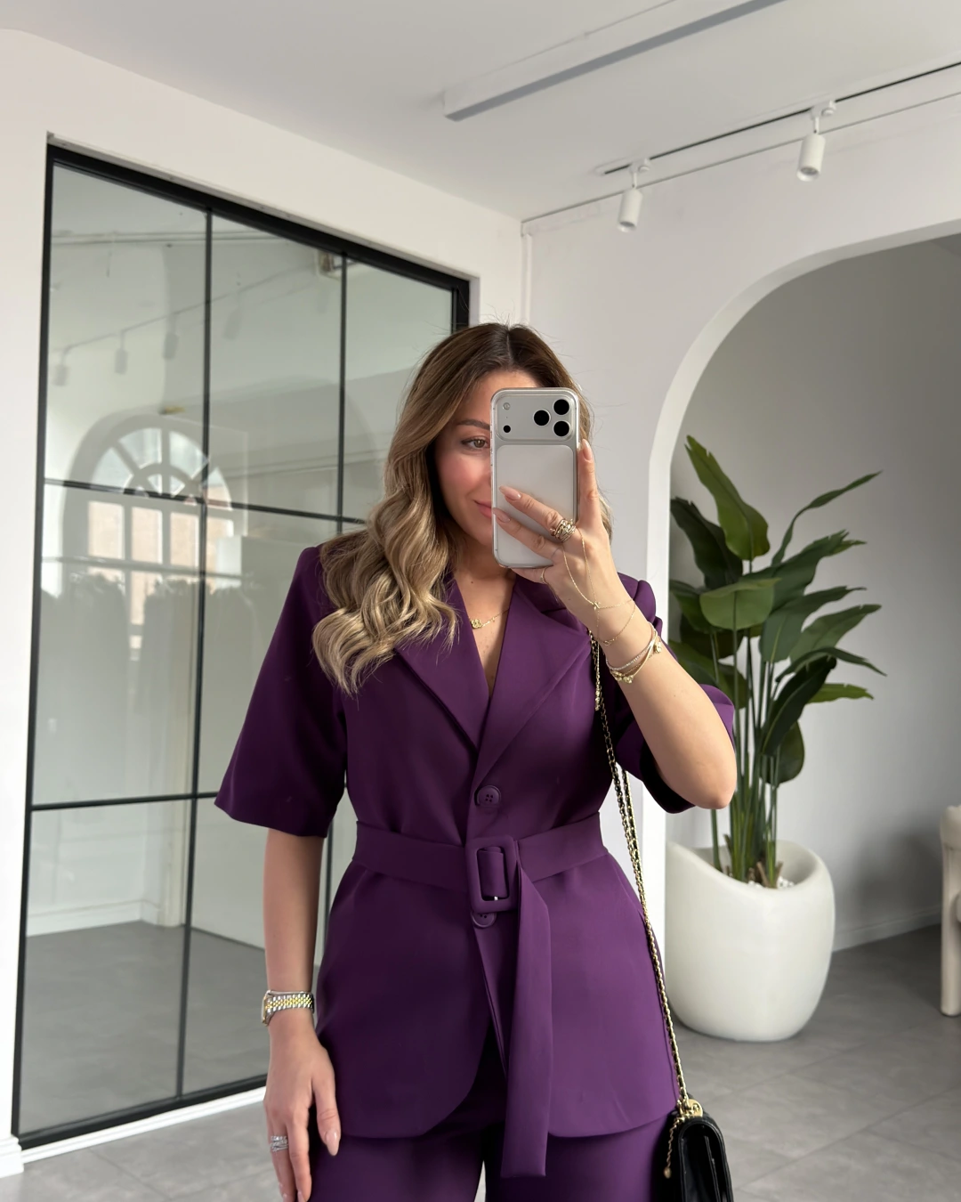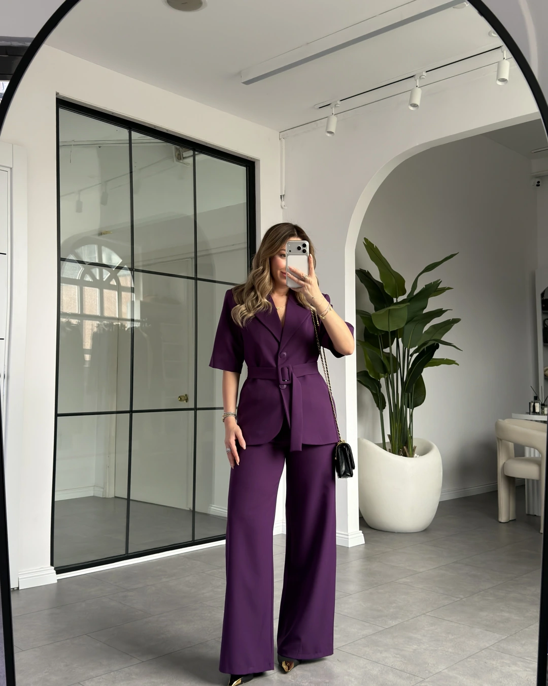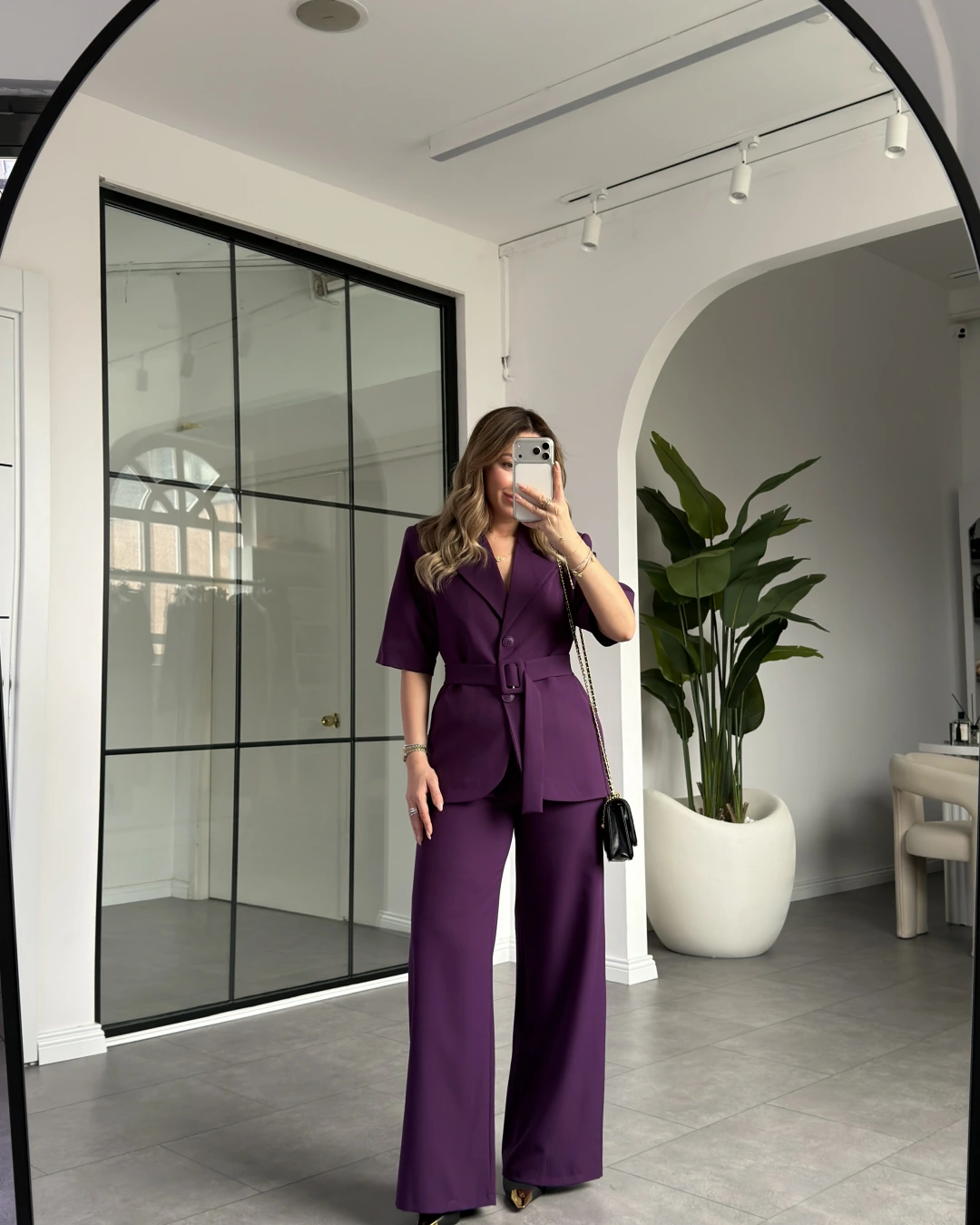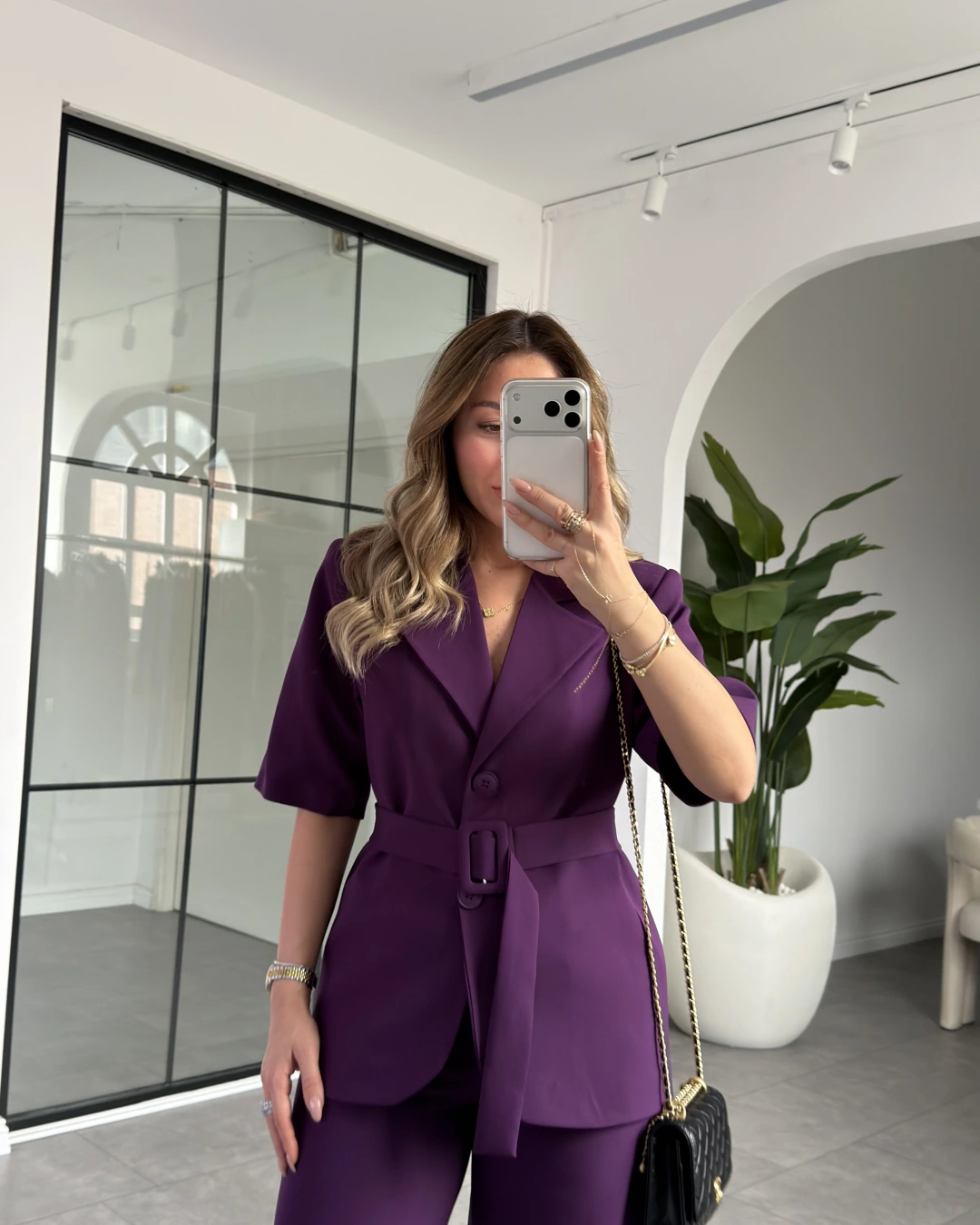 MOR KISA KOL CEKET KEMERLİ PANTOLON TAKIM