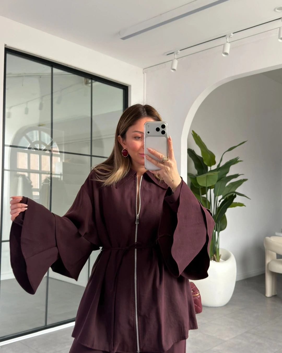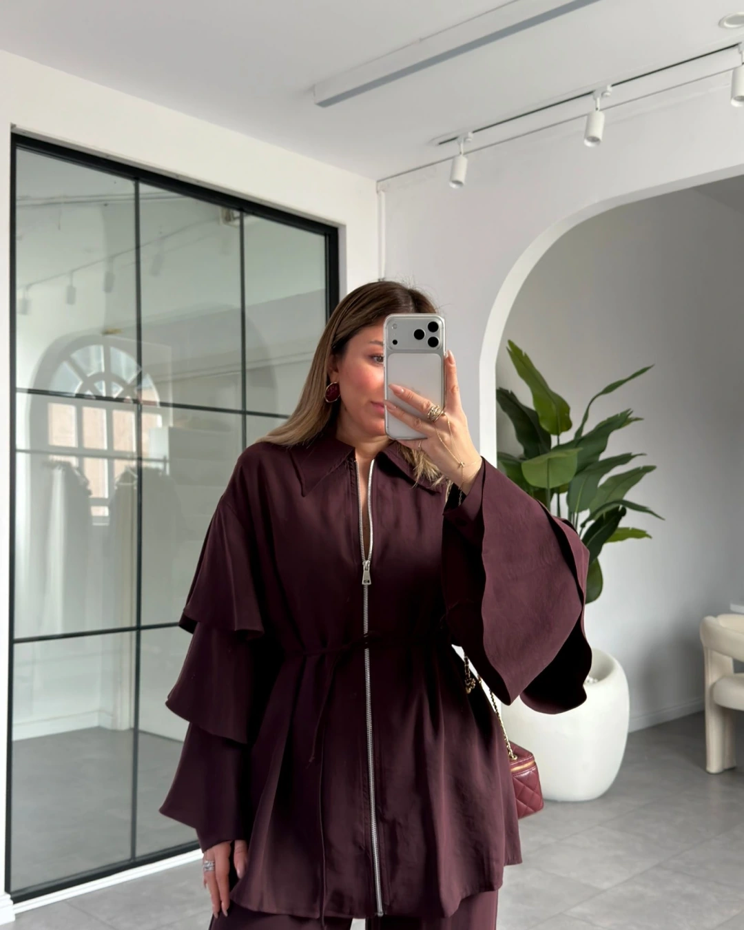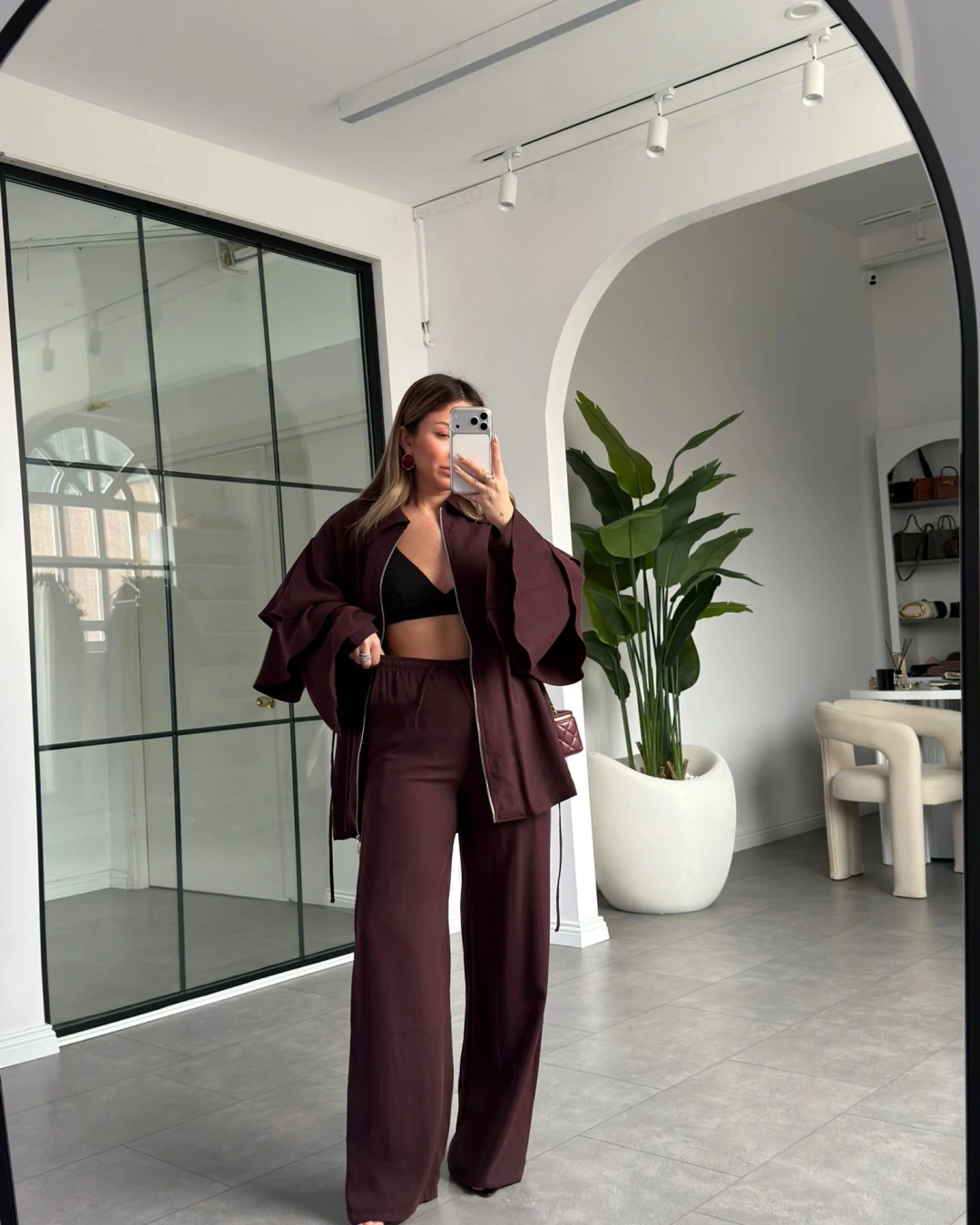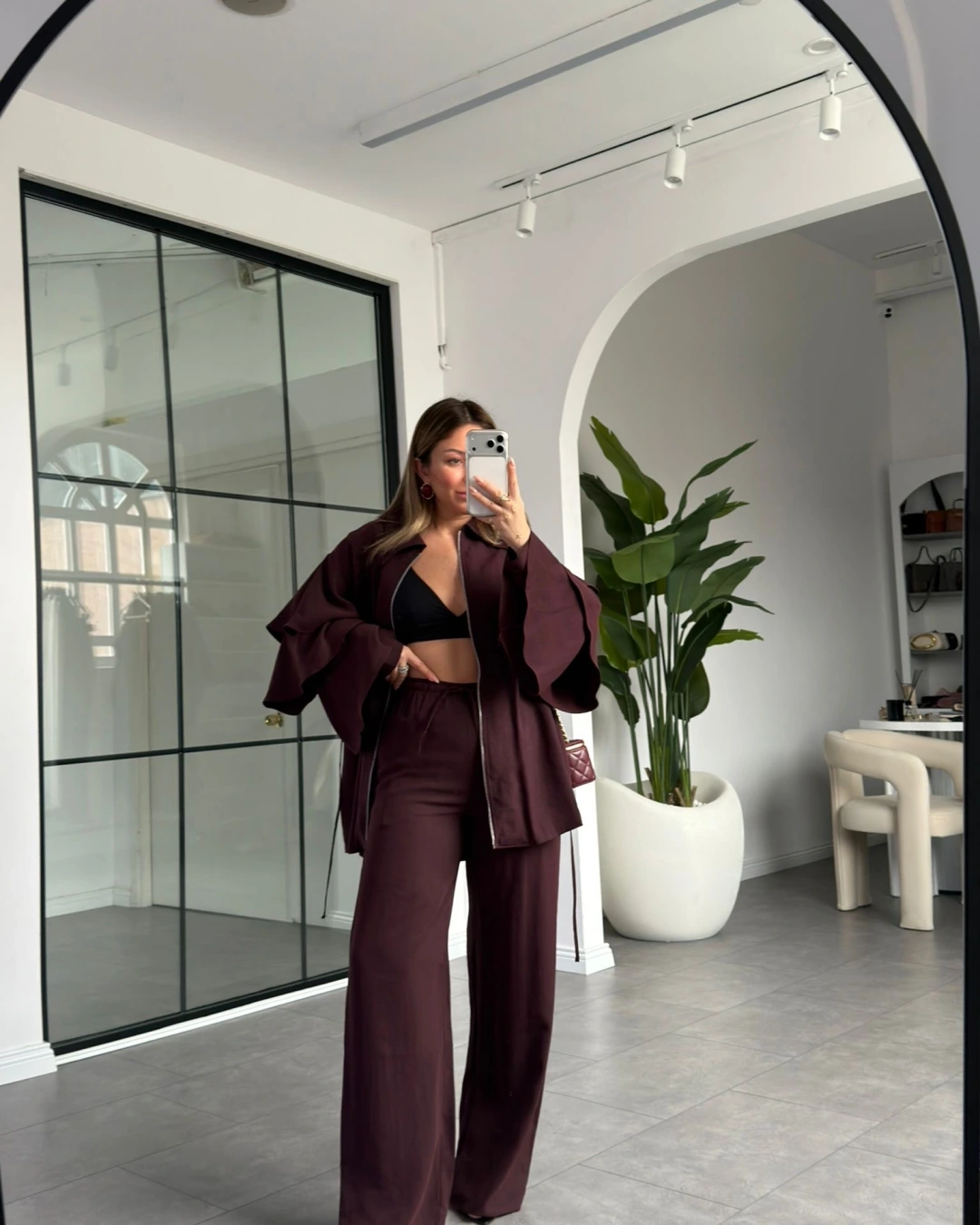 MÜRDÜM KOLLARI VOLANLI BLUZ PANTOLON TAKIM