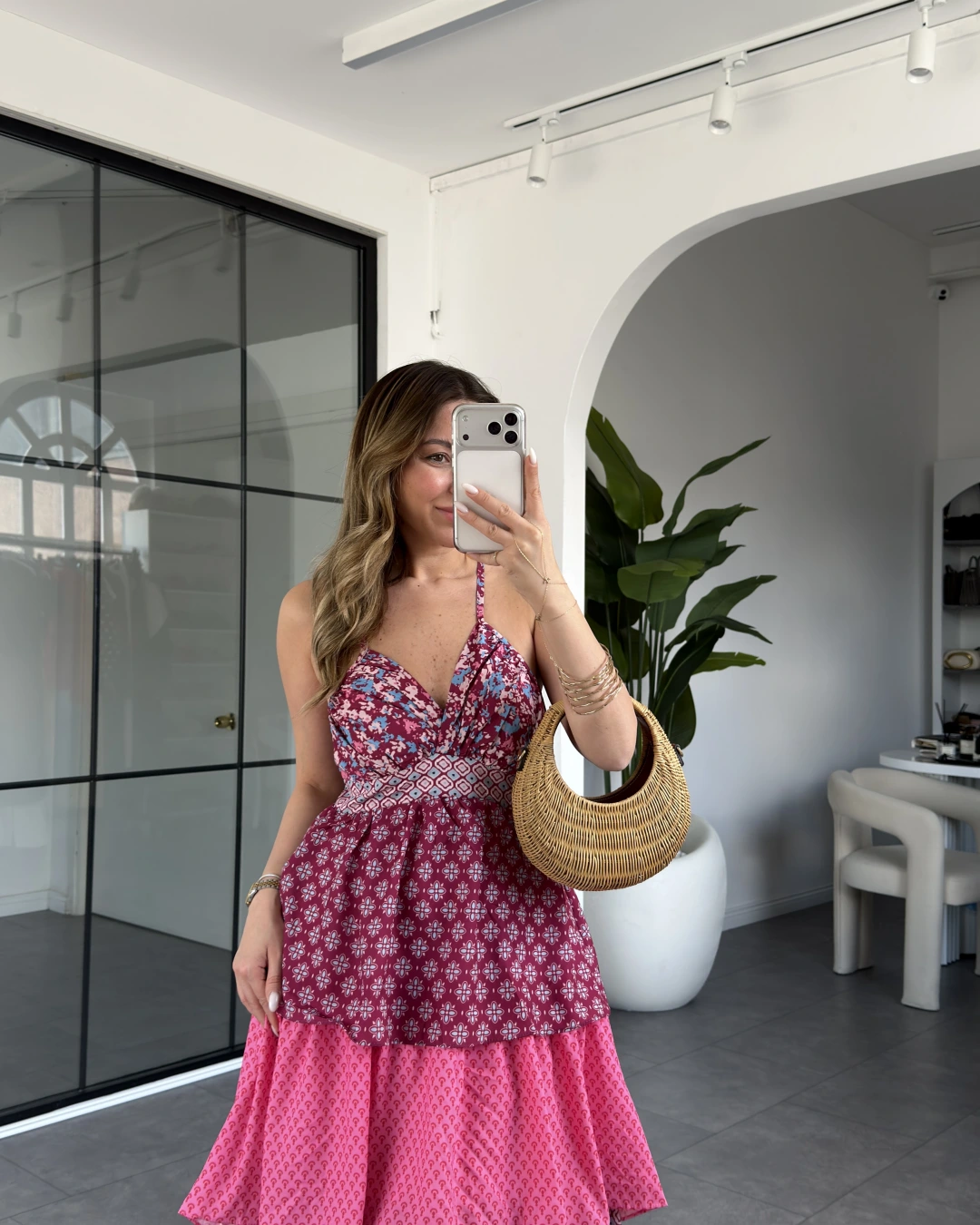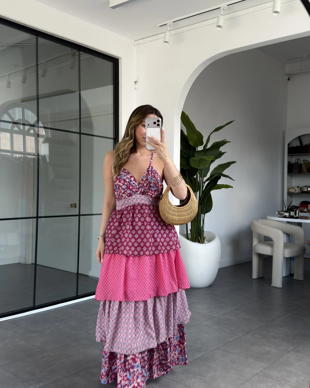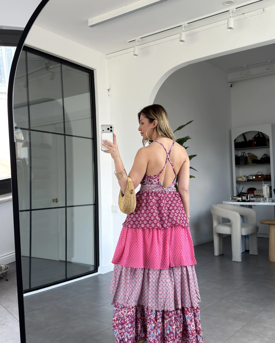 PEMBE ÇİÇEK DESEN KAT KAT ELBİSE 6765