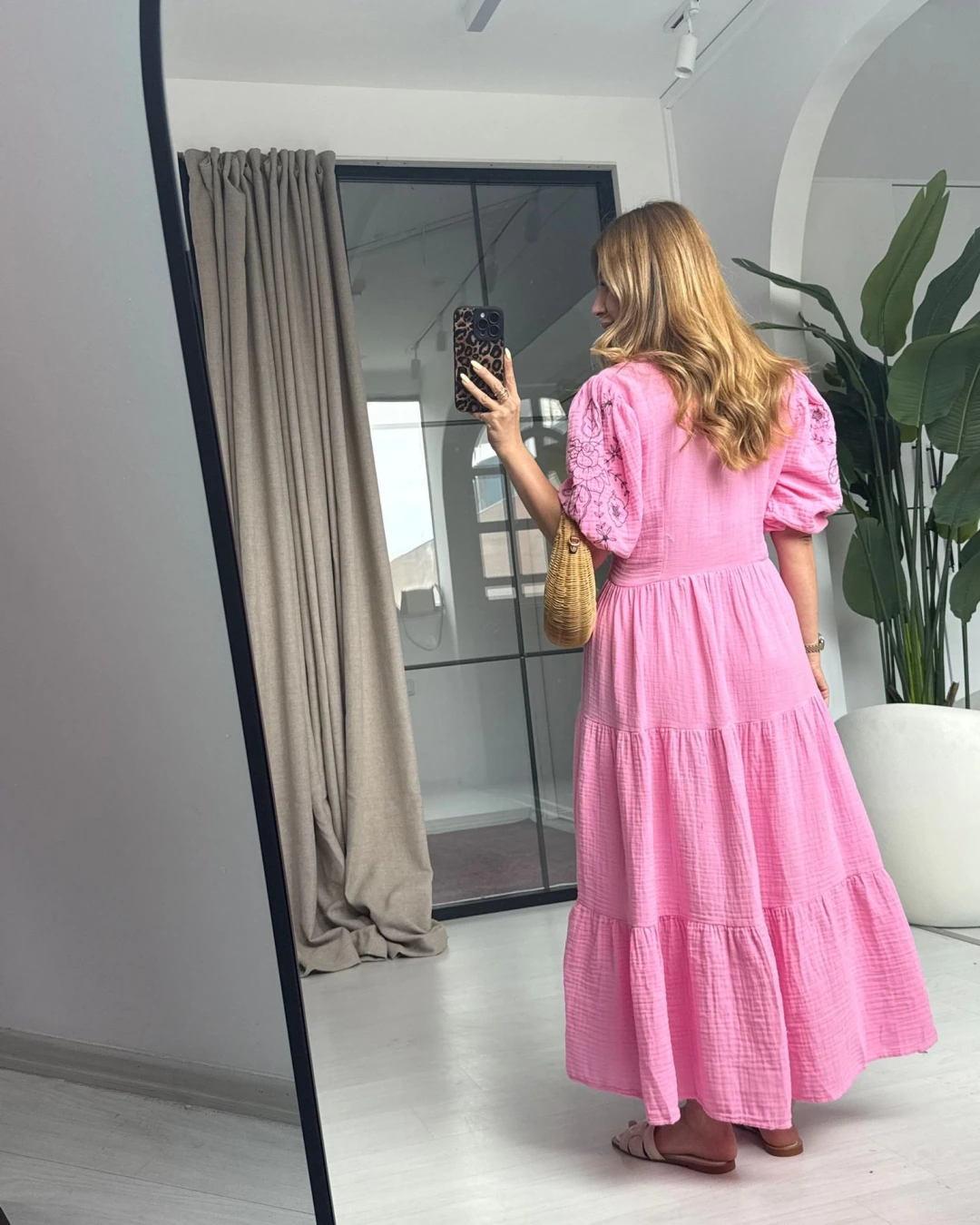 PEMBE NAKIŞLI BAĞLAMALI ELBİSE
