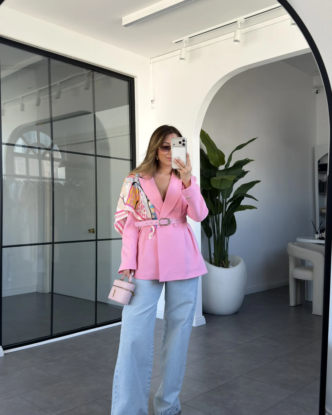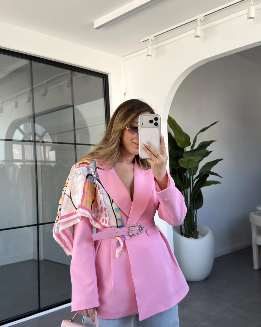 PEMBE ŞAL DETAYLI KEMERLİ CEKET 6337