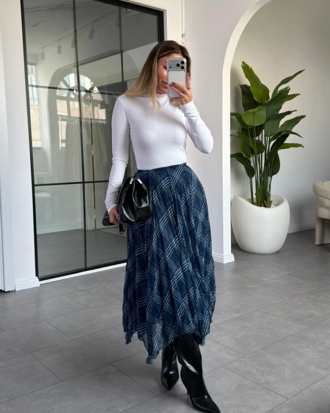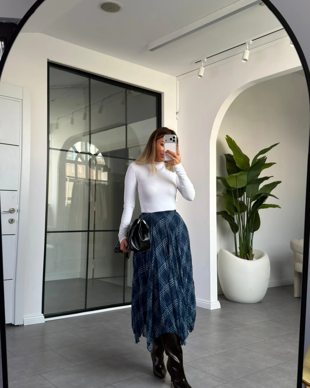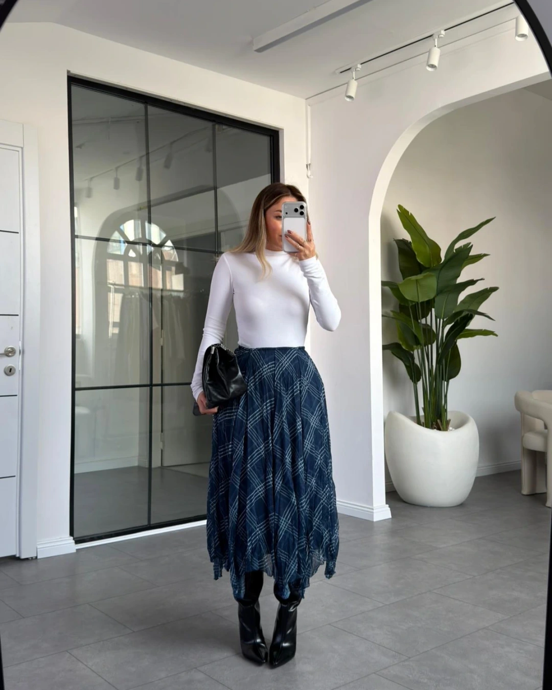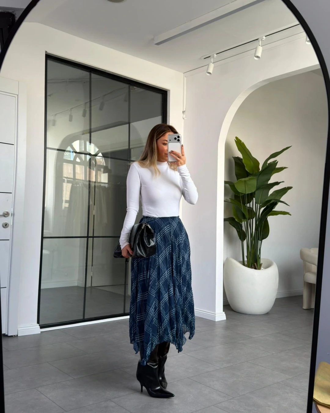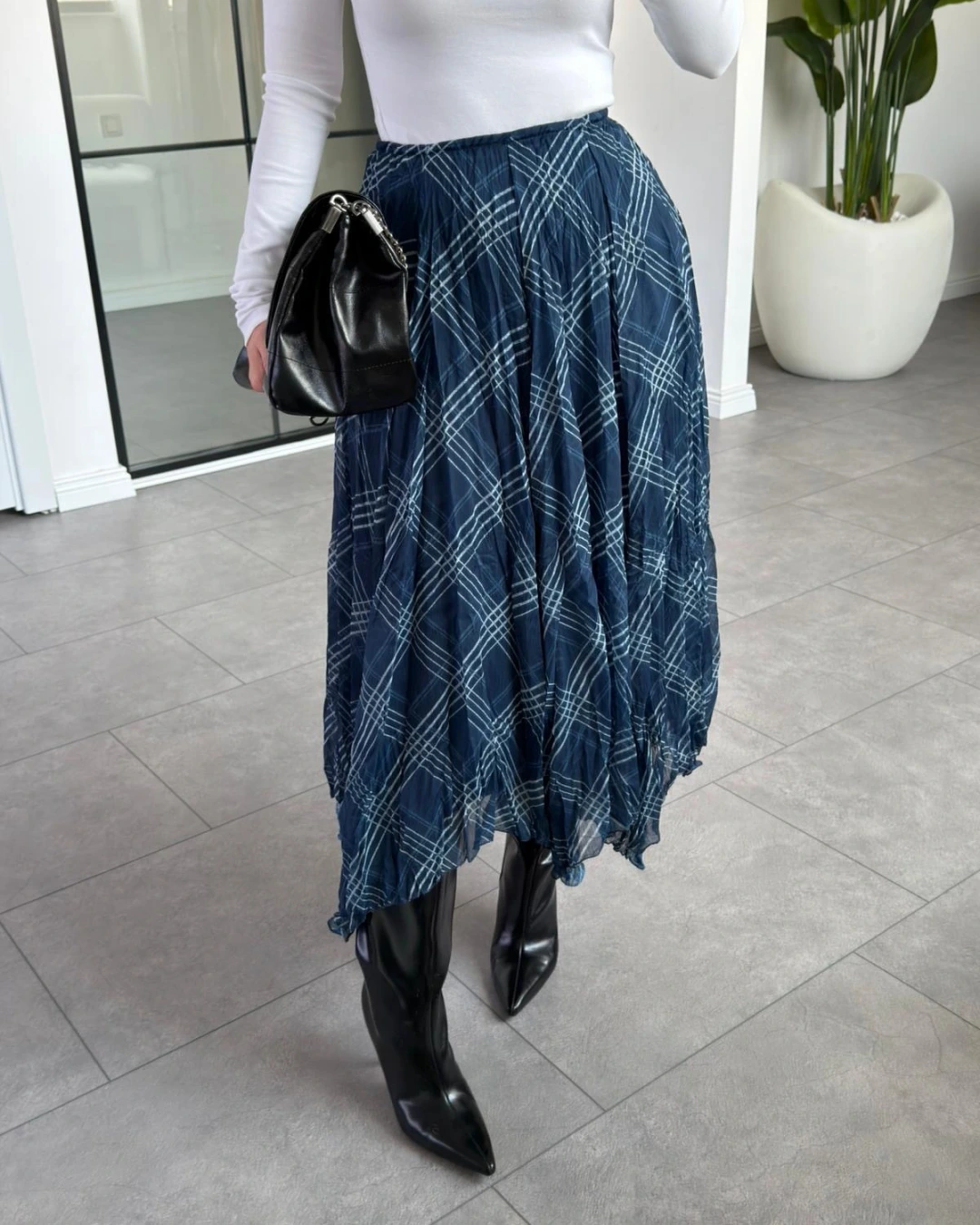 PETROL ŞİFON EKOSE DESENLİ ASİMETRİK ETEK