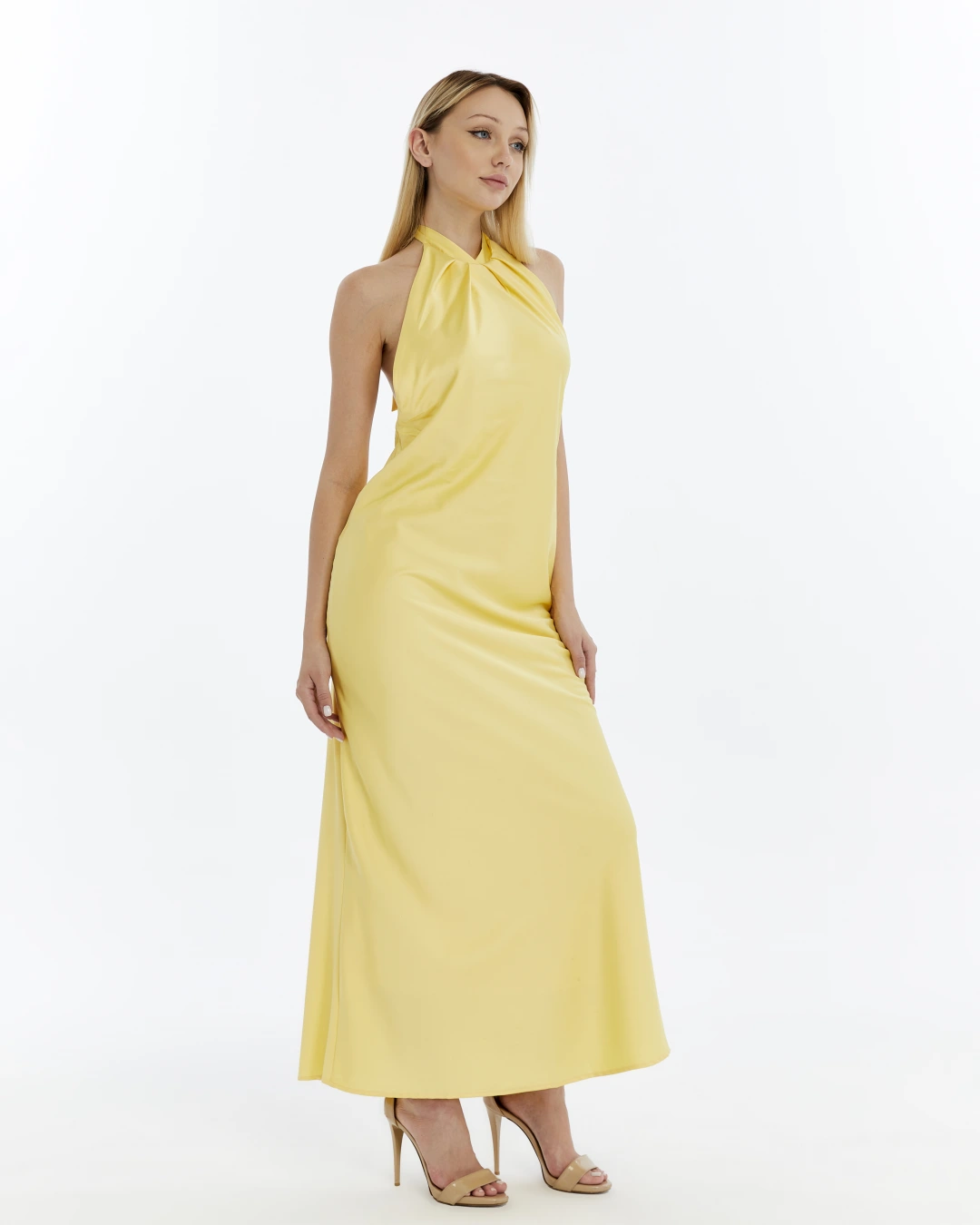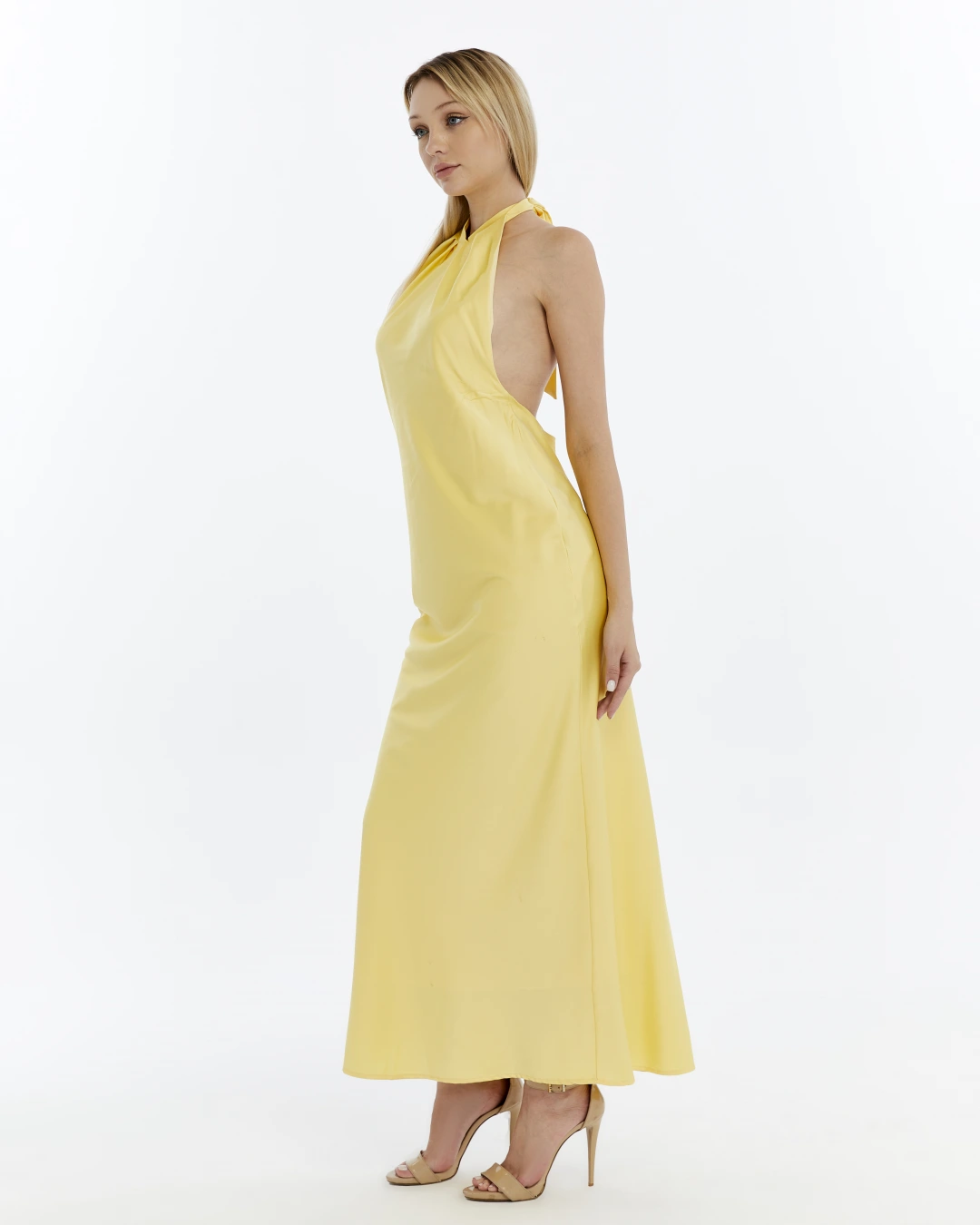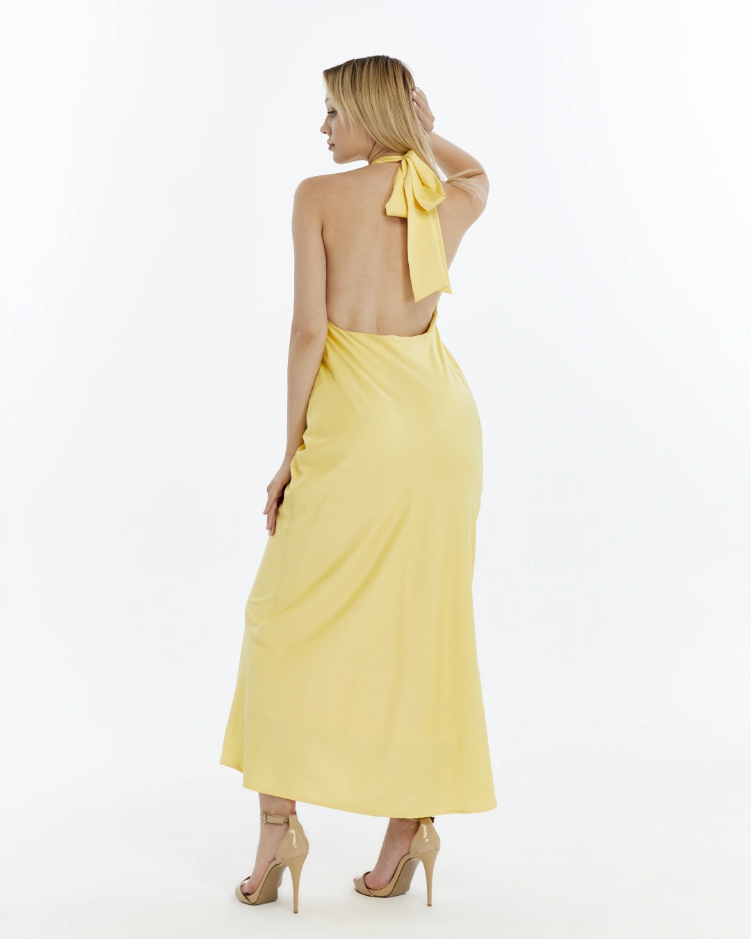 SARI BOYUNDAN BAĞLAMALI SIRTI AÇIK SATEN ELBİSE