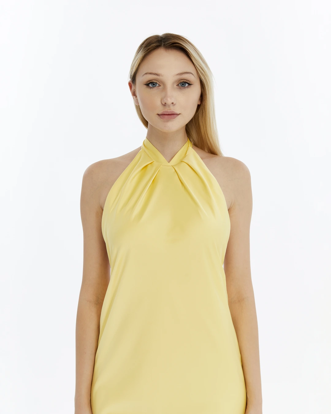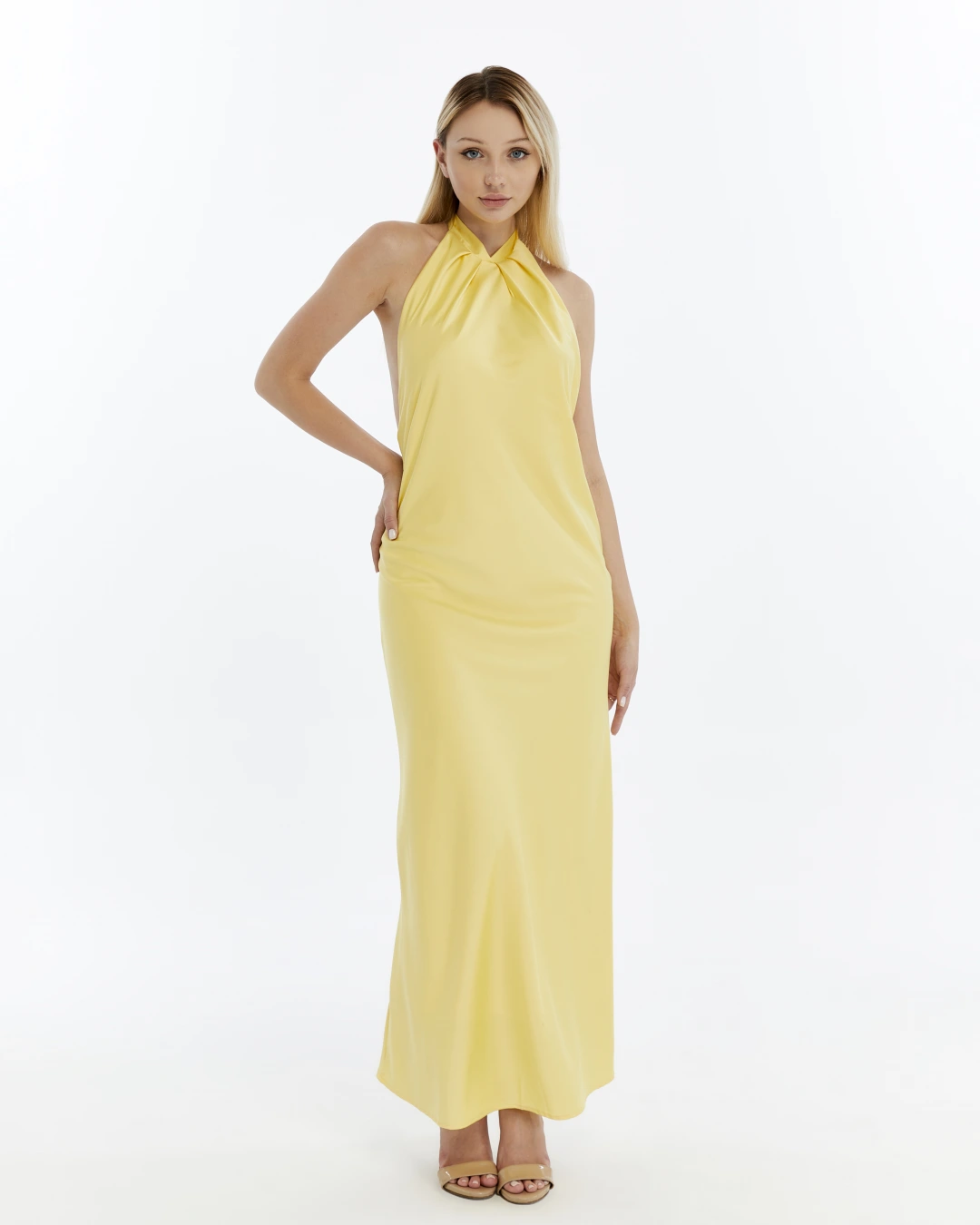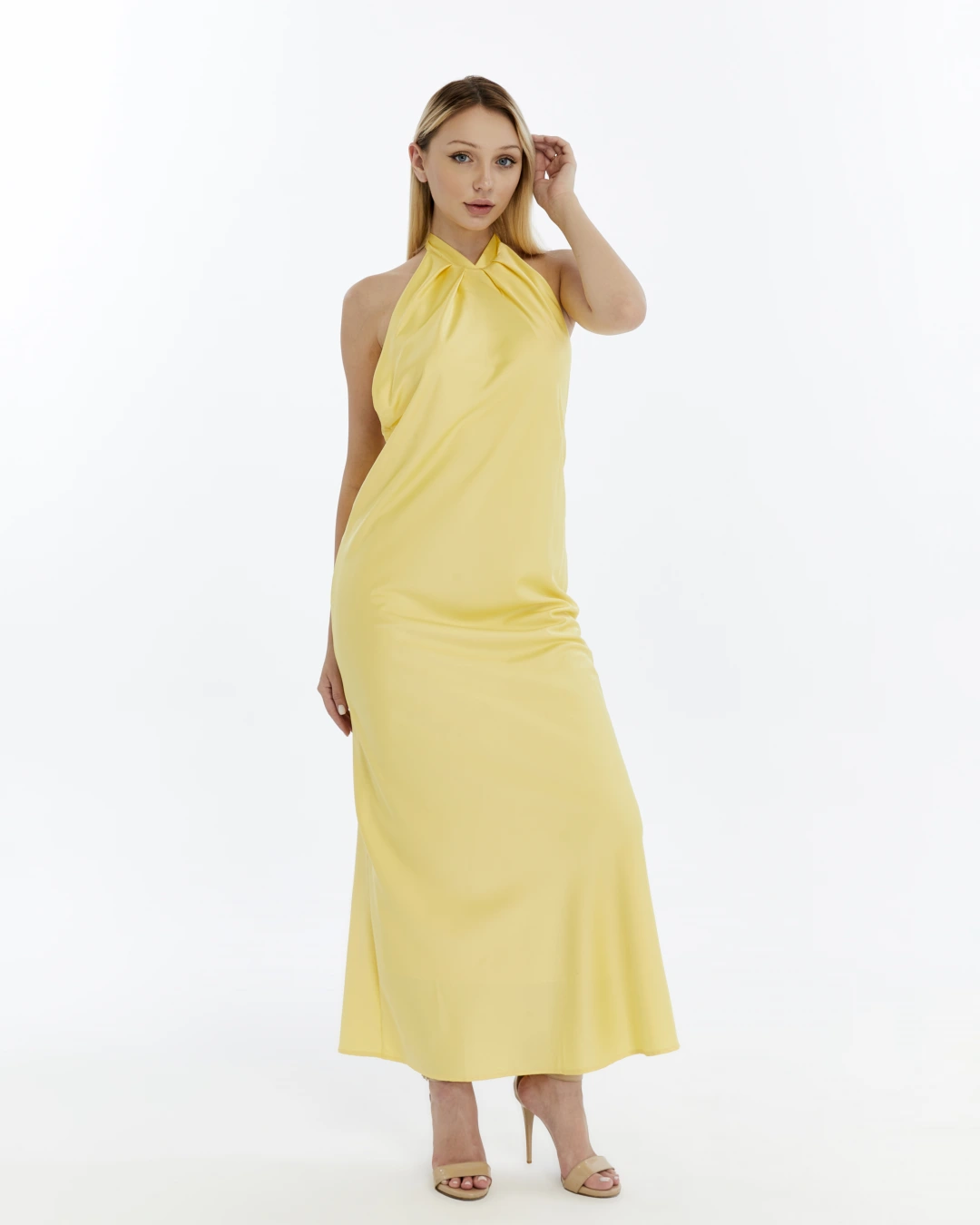 SARI BOYUNDAN BAĞLAMALI SIRTI AÇIK SATEN ELBİSE