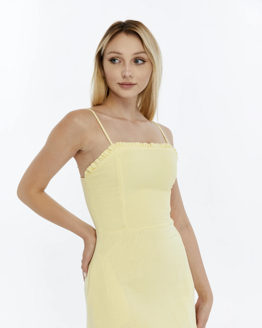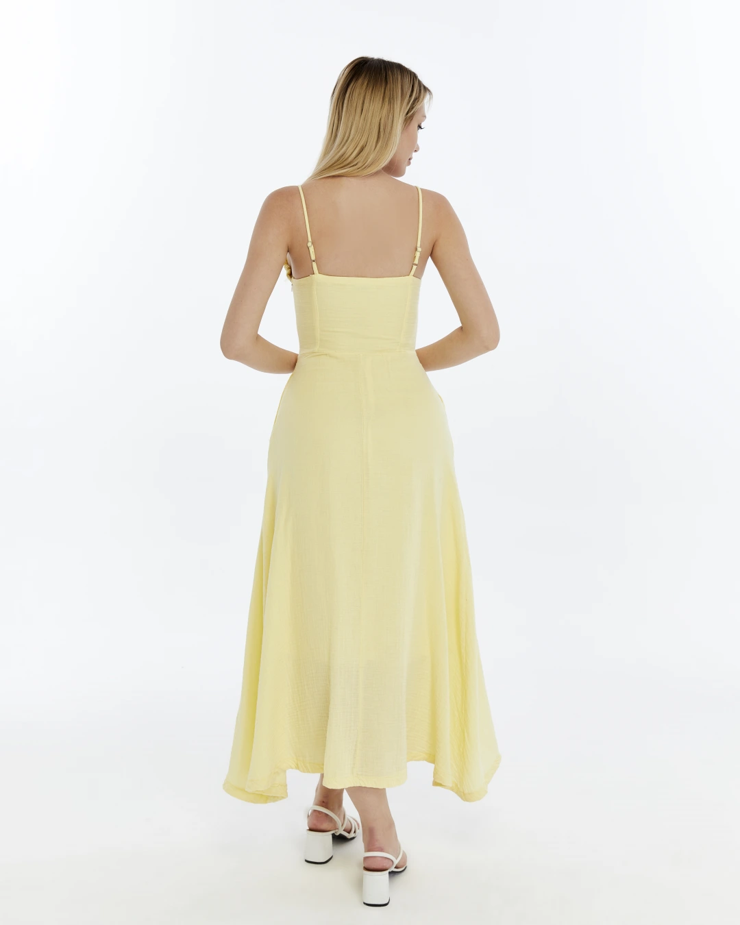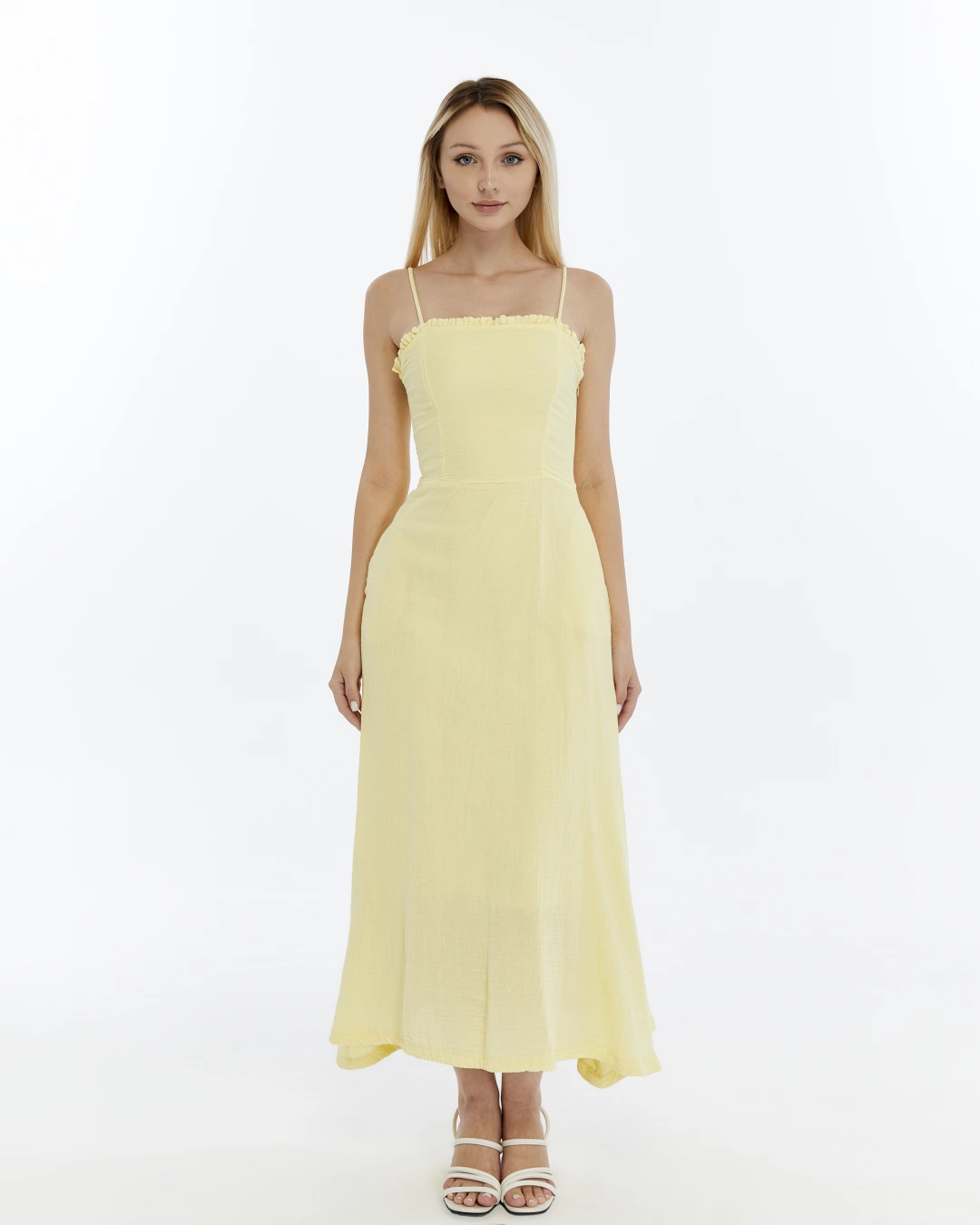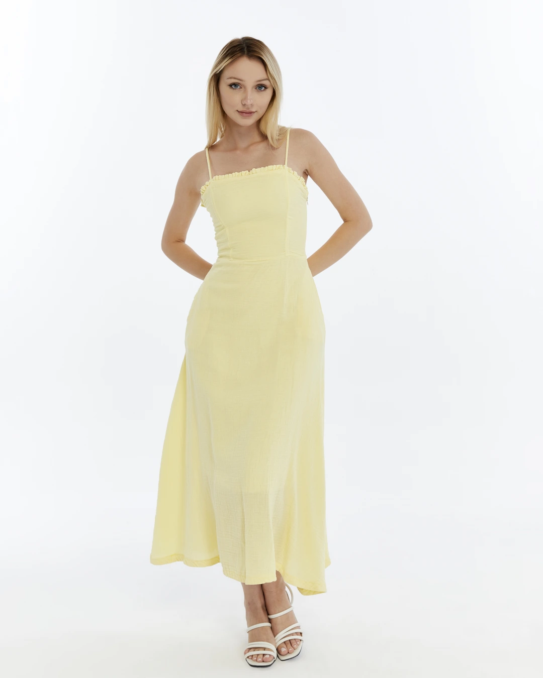 SARI FIRFIRLI İP ASKILI MÜSLİN ELBİSE