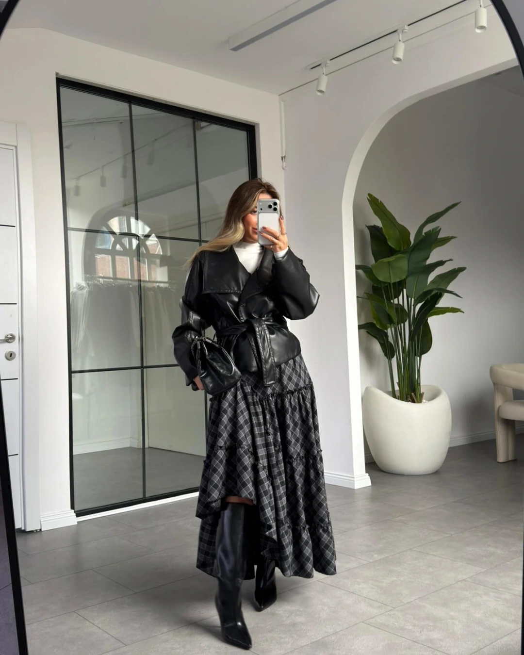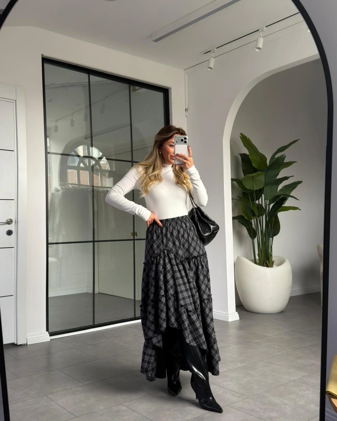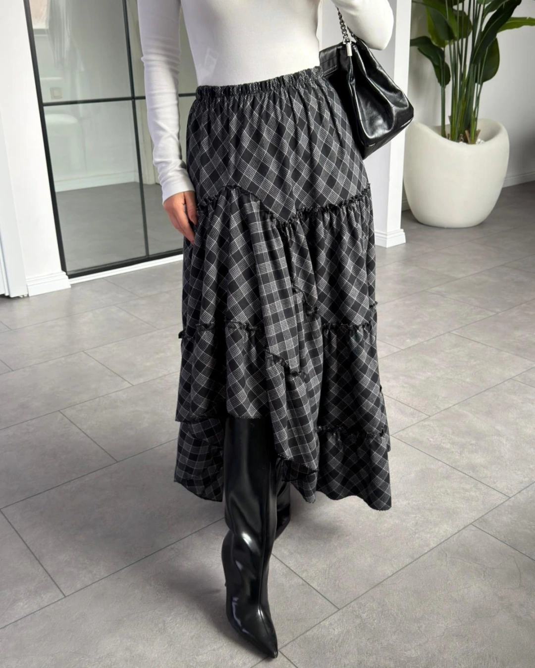 SİYAH ANTRASİT EKOSE DESENLİ ASİMETRİK ETEK