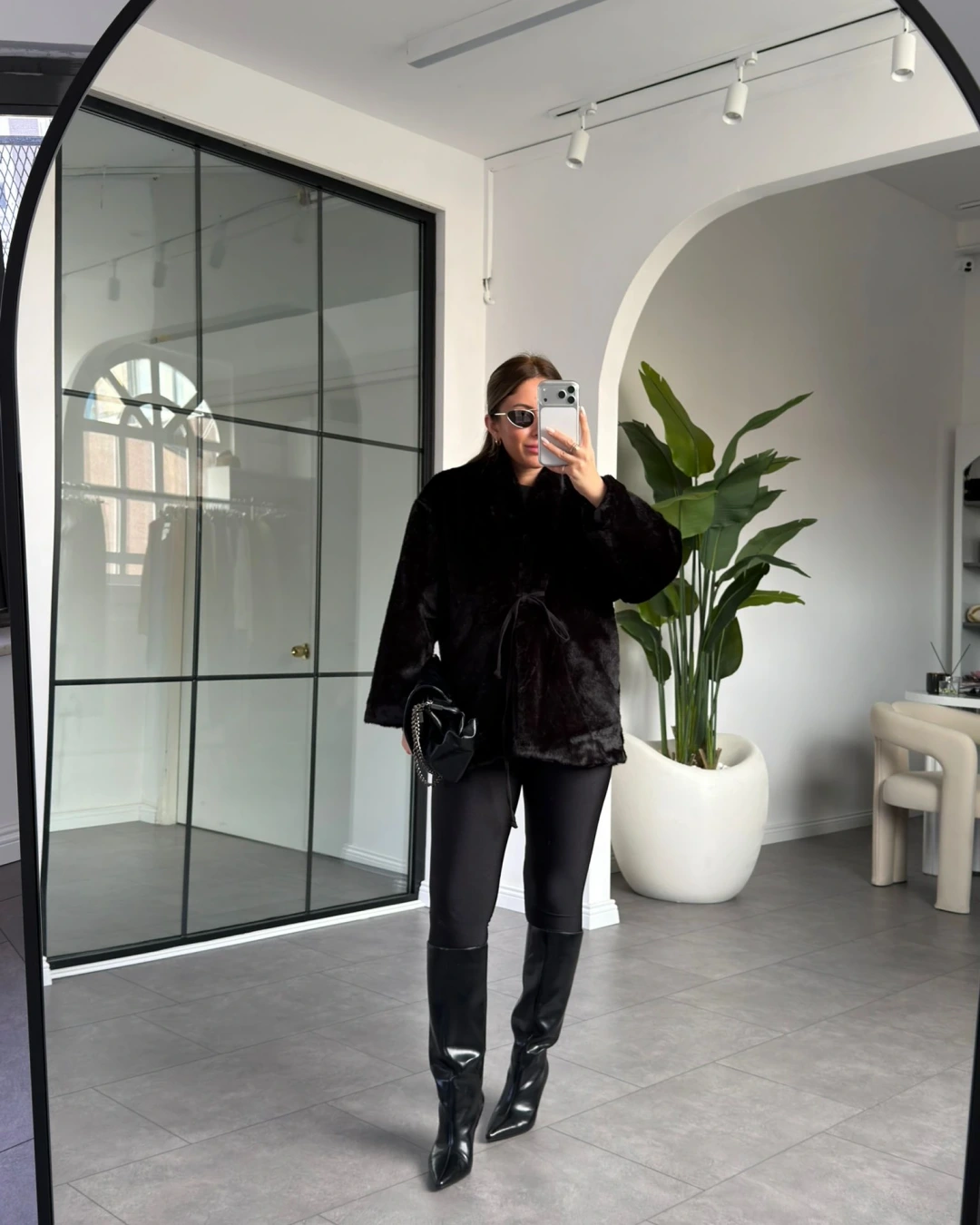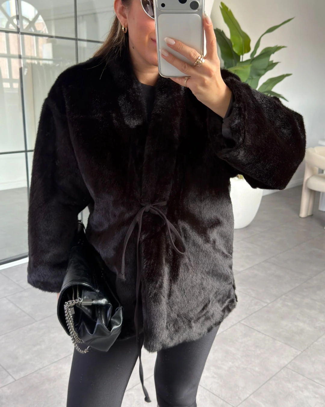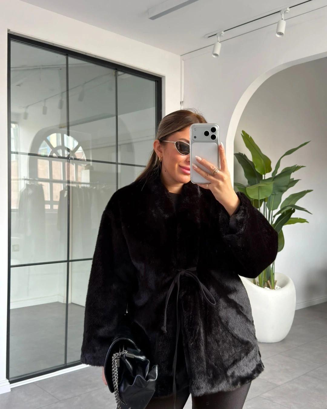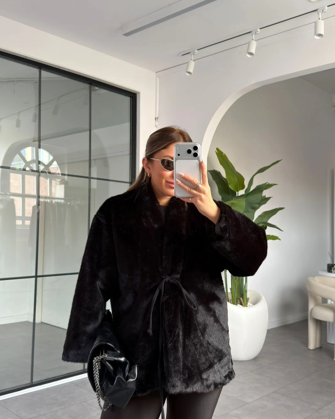 SİYAH BAĞLAMA DETAYLI KÜRK MONT