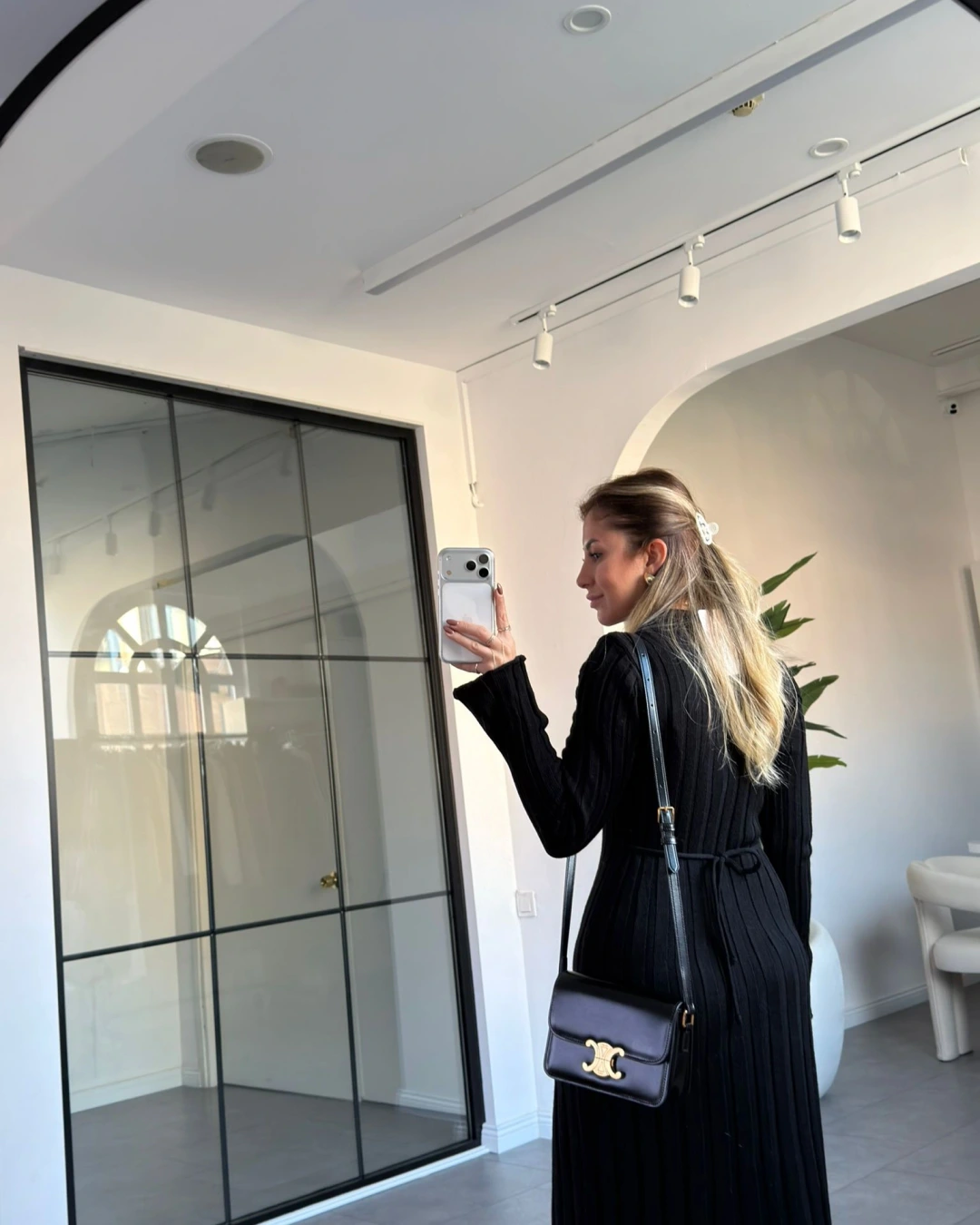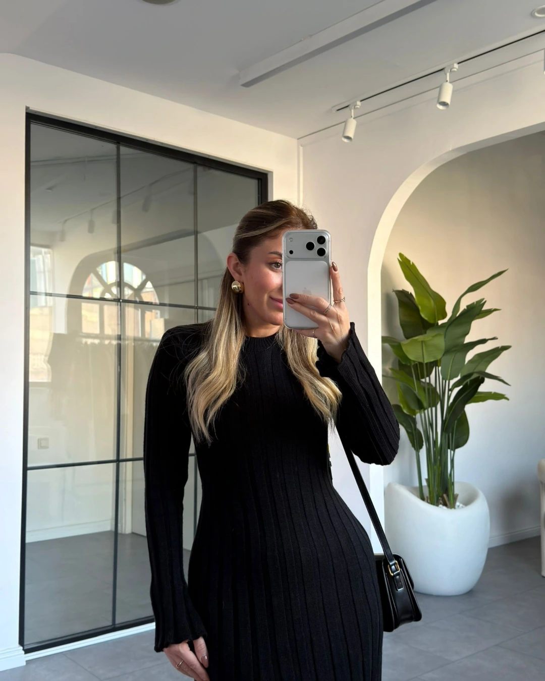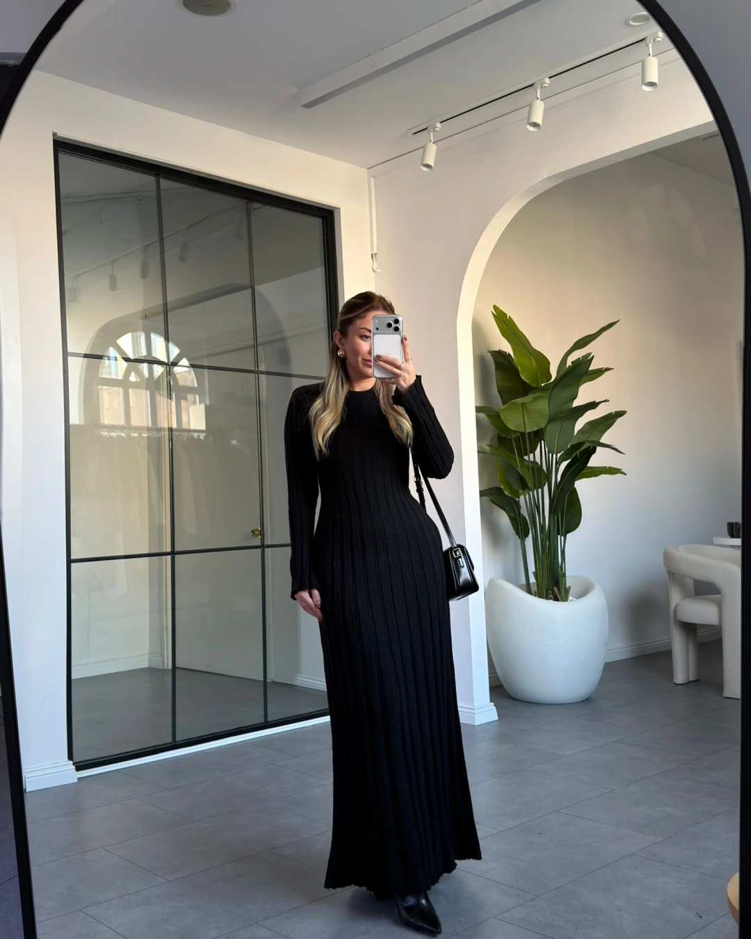 SİYAH BAĞLAMA DETAYLI UZUN TRİKO ELBİSE