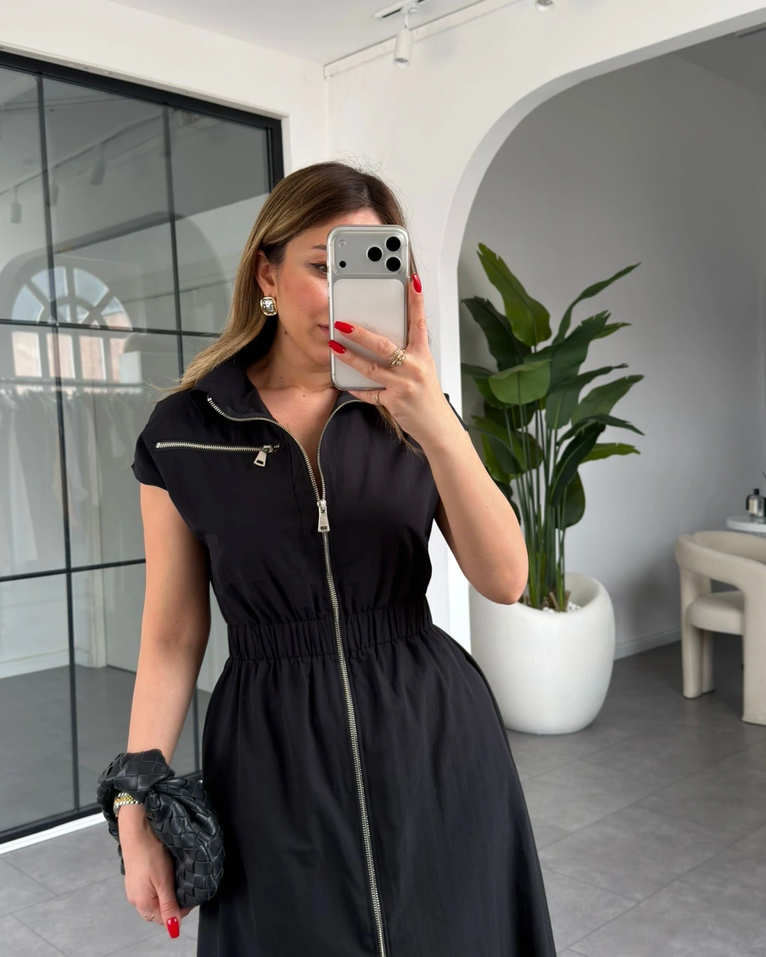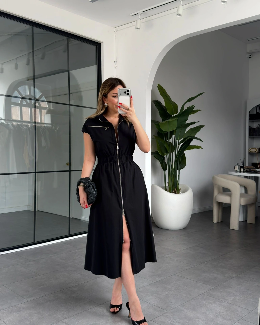 SİYAH BELİ LASTİKLİ SIFIR KOL ÇİFT FERMUARLI ELBİSE