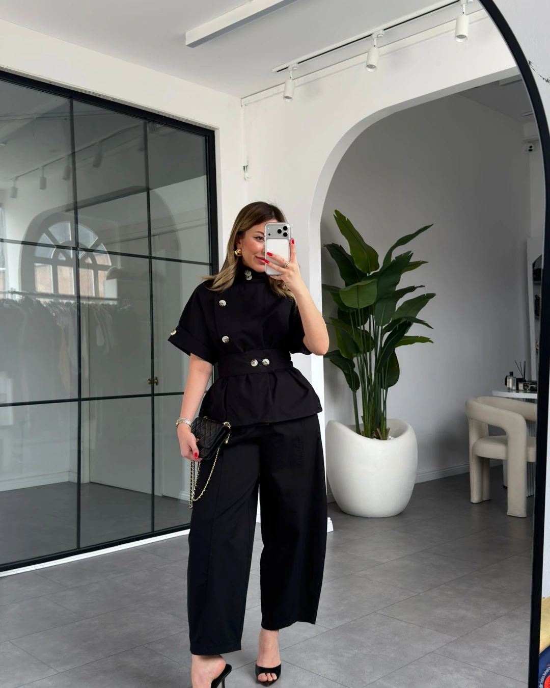 SİYAH DİK YAKA DÜĞMELİ BLUZ TAKIM