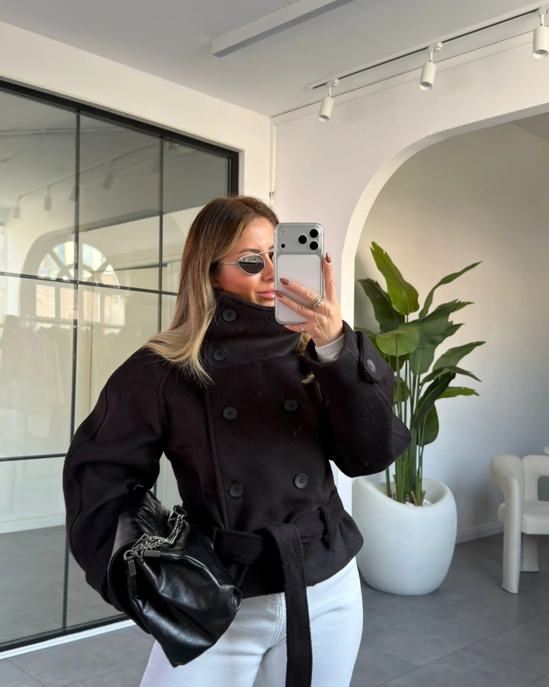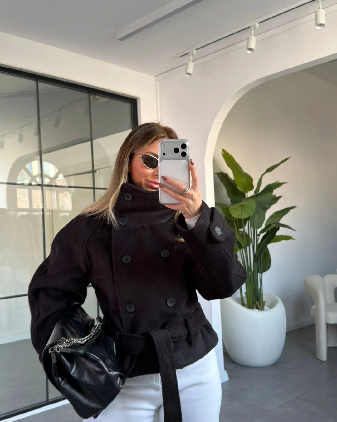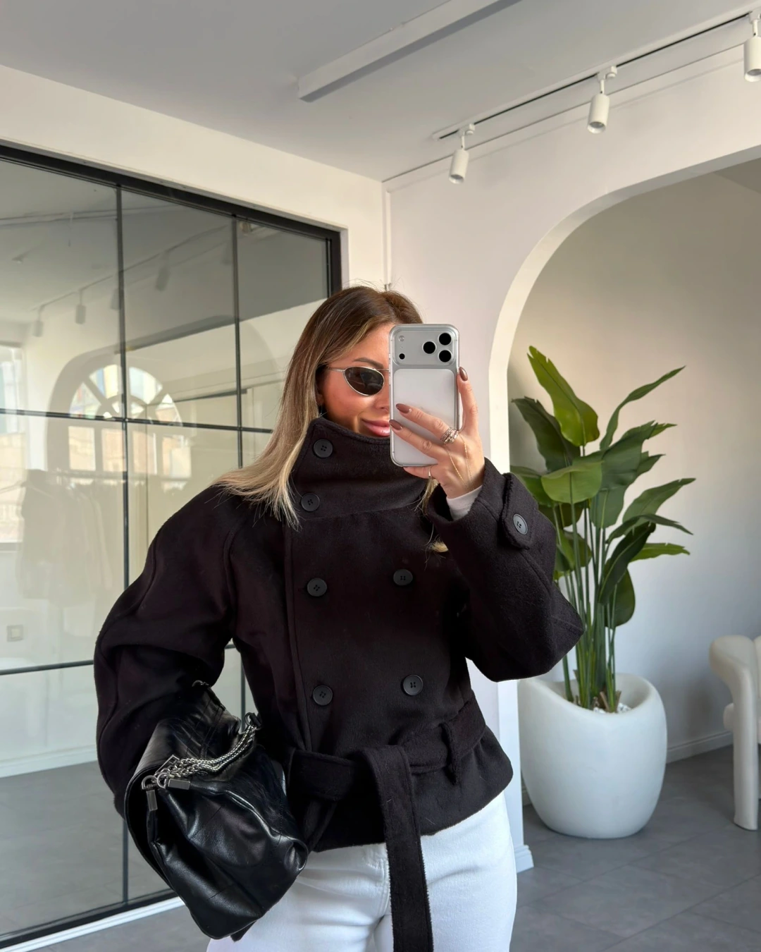 SİYAH DİK YAKA KUŞAKLI KAŞE KABAN