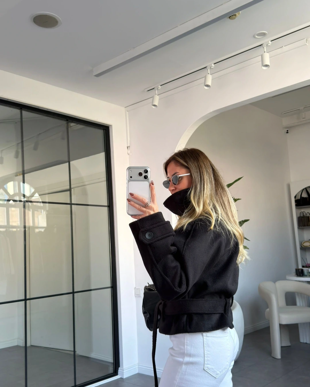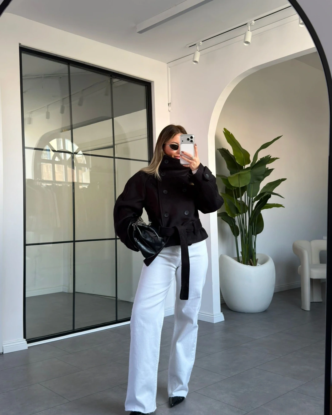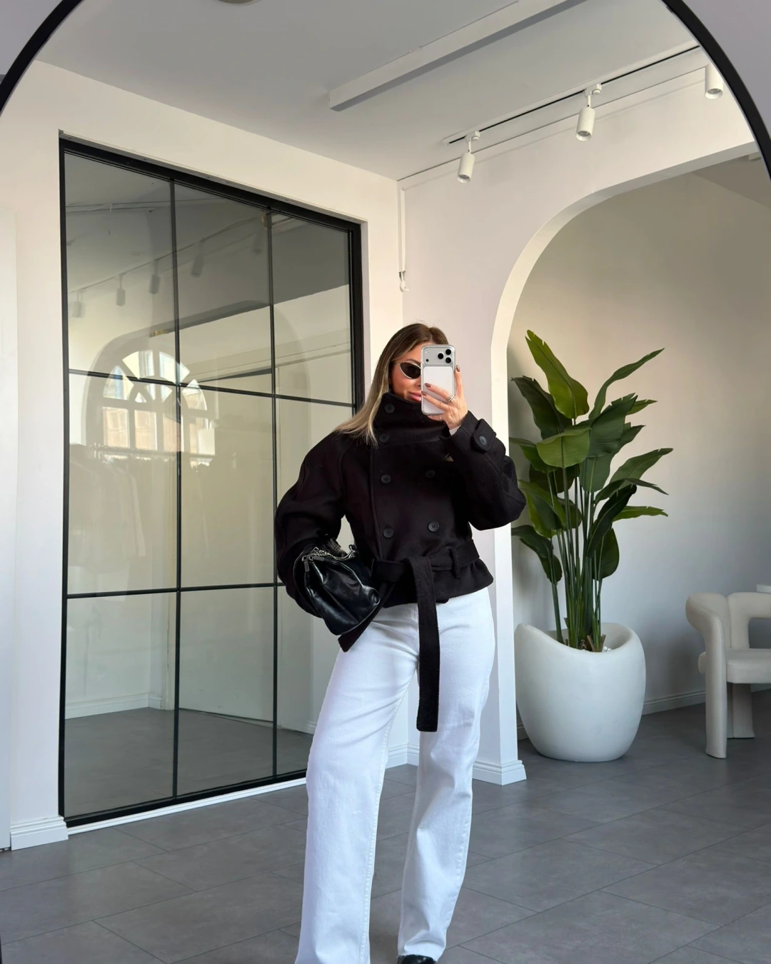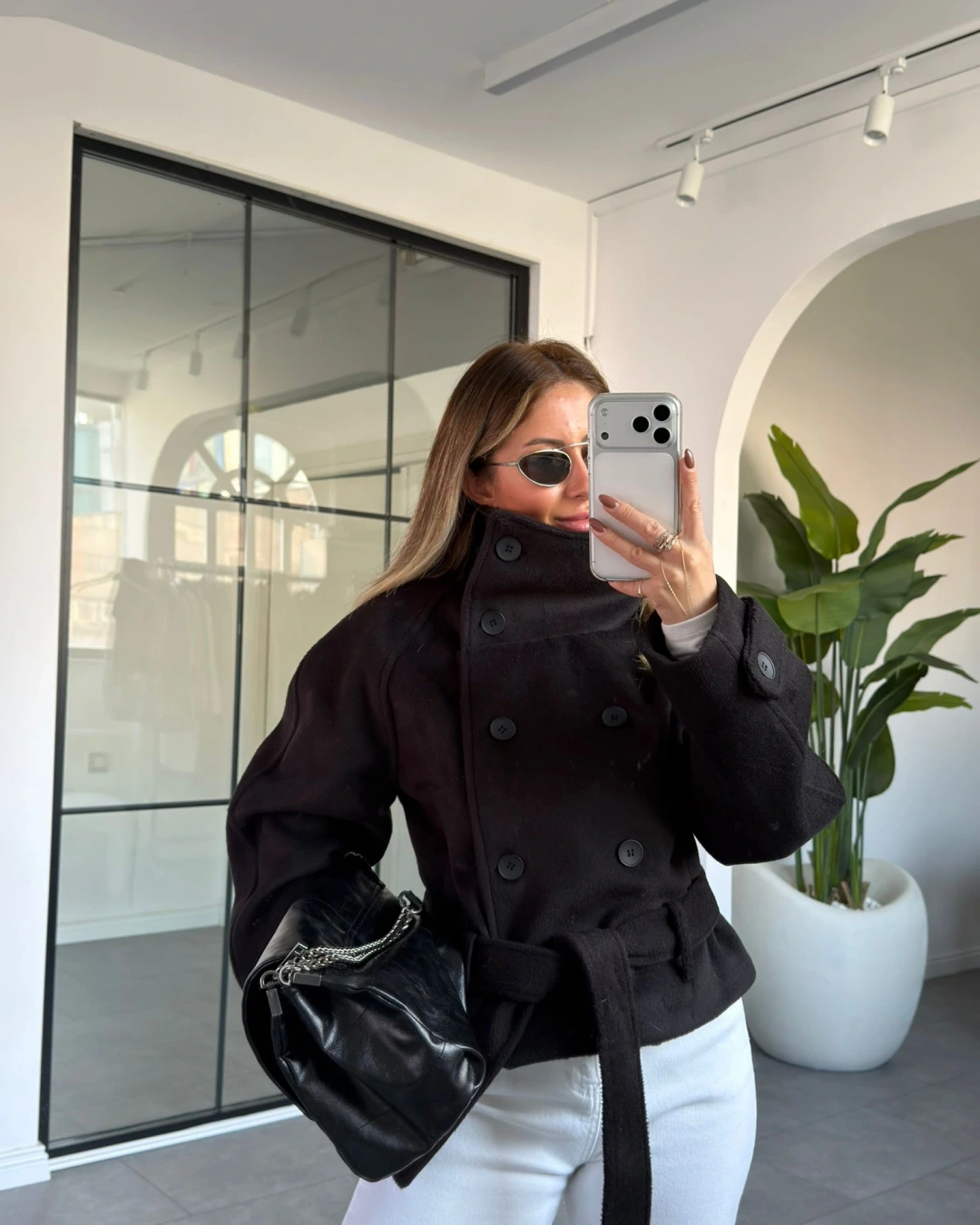 SİYAH DİK YAKA KUŞAKLI KAŞE KABAN