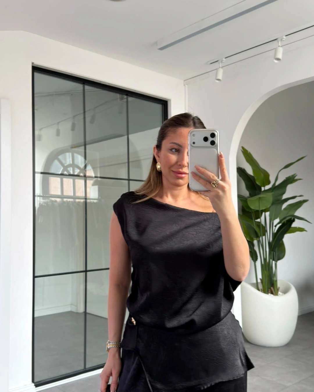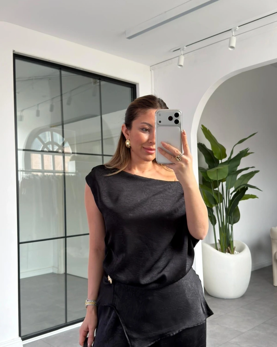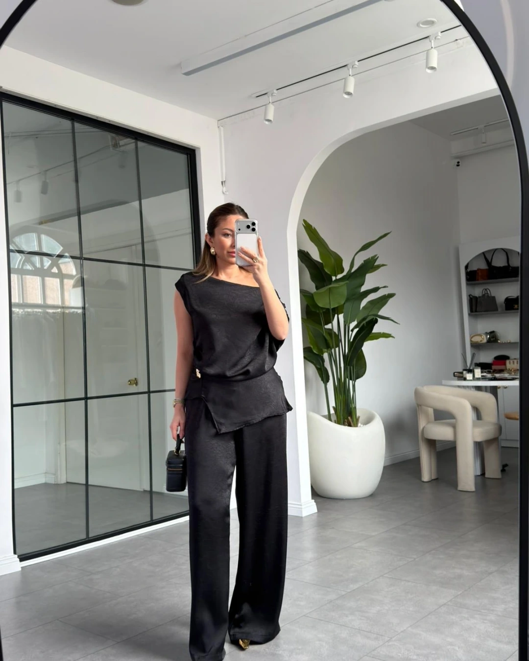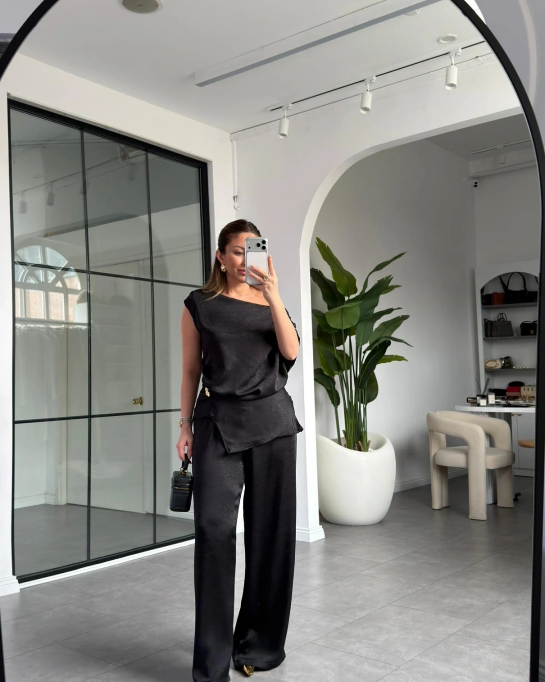 SİYAH DÜŞÜK OMUZ SATEN PANTOLON TAKIM 8888