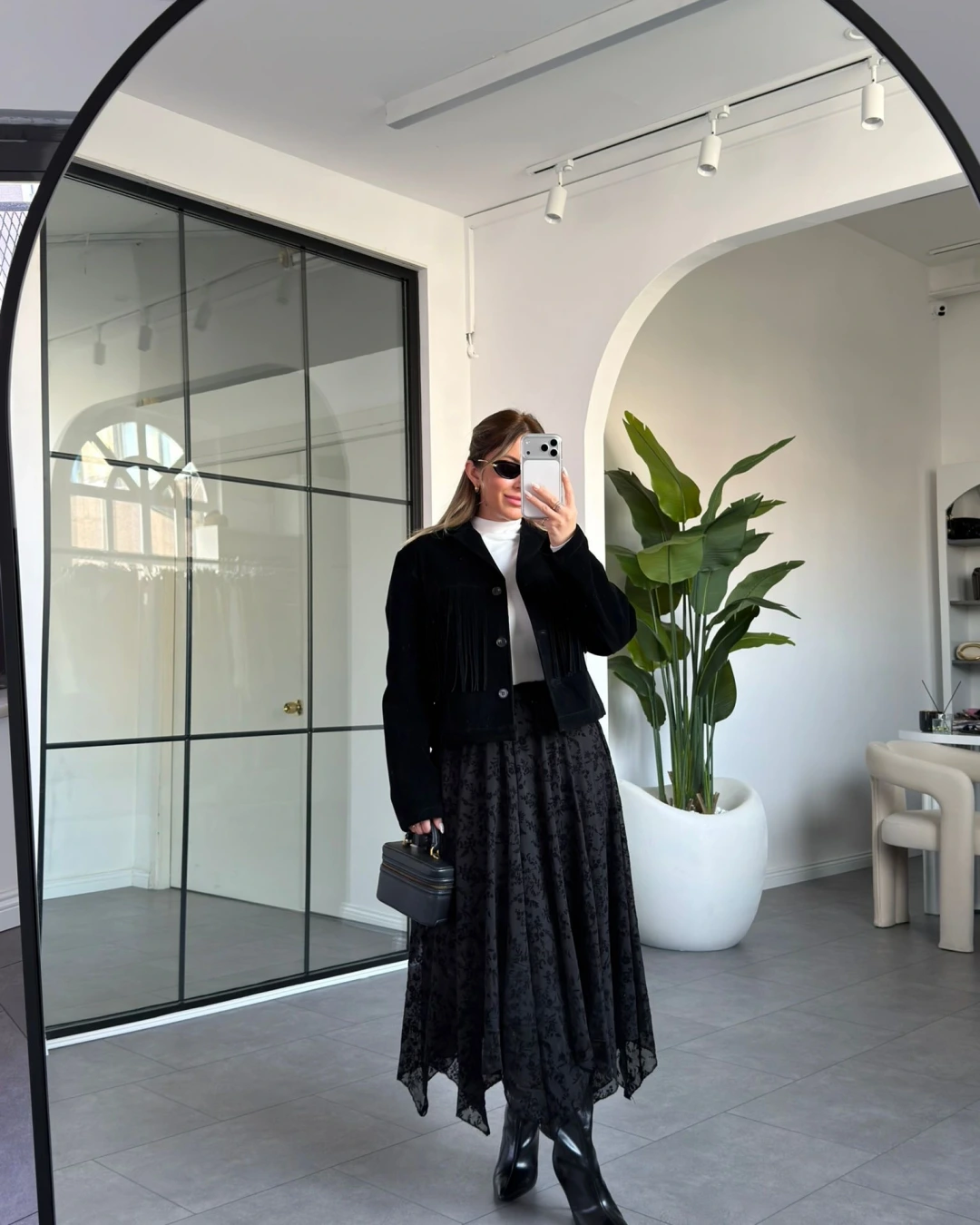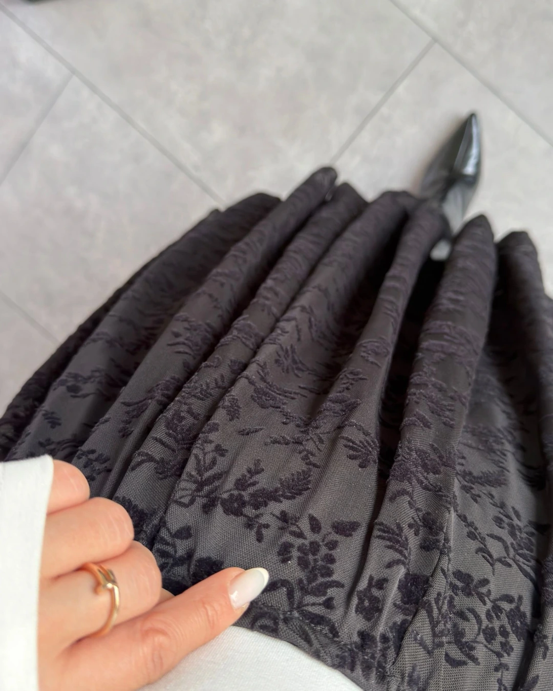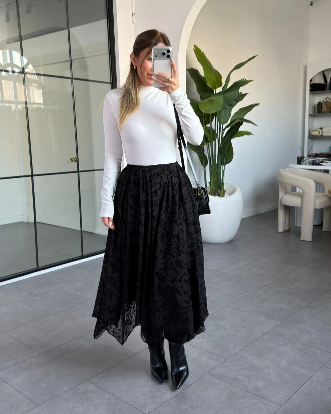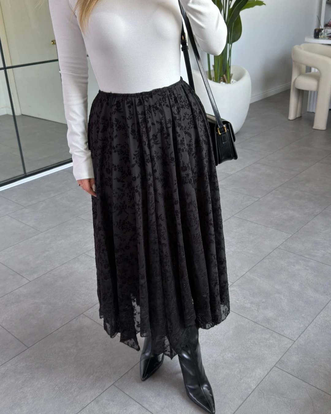 SİYAH FLOK BASKI ASİMETRİK ETEK