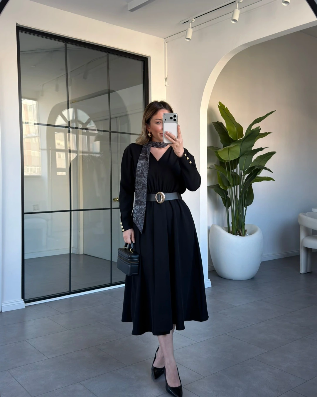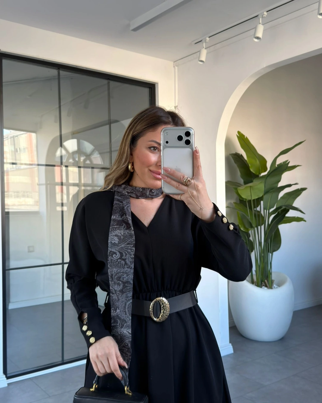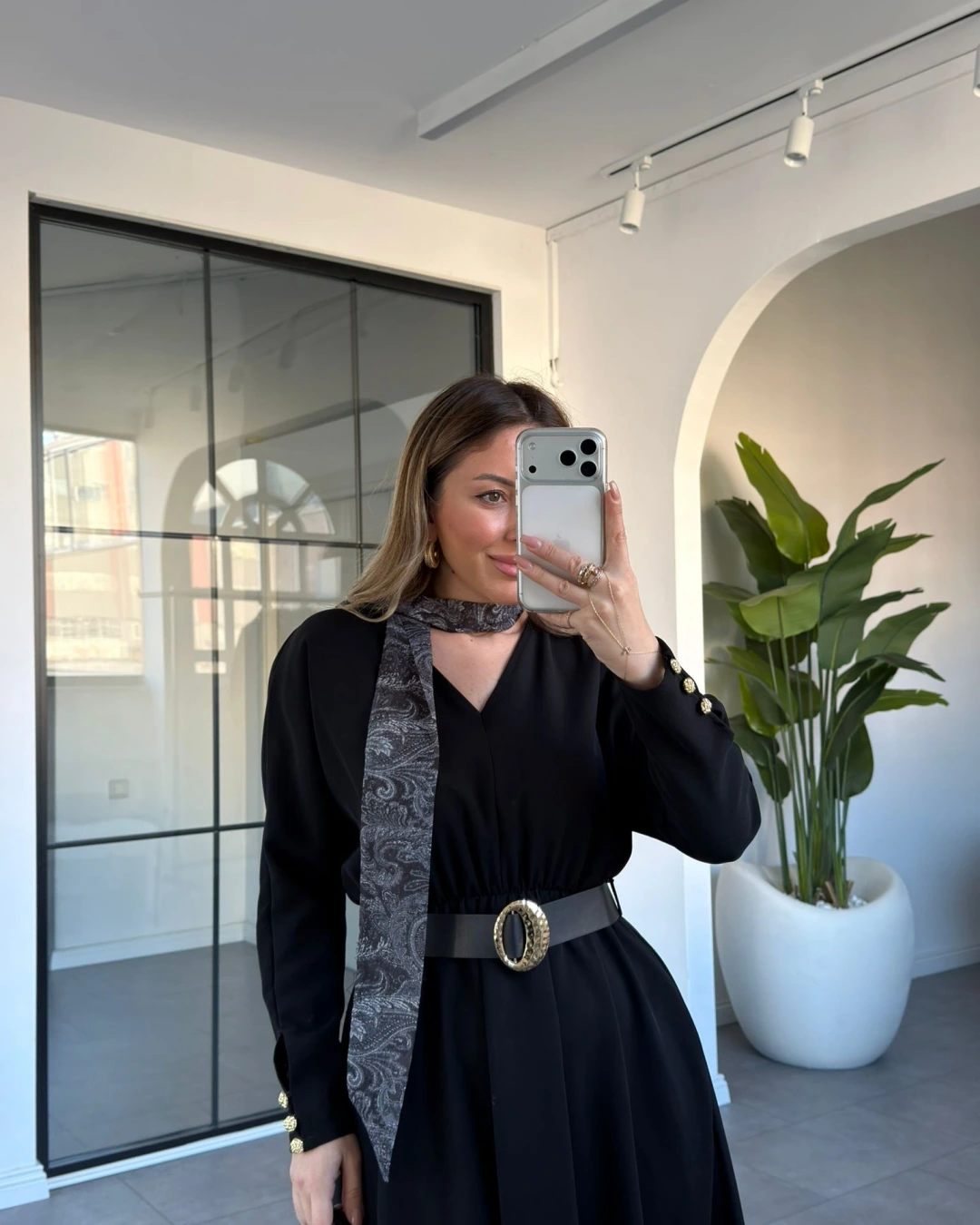 SİYAH FULAR DETAYLI ELBİSE 03029
