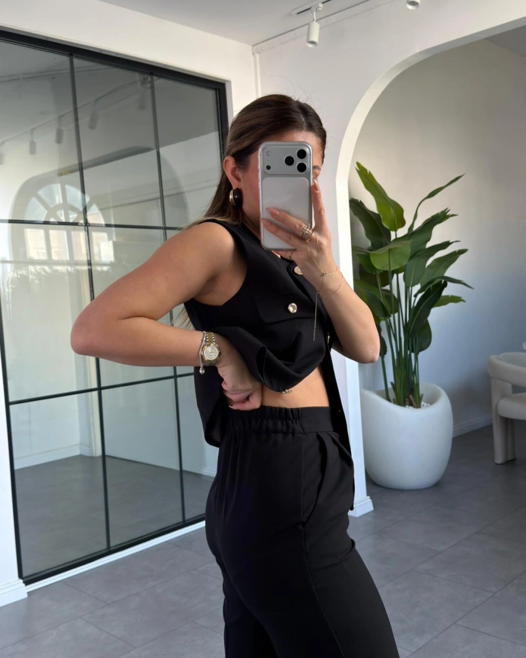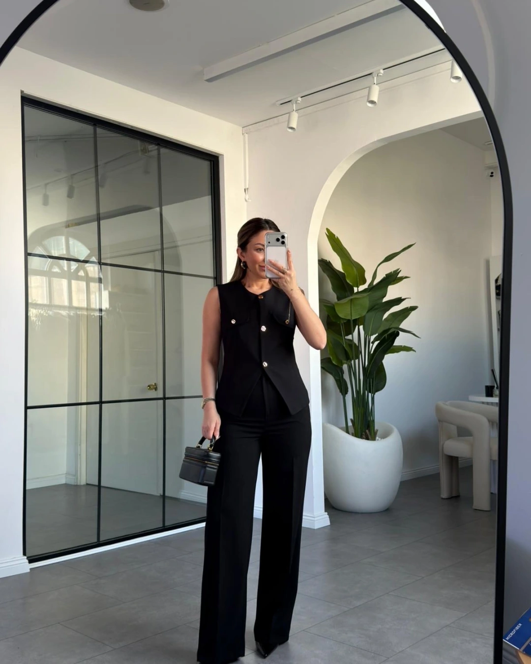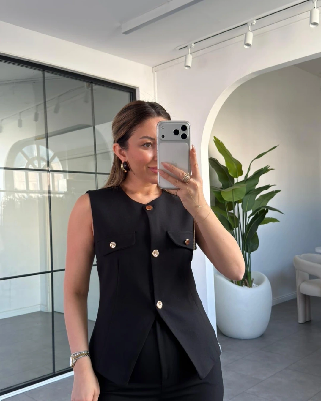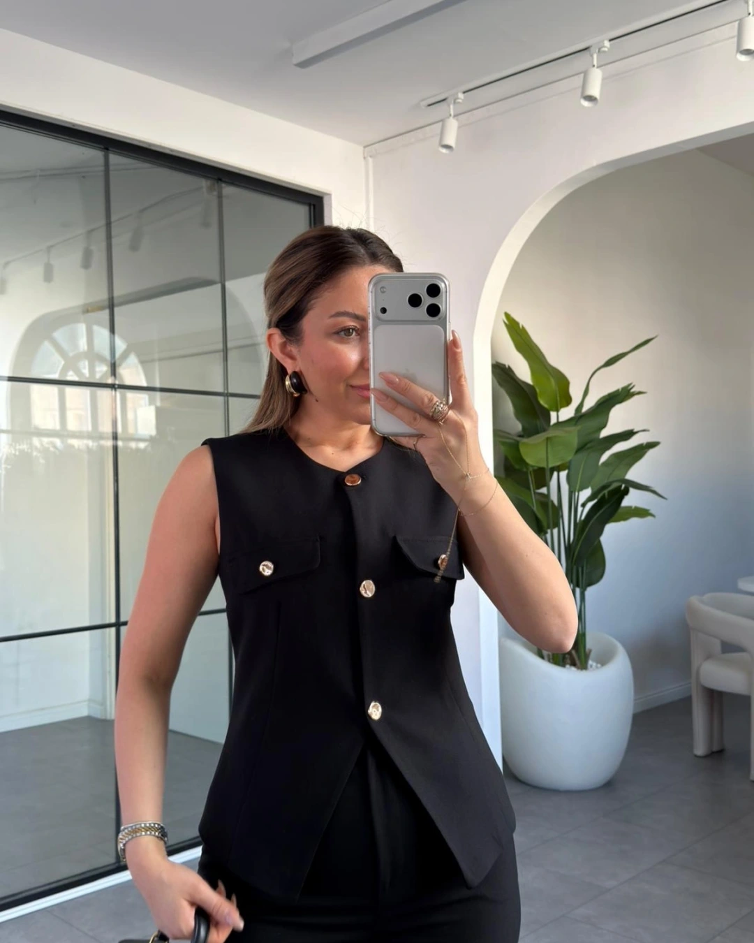 SİYAH GOLD DÜĞMELİ CEP KAPAKLI YELEK PANTOLON TAKIM