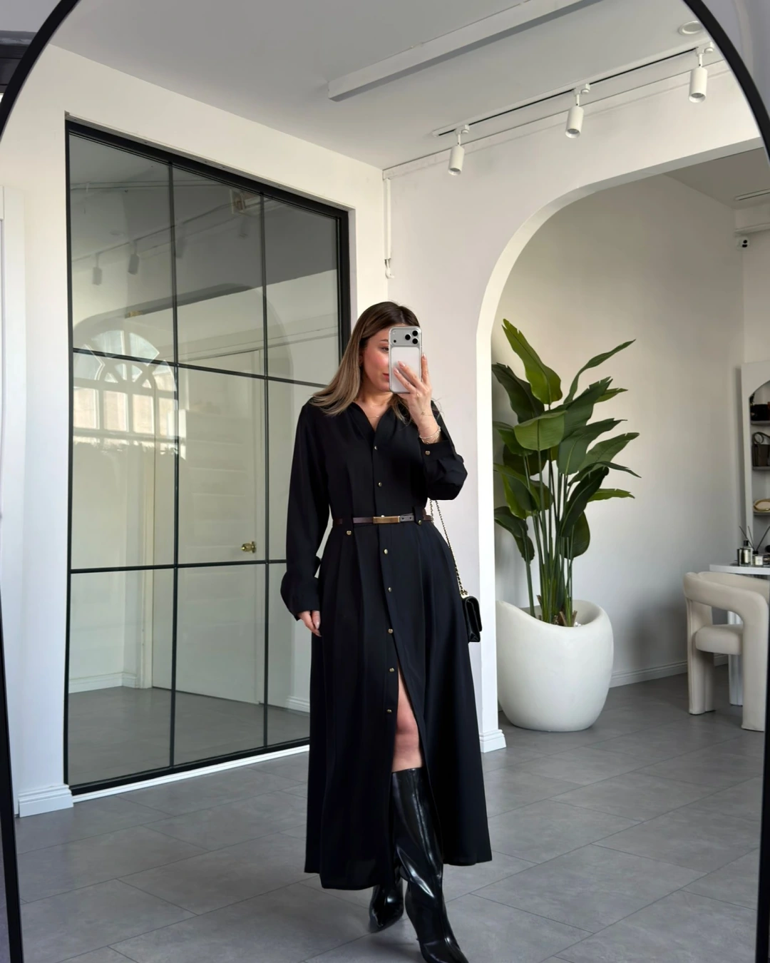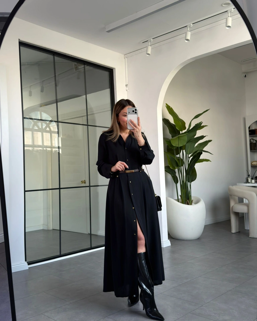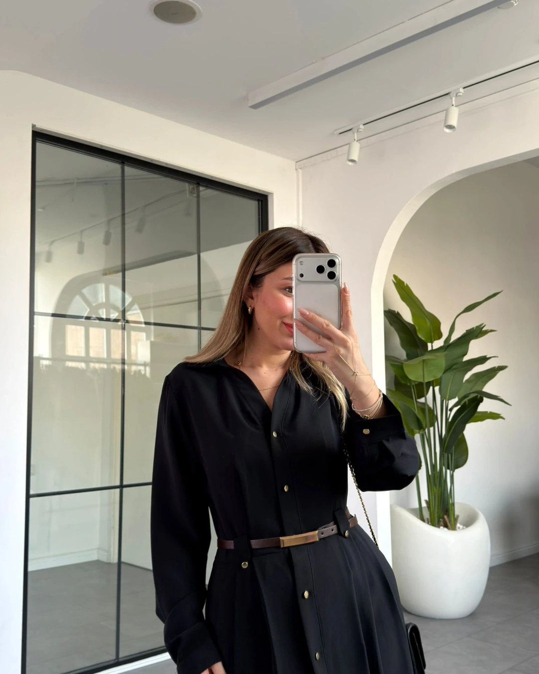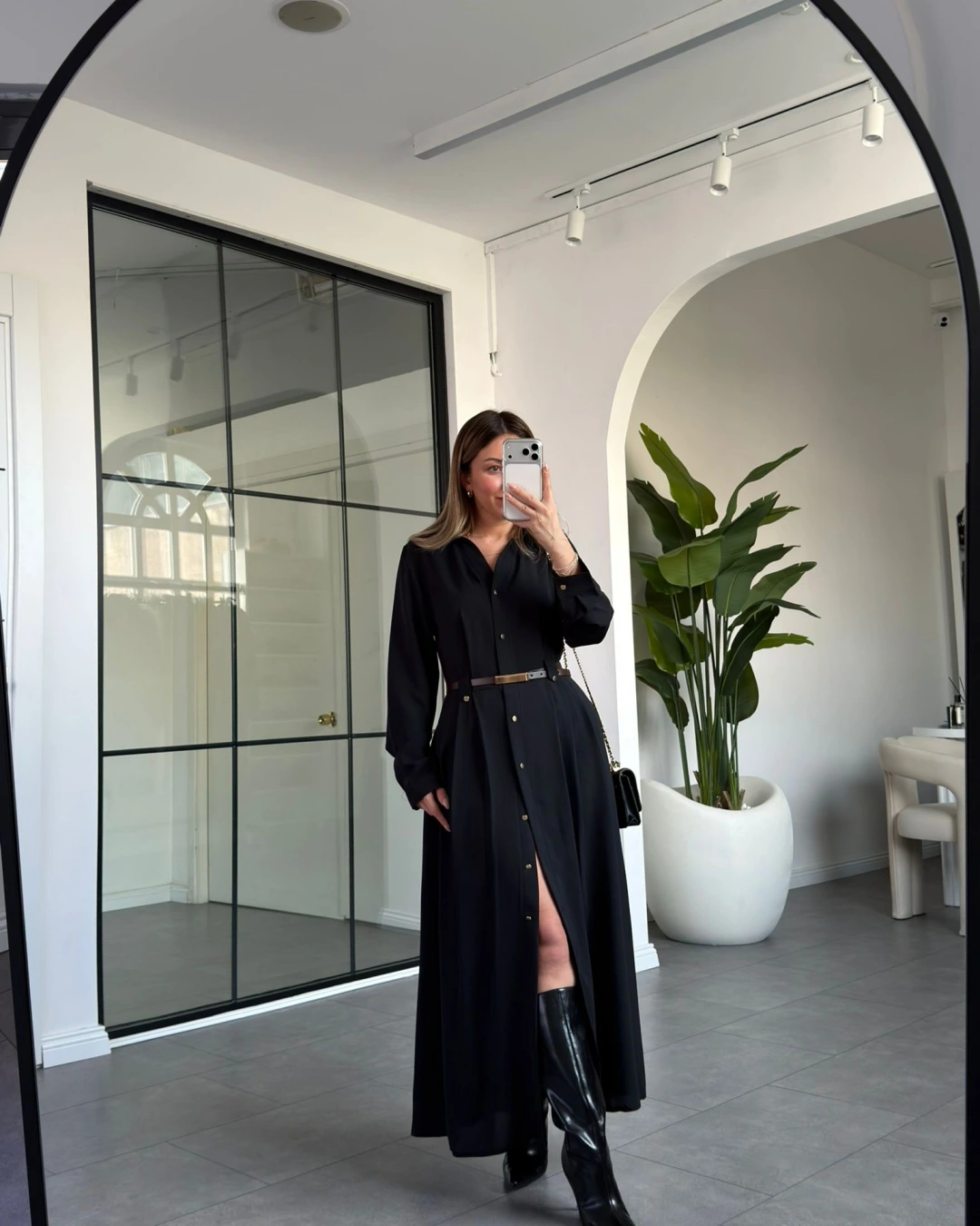 SİYAH GOLD DÜĞMELİ KEMERLİ ELBİSE