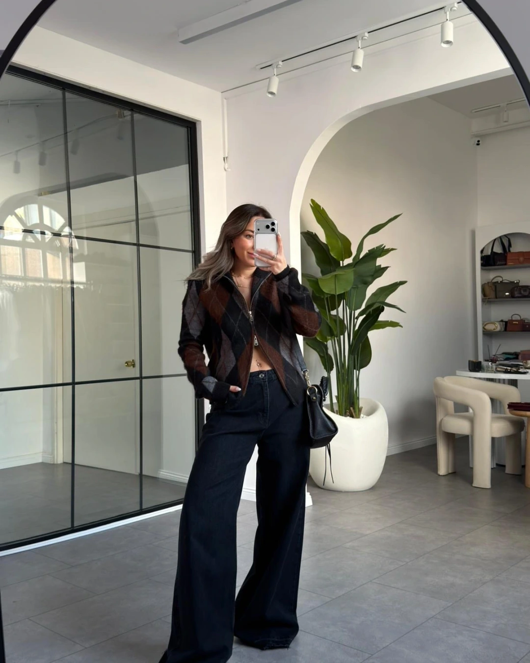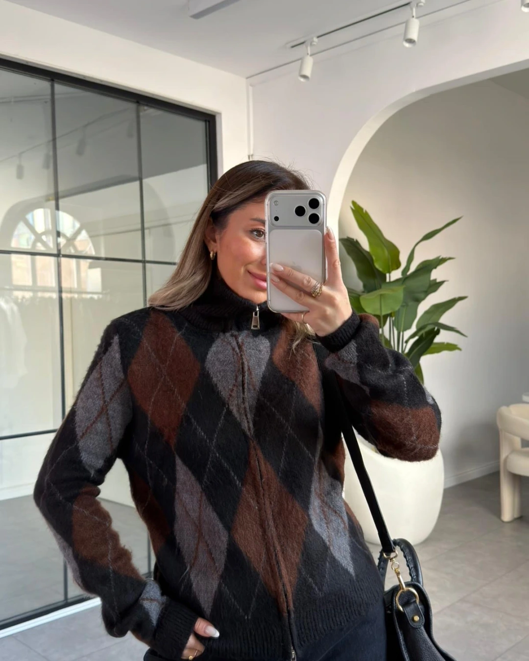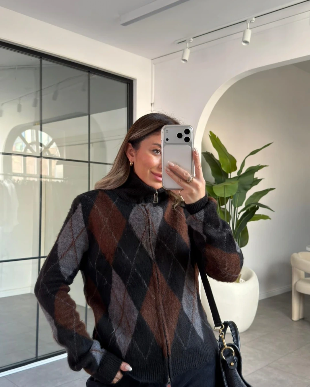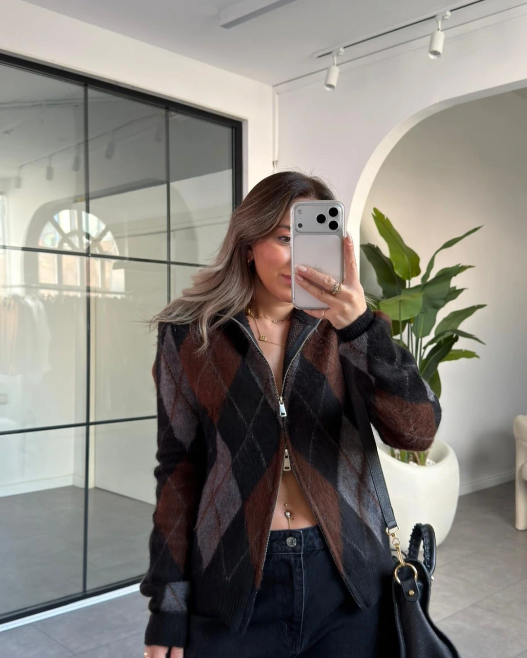 SİYAH KAHVE BAKLAVA DESEN ÇİFT FERMUAR HIRKA