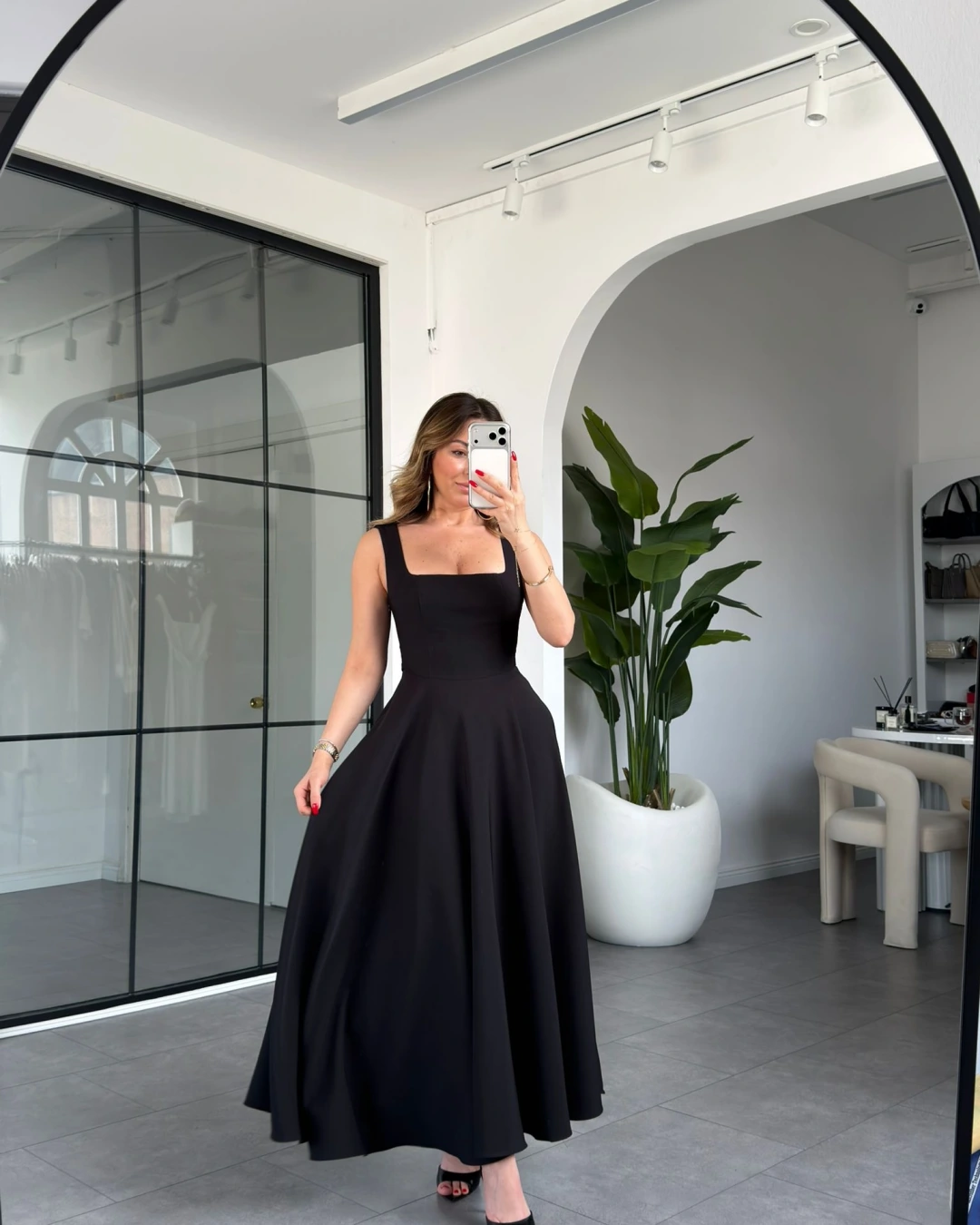SİYAH KALIN ASKILI KARE YAKA ELBİSE
