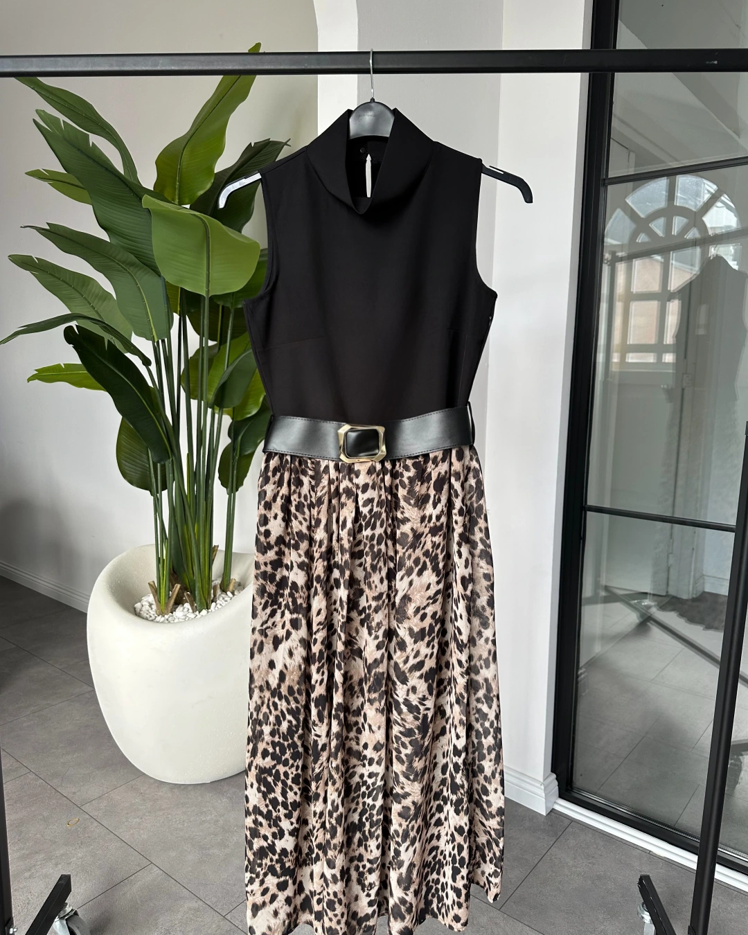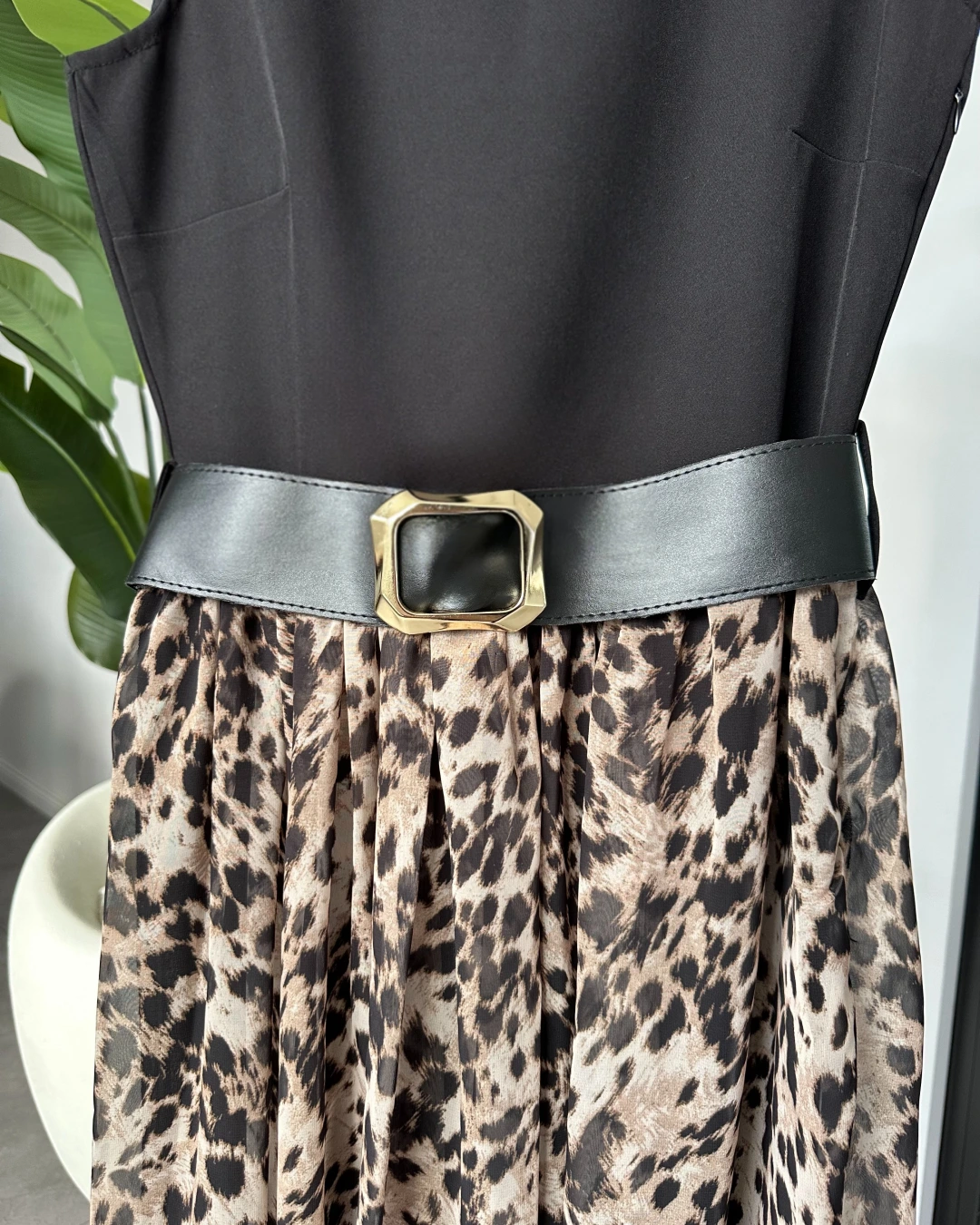 SİYAH KEMER DETAY LEOPAR DESEN ELBİSE