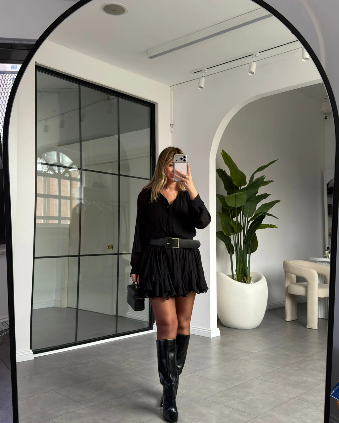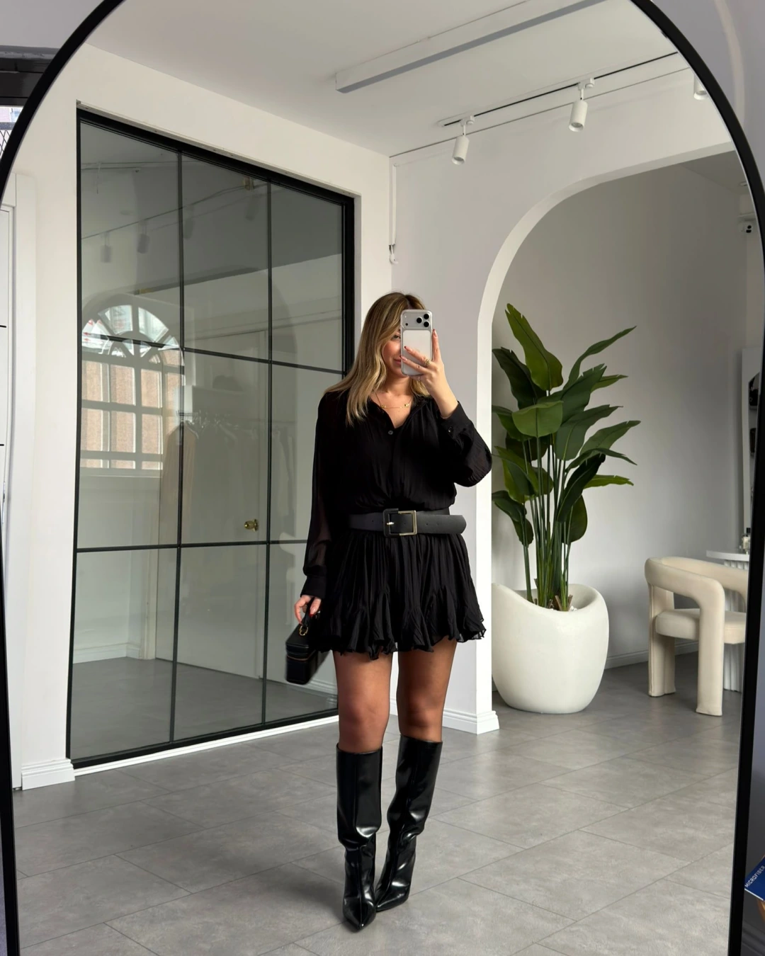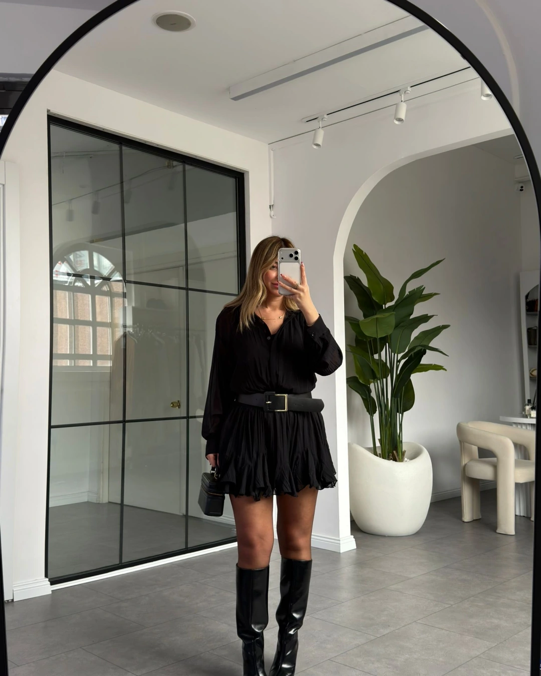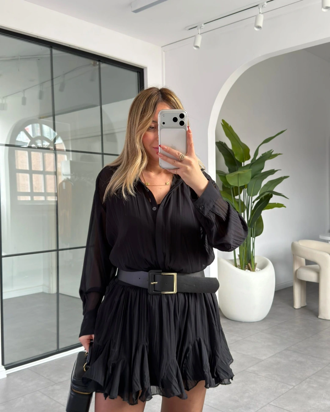 SİYAH KEMERLİ PİLİSELİ ŞİFON ELBİSE