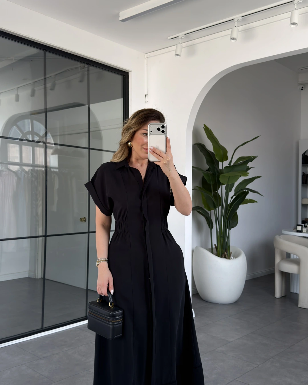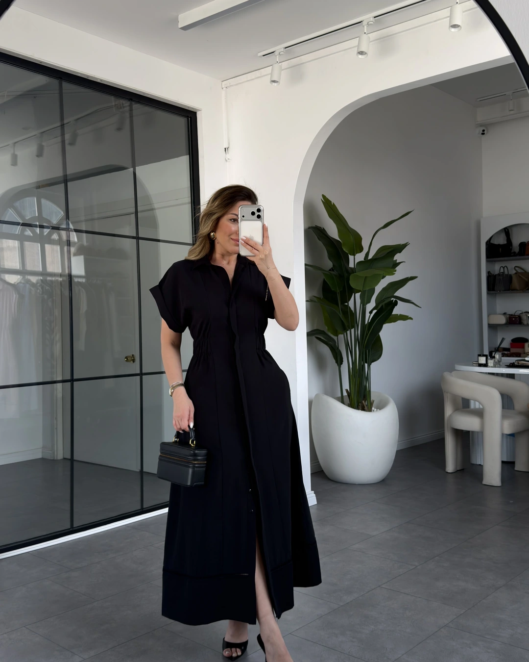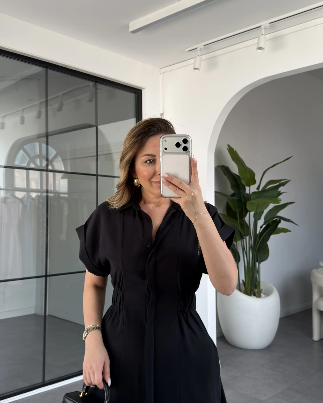 SİYAH KISA KOL BELİ LASTİKLİ MODAL ELBİSE