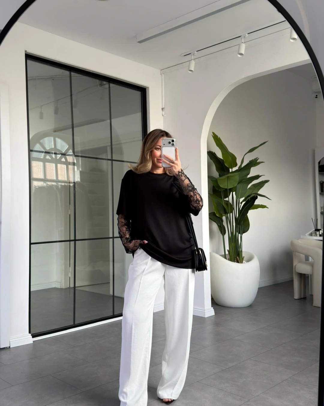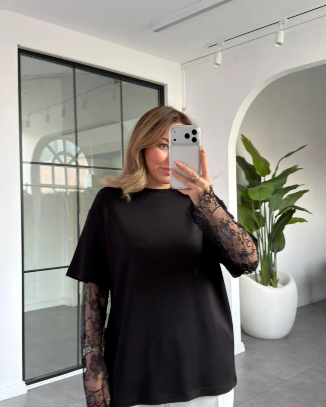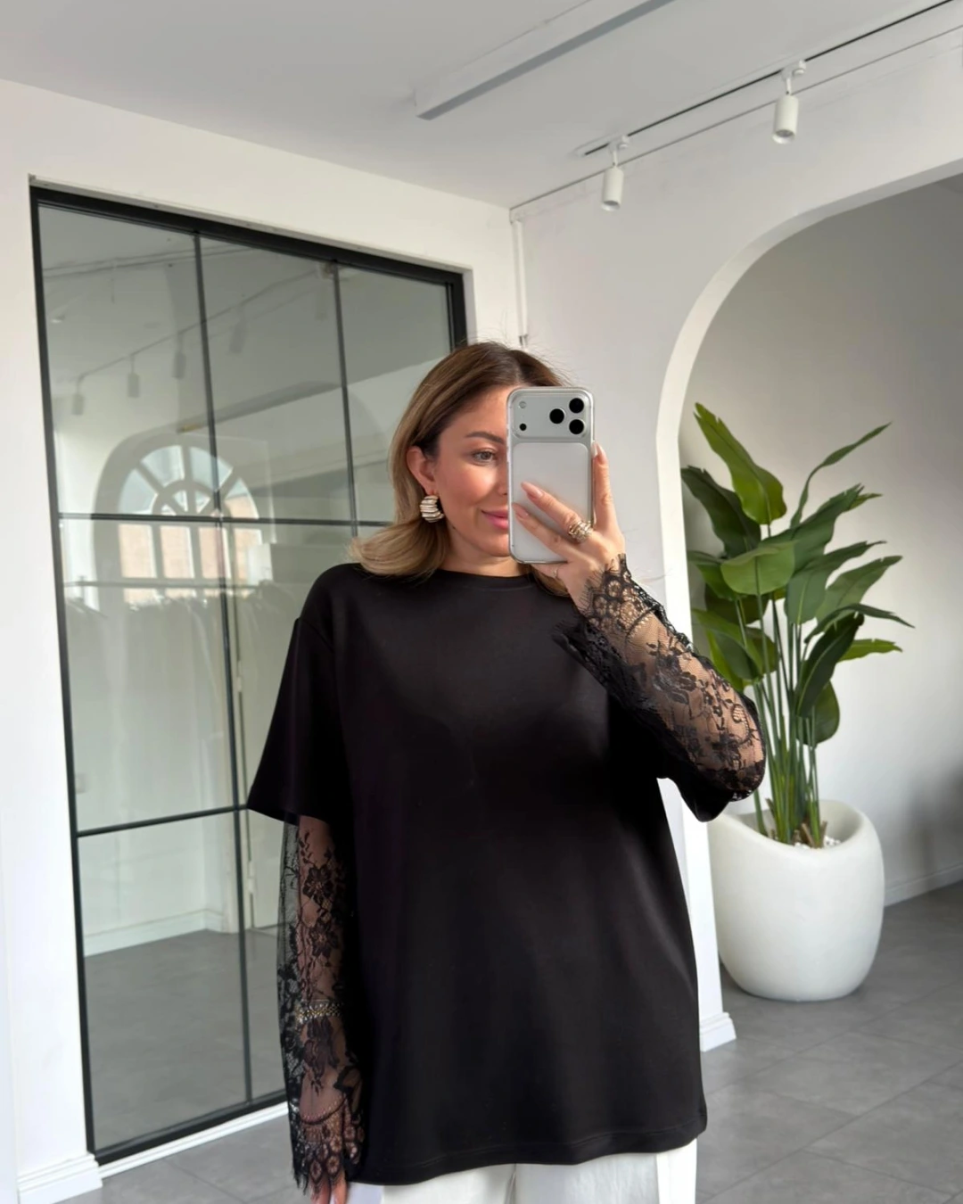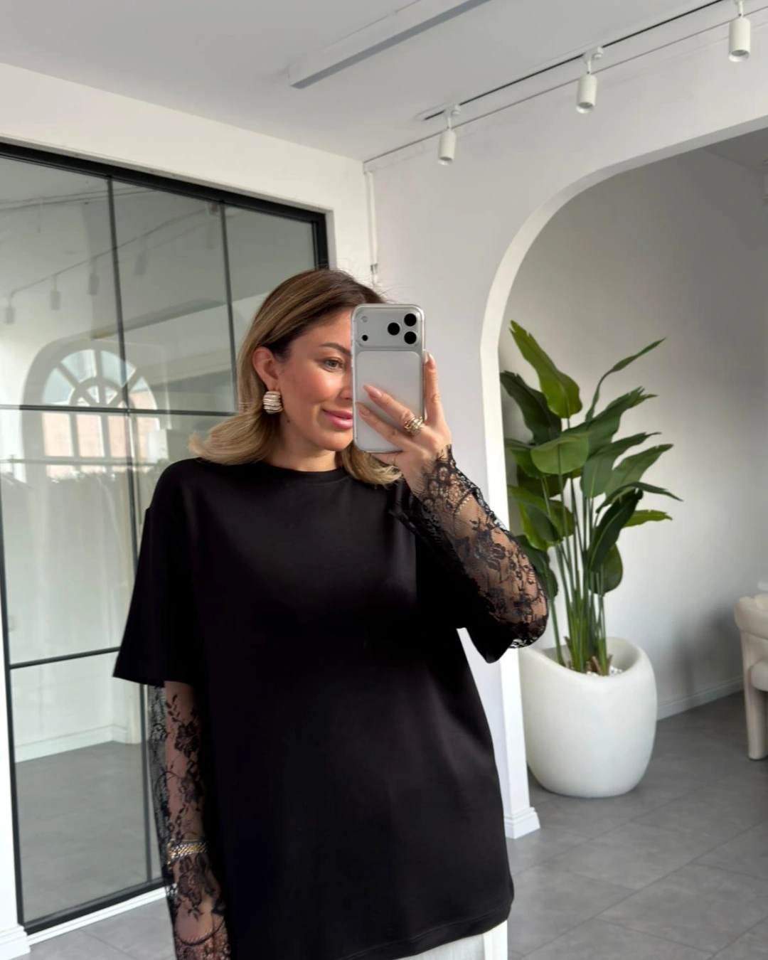 SİYAH KOLLARI DANTEL DETAYLI T-SHIRT 1049
