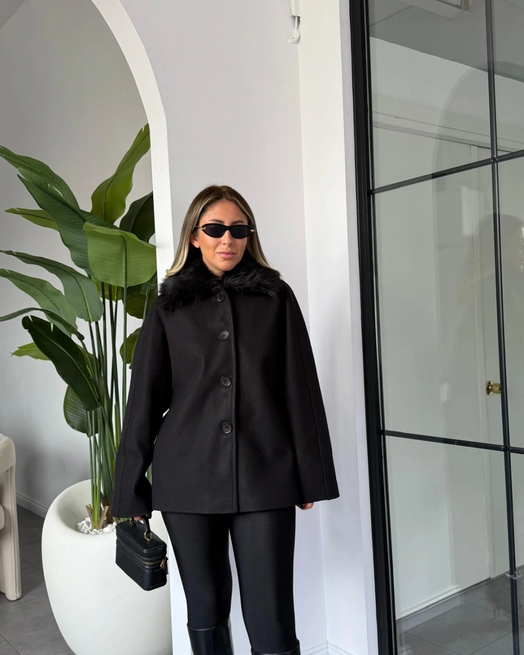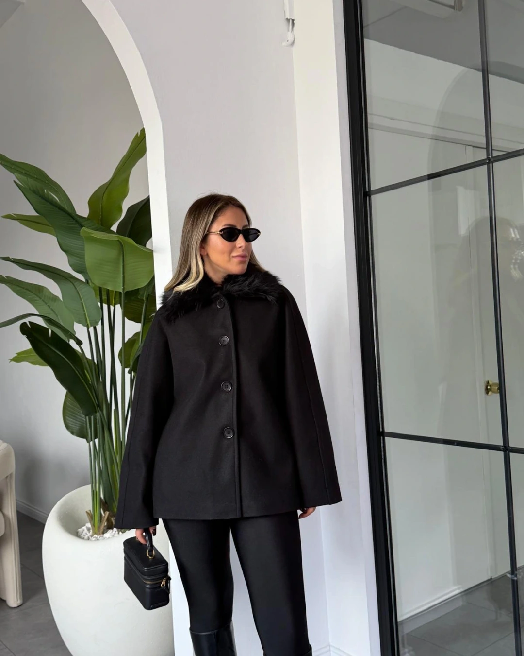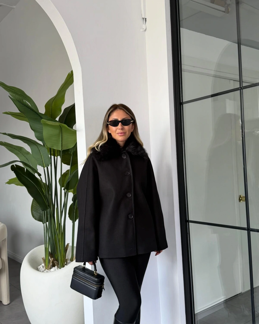SİYAH KÜRK YAKA DÖRT DÜĞMELİ KAŞE KABAN