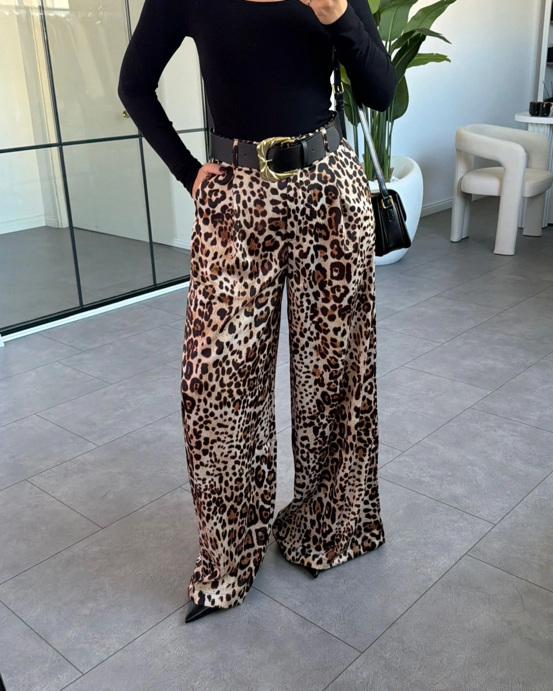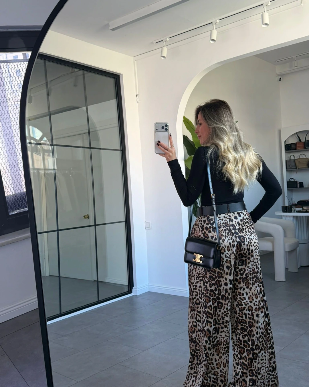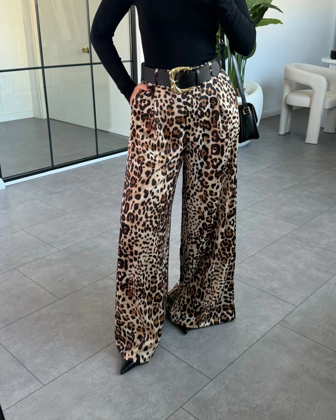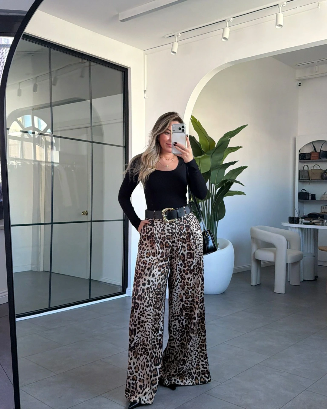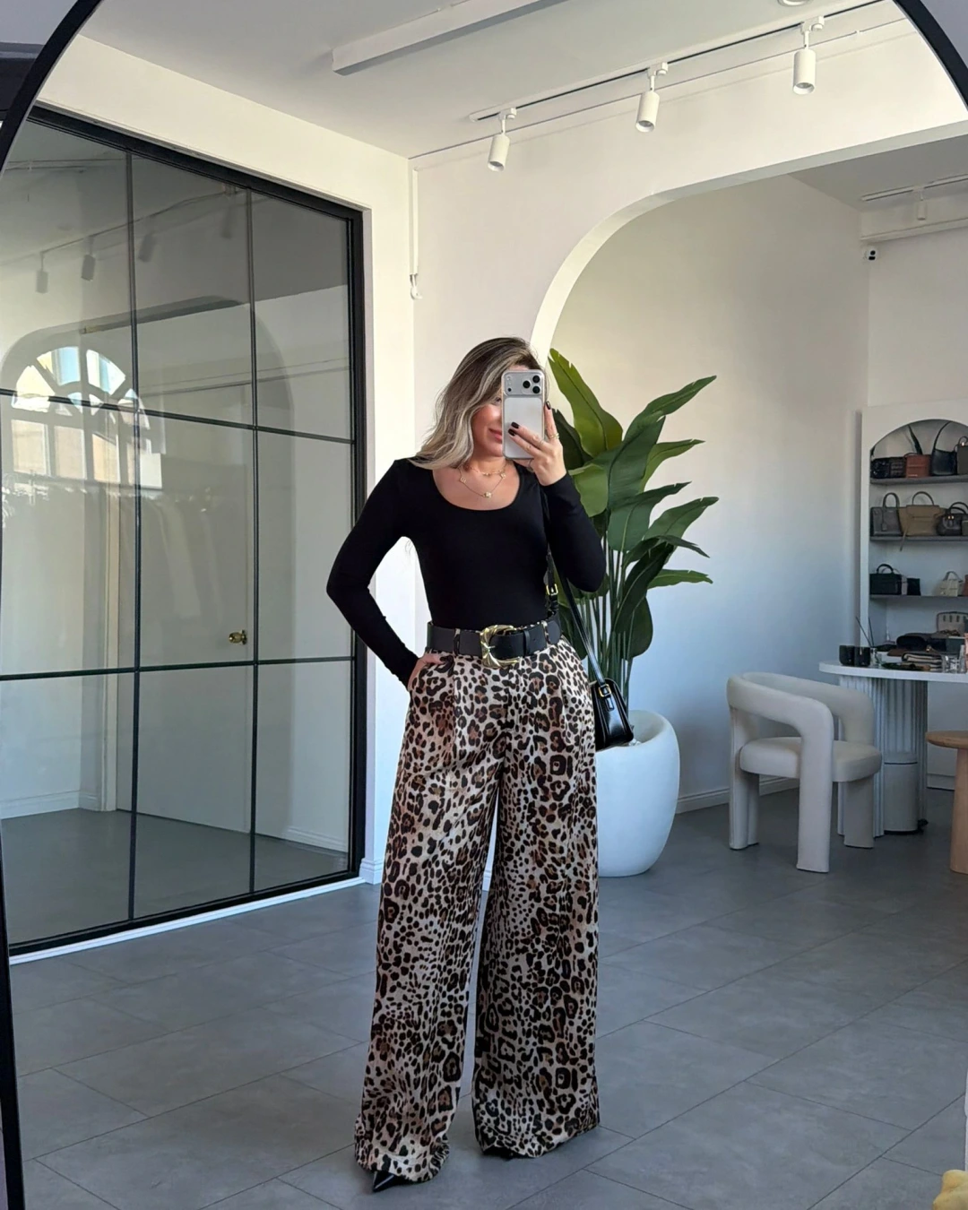 SİYAH LEOPAR DESEN KEMERLİ SATEN PANTOLON