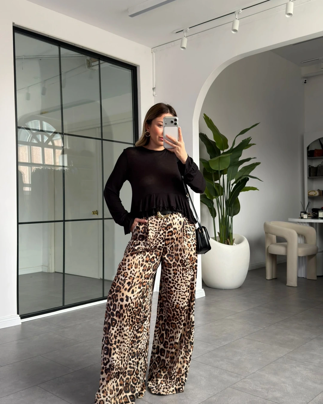 SİYAH LEOPAR DESEN KEMERLİ SATEN PANTOLON