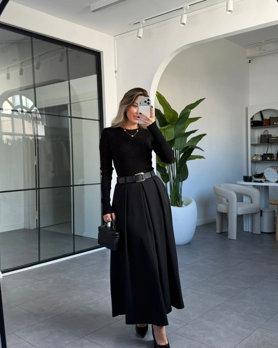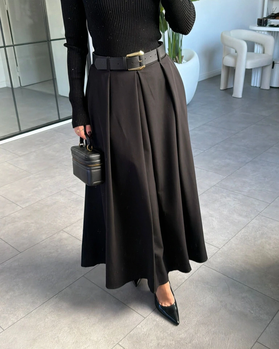 SİYAH PİLİSELİ KEMERLİ ETEK