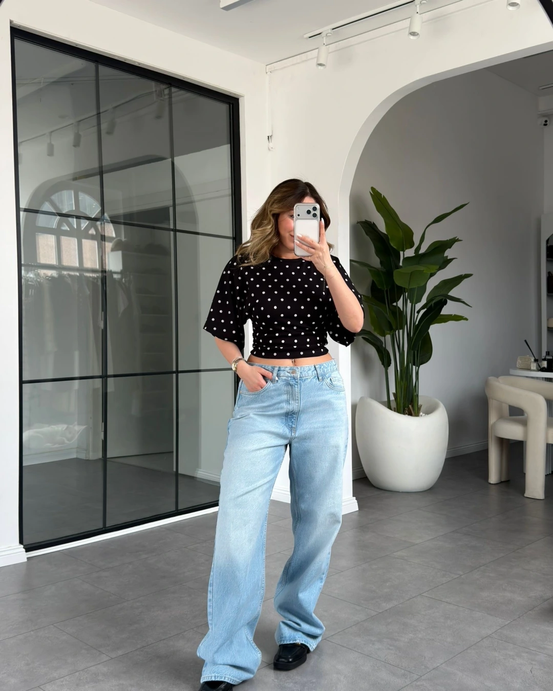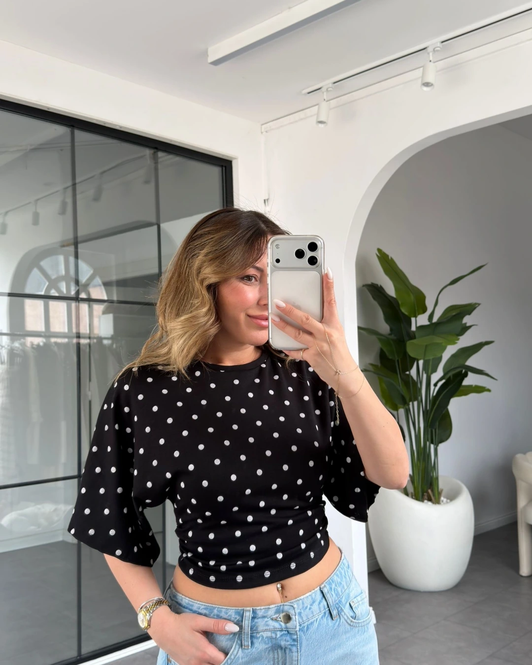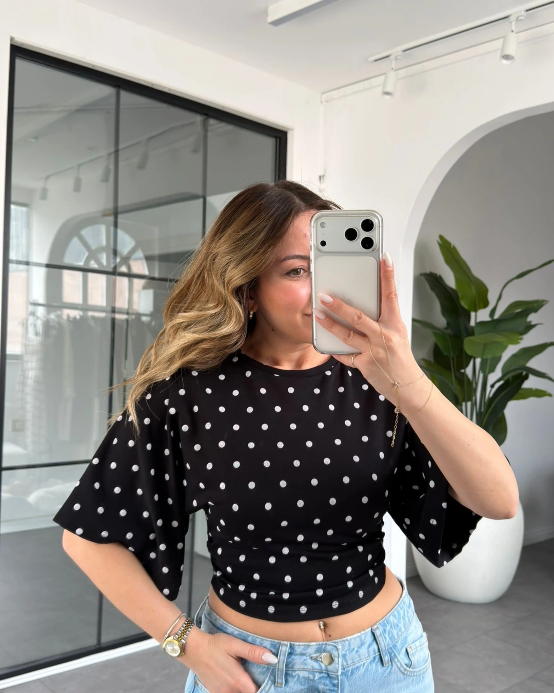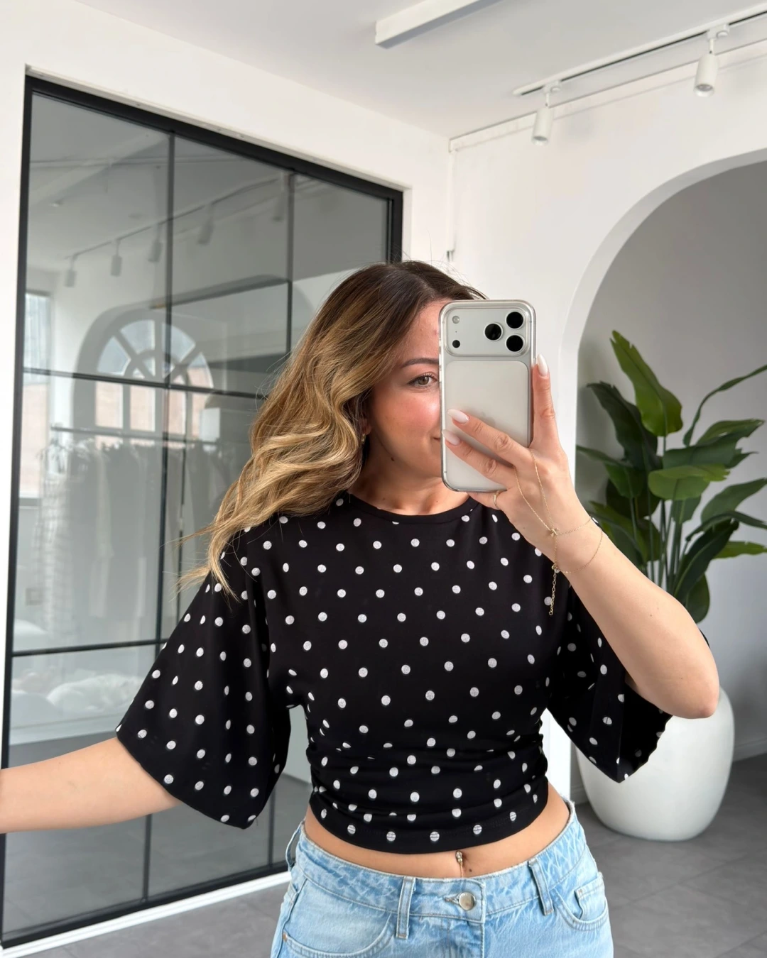 SİYAH PUANTİYE DESEN BEL BÜZGÜLÜ T-SHİRT 1105