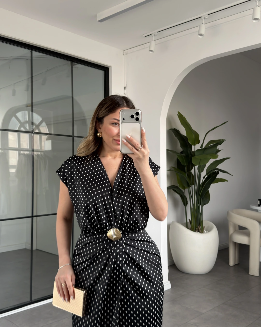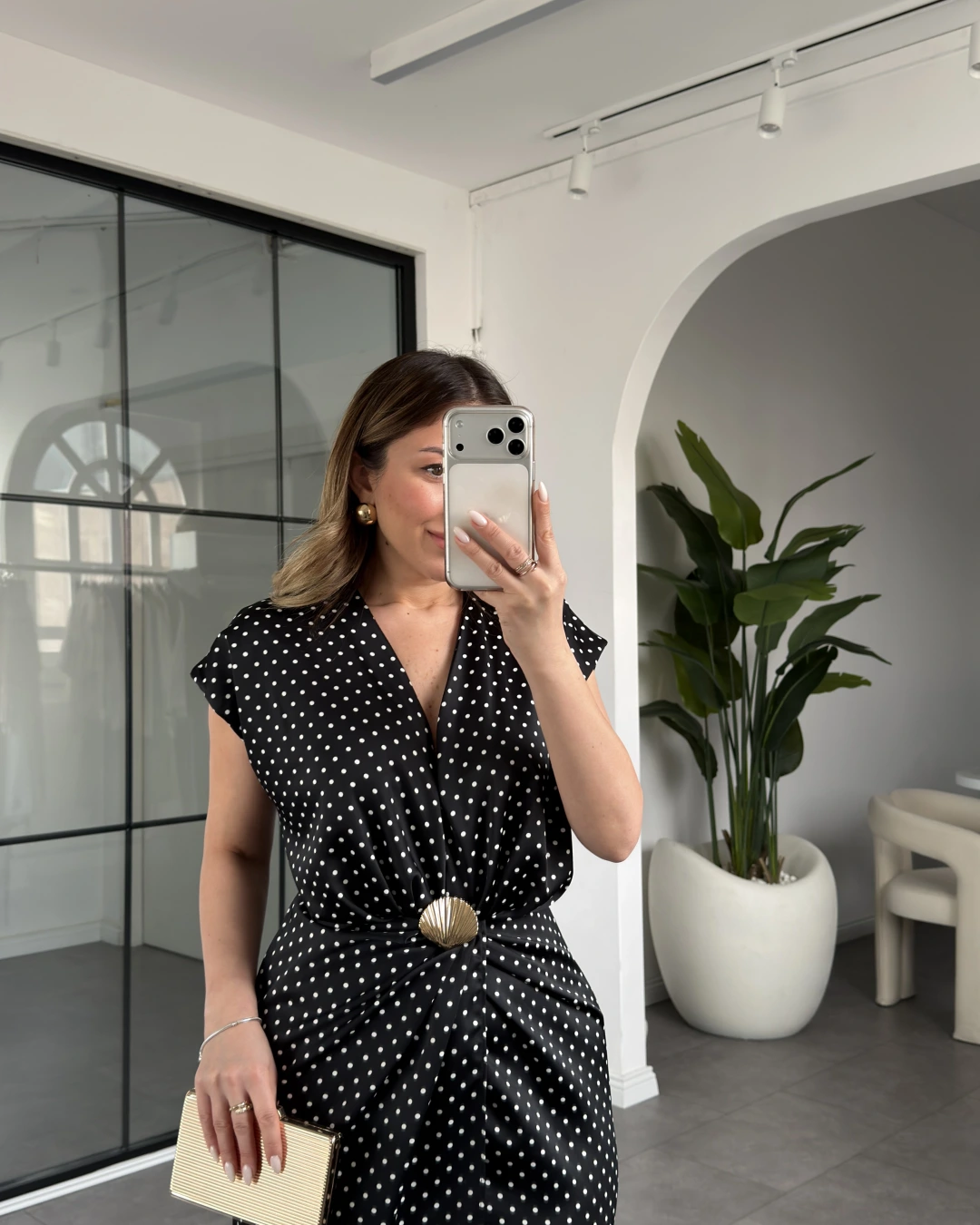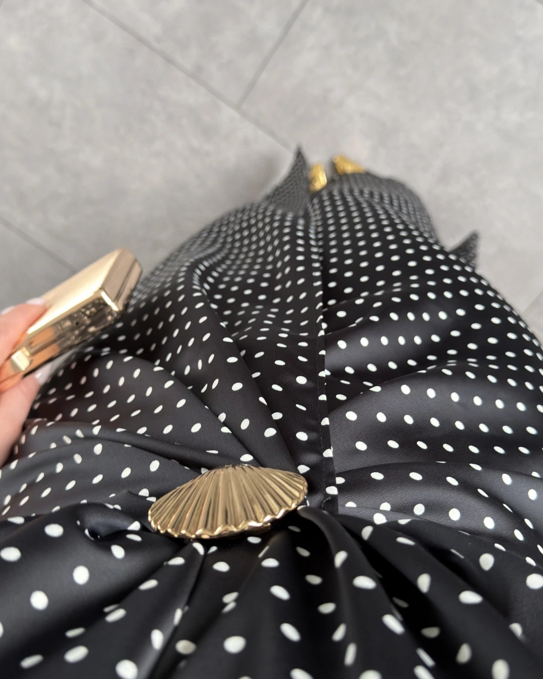SİYAH PUANTİYELİ AKSESUAR DETAYLI SATEN ELBİSE