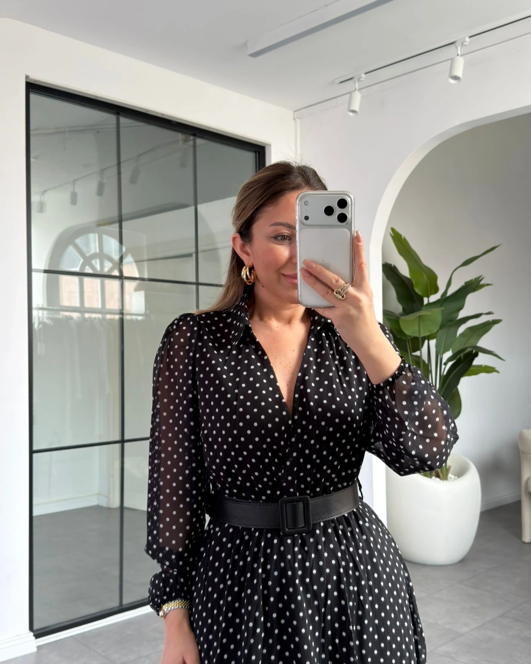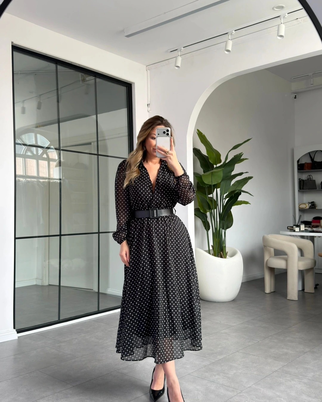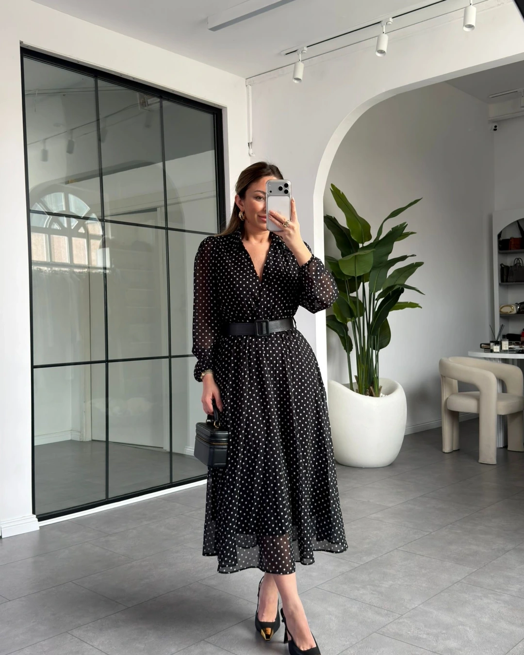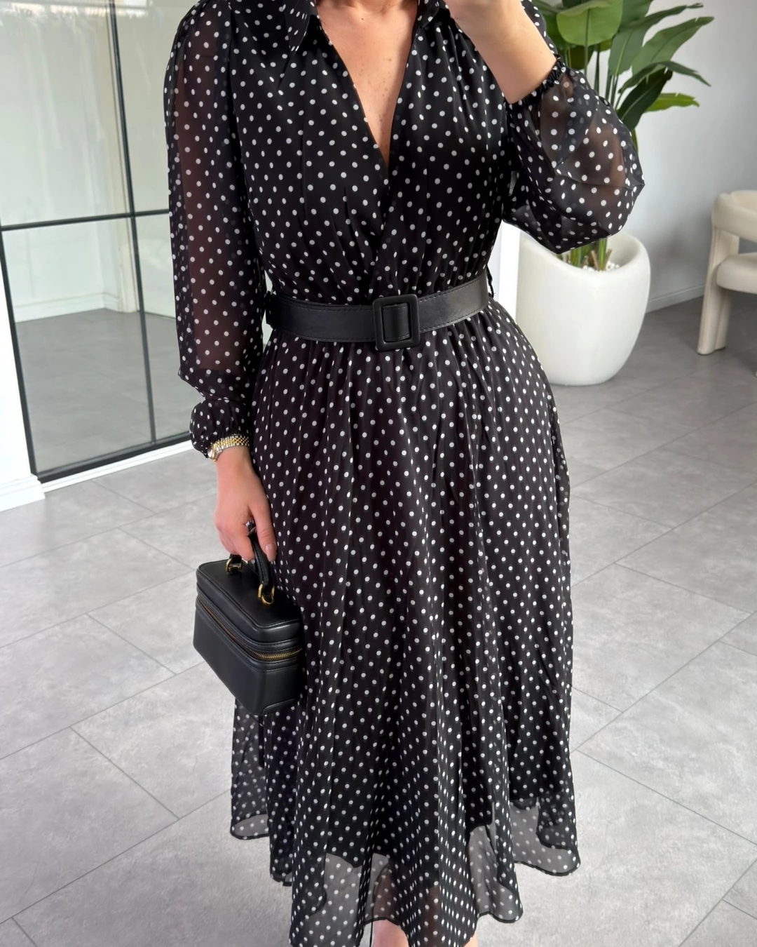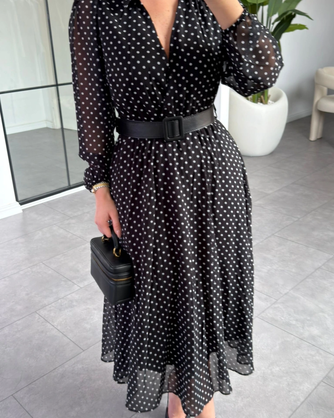 SİYAH PUANTİYELİ KEMERLİ ELBİSE