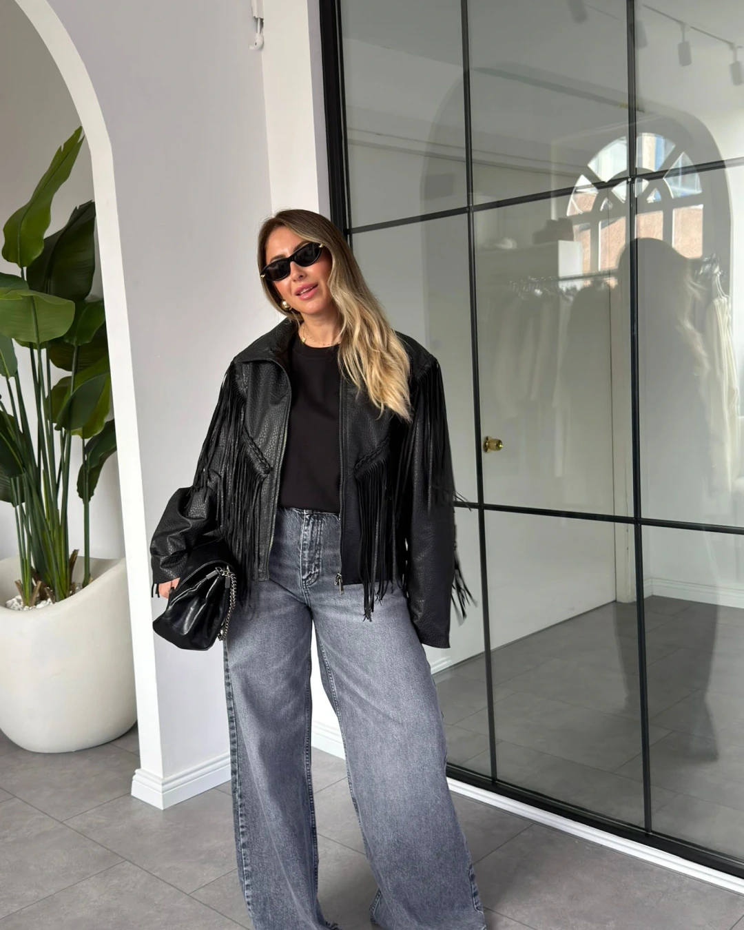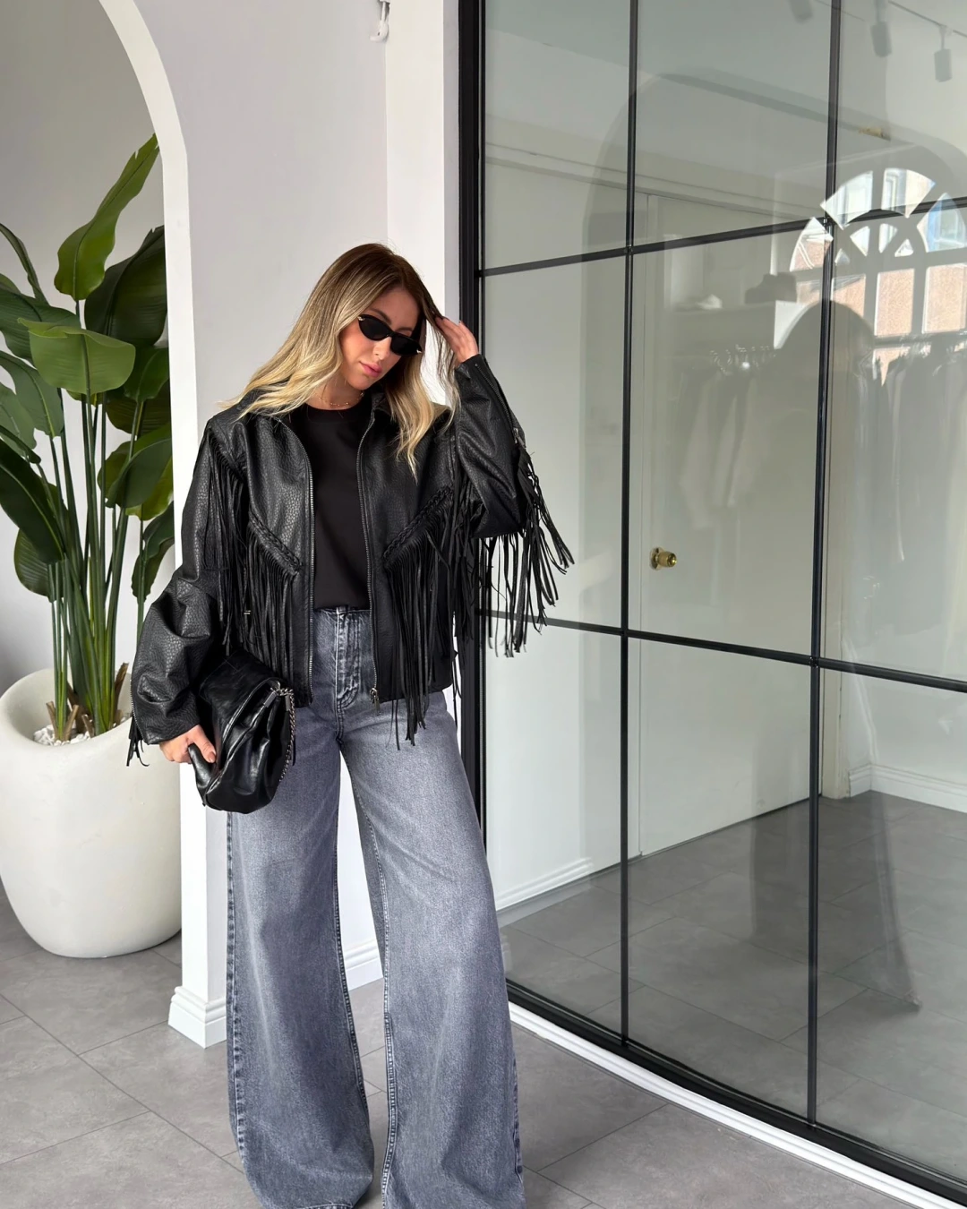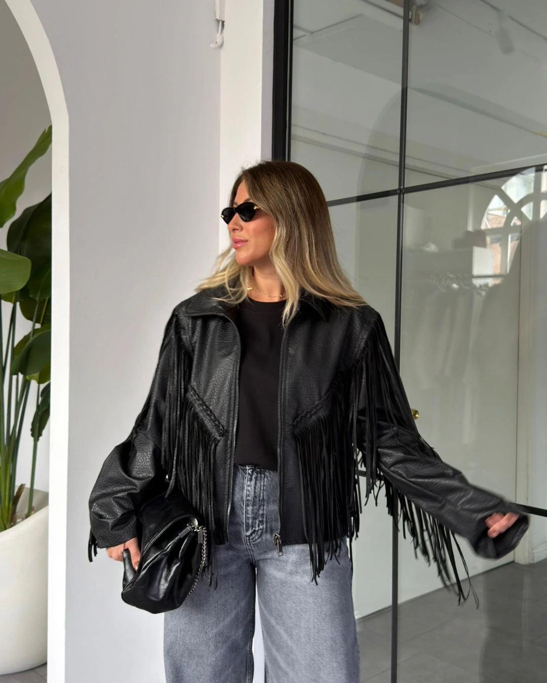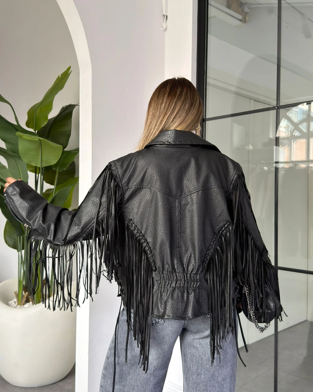 SİYAH SAÇAKLI TASARIM DERİ CEKET