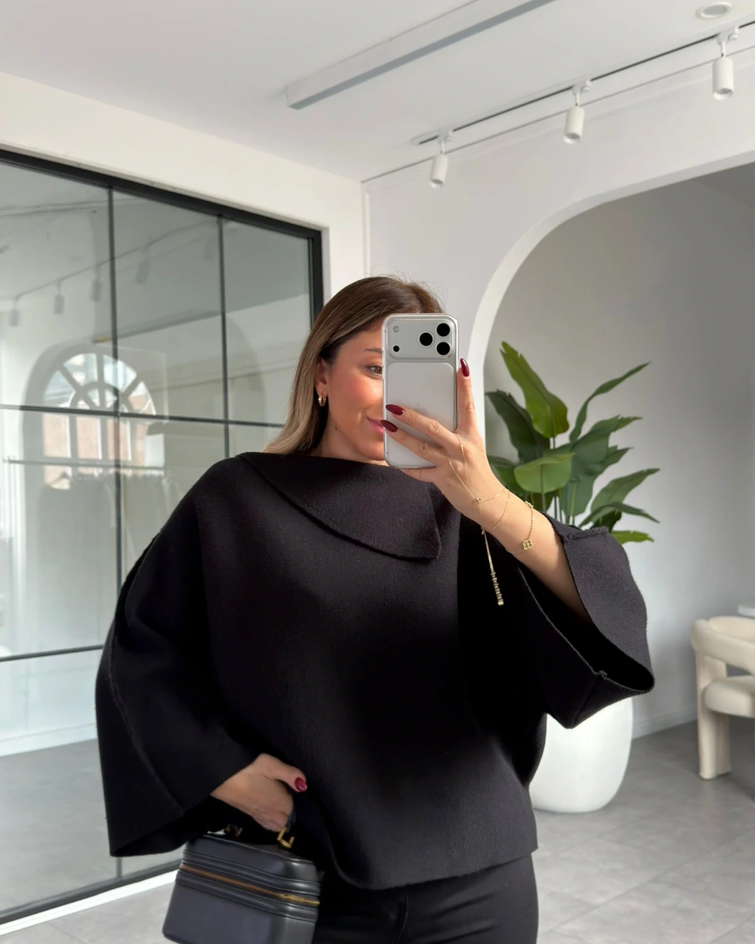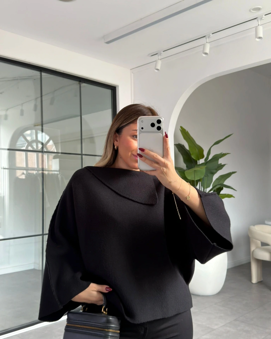 SİYAH ŞAL YAKA YARASA KOL TRİKO KAZAK