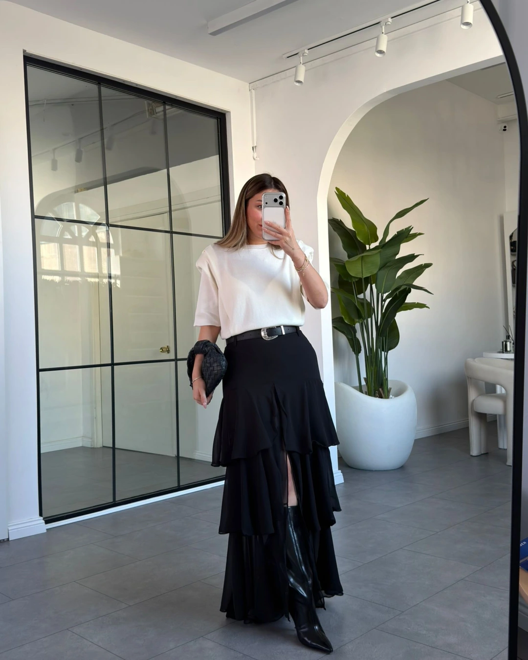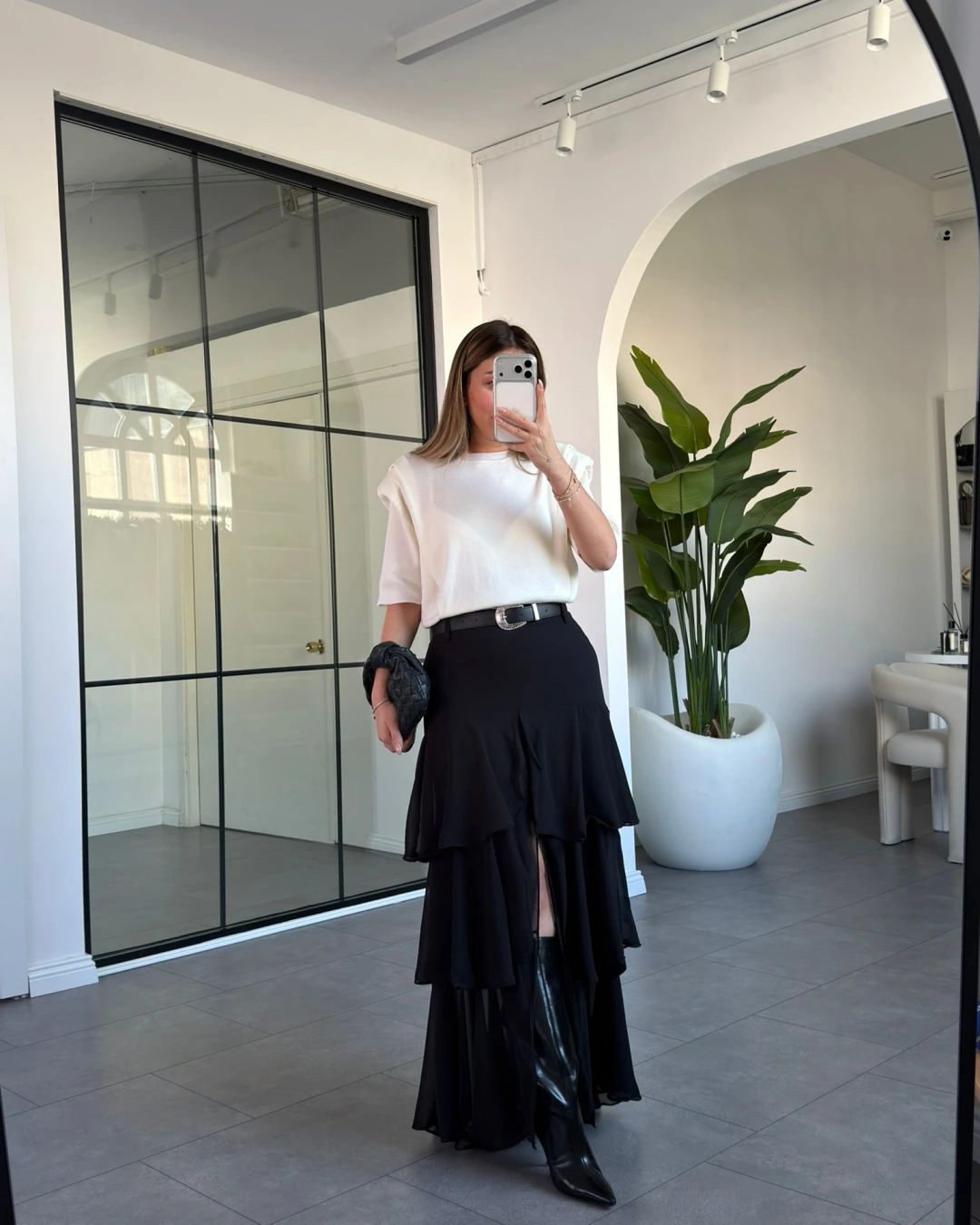 SİYAH ŞİFON KAT KAT KEMERLİ ETEK