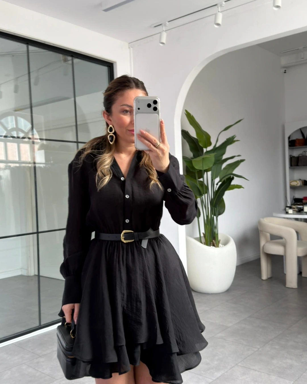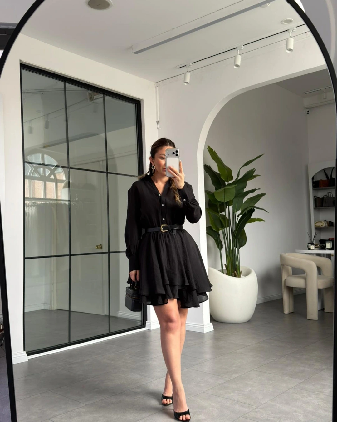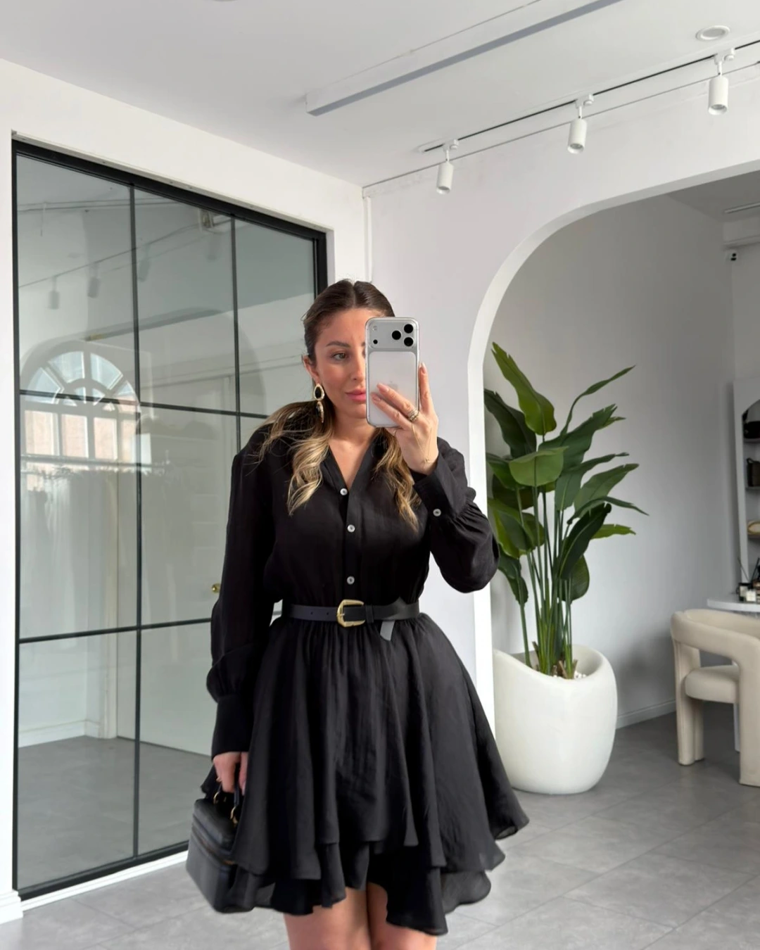 SİYAH TASARIM VOLANLI ELBİSE 12417