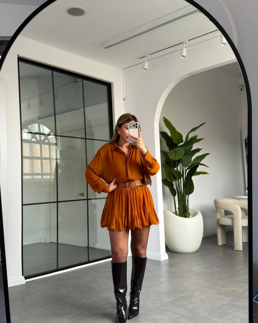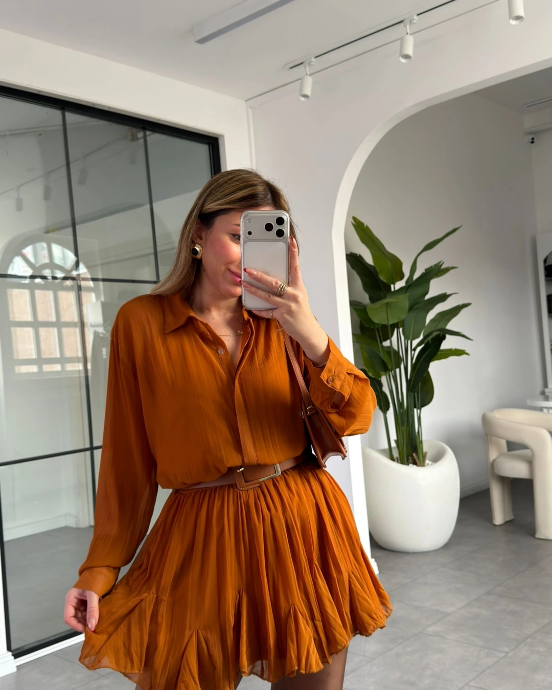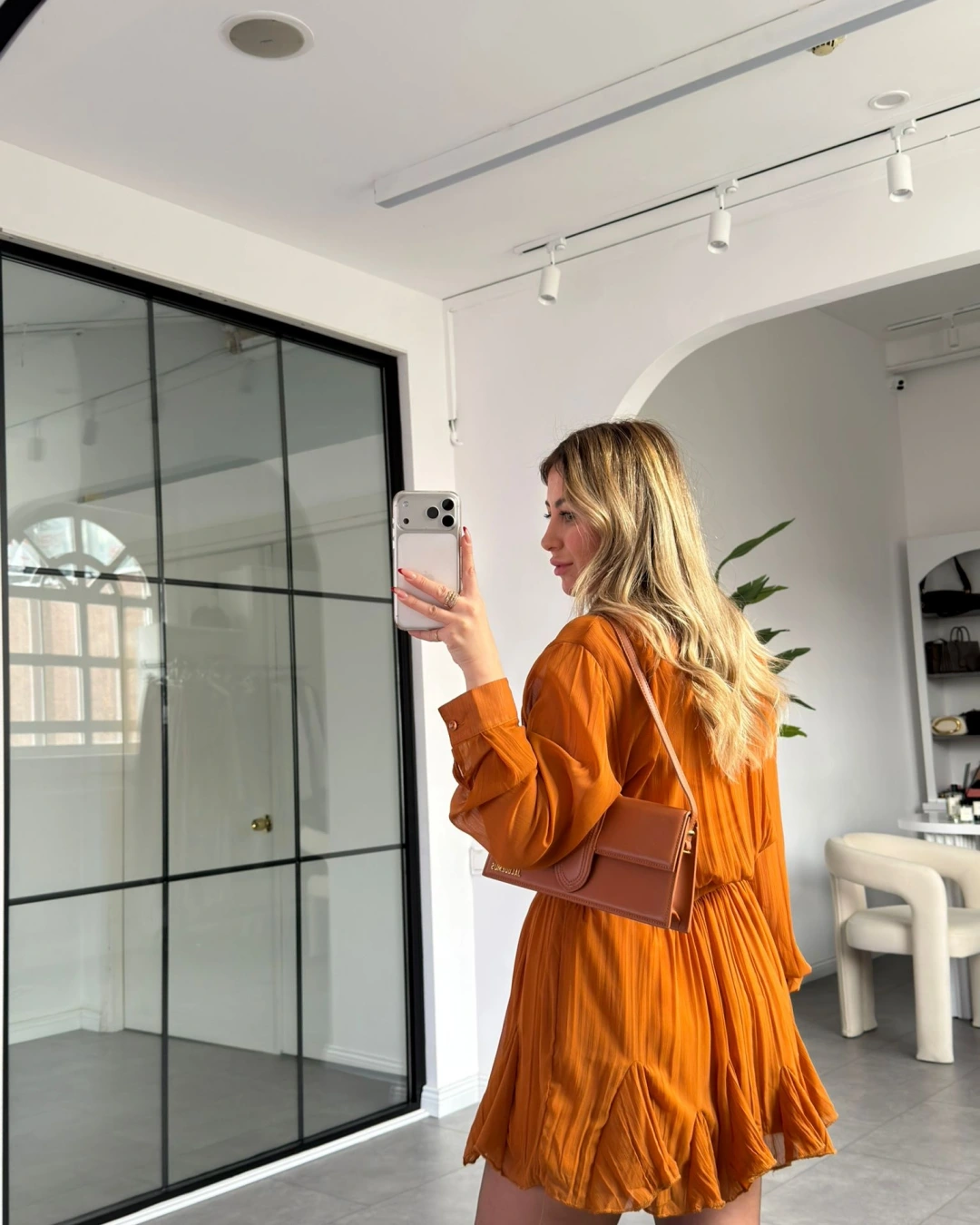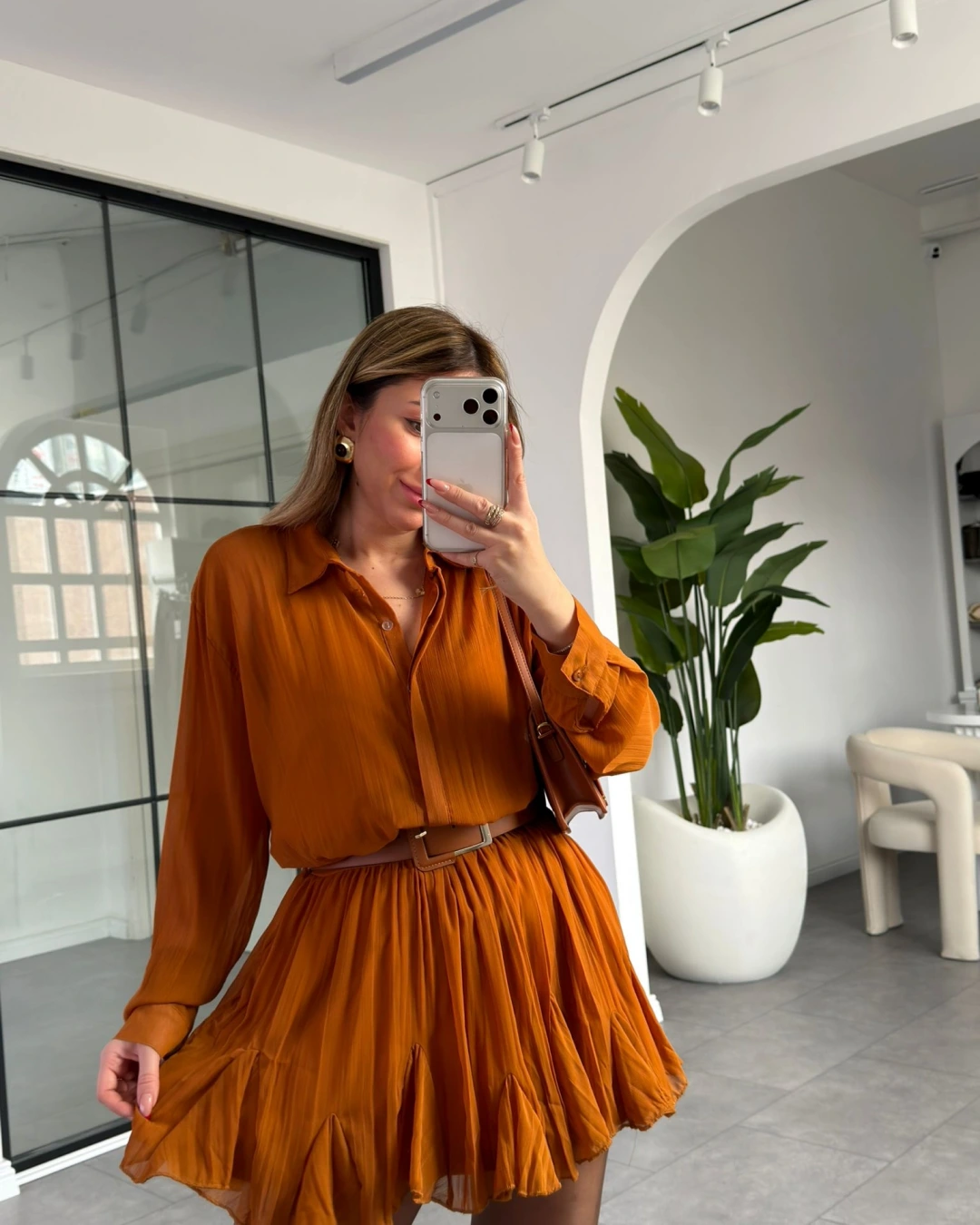TARÇIN KEMERLİ PİLİSELİ ŞİFON ELBİSE