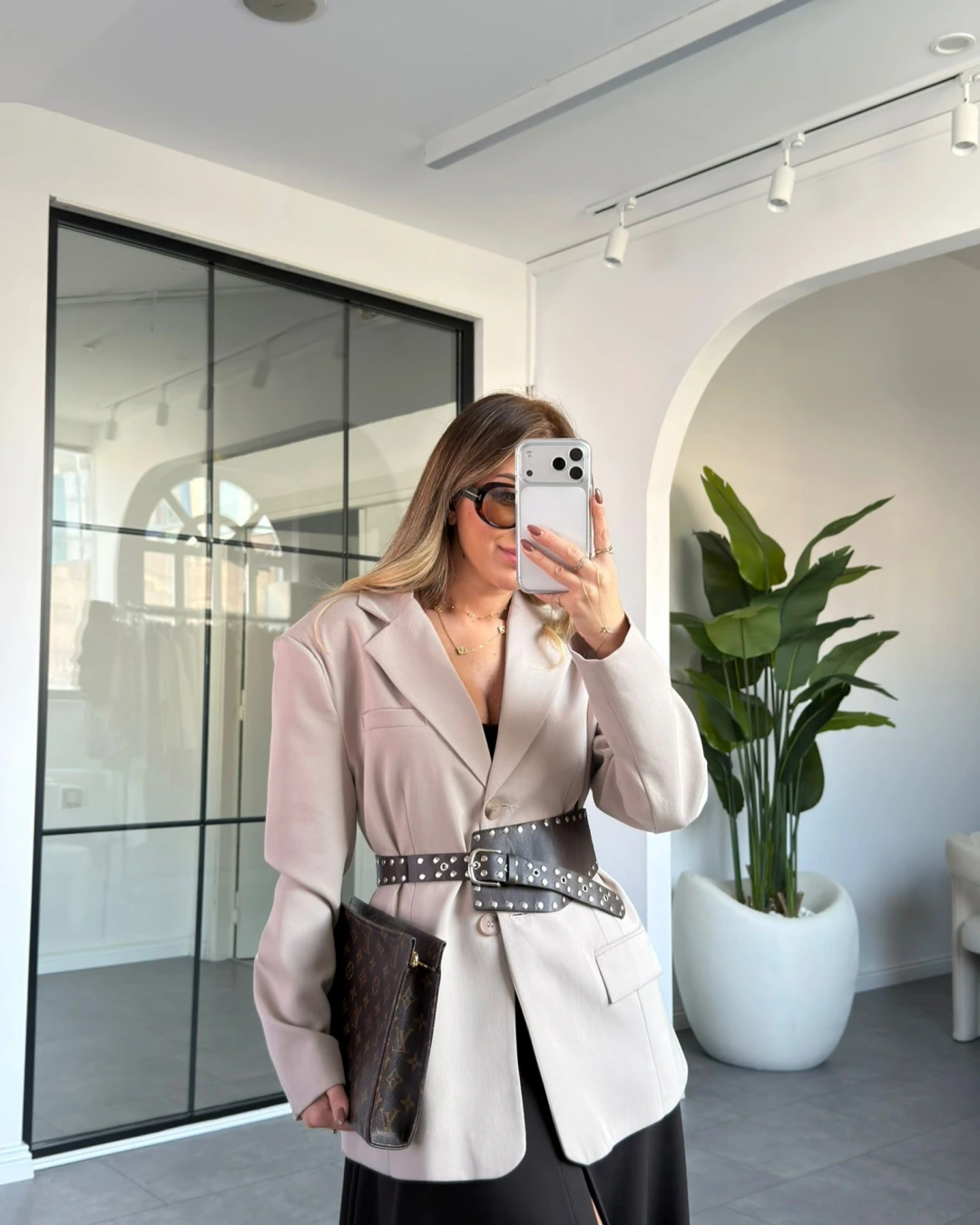KAHVE KEMERLİ BLAZER KAŞE CEKET