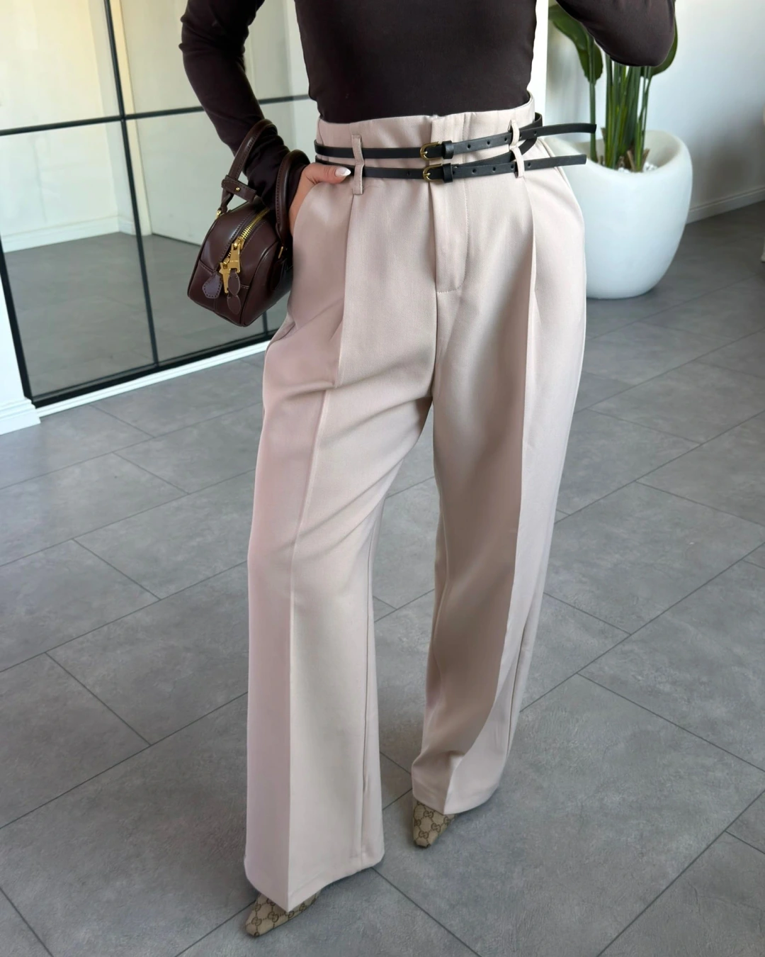 TAŞ ÇİFT KEMERLİ PİLELİ PANTOLON