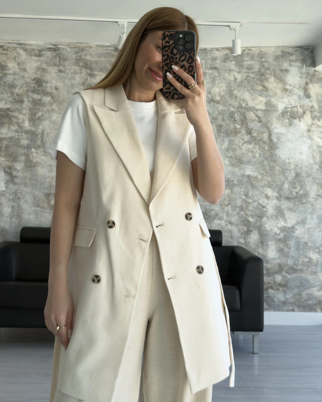 Taş Ham Keten Kruvaze Kuşaklı Yelek